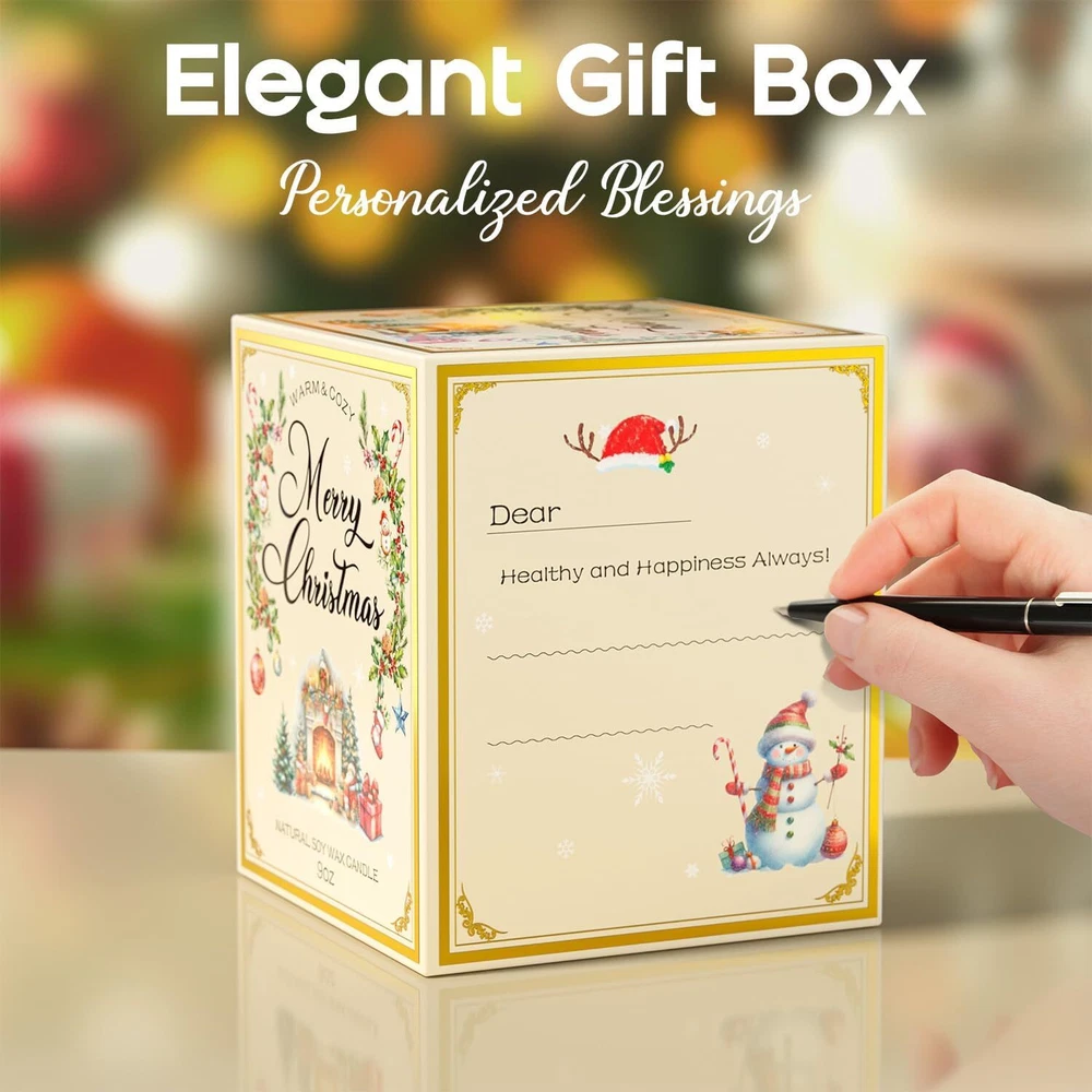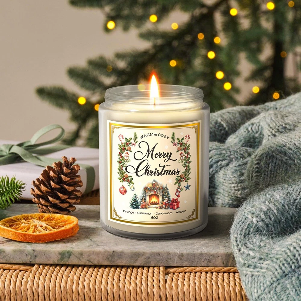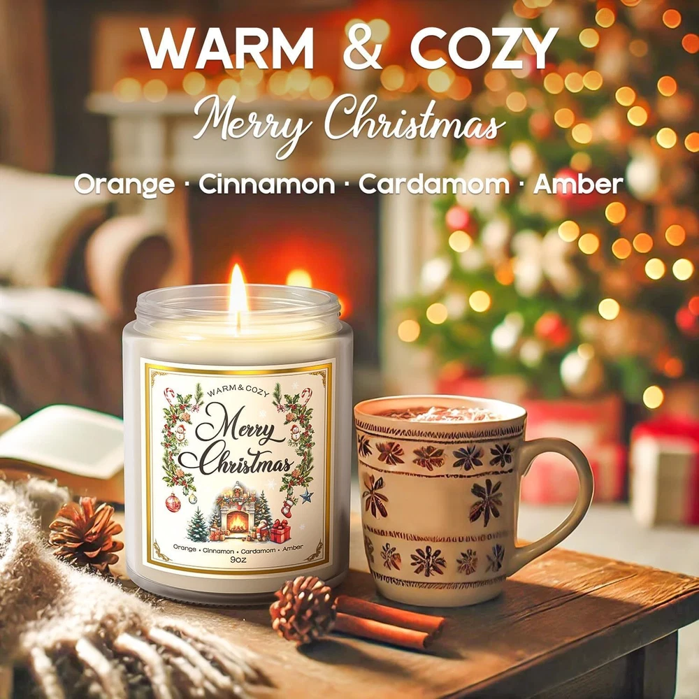 Christmas Candles, VEGISHINE 9oz Scented Merry Candle Product Details Product Dimensions : 3.5 x 3.5 x 4.5 inches; 4.8 ounces Item model number : VEGISHINEUS001 Manufacturer : VEGISHINE Country of Origin : China Brand: VEGISHINE Color: Merry Christmas Candle Product Dimensions: 3.5"W x 4.5"H Item Weight: 0.3 Pounds Number of Items: 1 Scent: Orange&Cinnamon&Cardamom&Amber Are Batteries Included: No Indoor/Outdoor Usage: Outdoor, Indoor Specific Uses For Product: Relaxation, Home Fragrance, Aromatherapy, Celebration, Decoration Shape: Round Christmas Candle Gift: VEGISHINE Christmas Candle, fragranced with the cozy scent of cinnamon spice and warm orange, adorned with festive red and green accents. Featuring "Merry Christmas" on the candle, it’s the perfect gift to spread joy, warmth, and holiday cheer. Warm Christmas Scent: VEGISHINE Christmas candle has a cozy scent that mixes the freshness of orange, the warmth of cinnamon, the spice of cardamom, and the sweetness of amber. When lit, it fills the room with a festive and comforting aroma, making your space feel warm and inviting for the holidays. Christmas Gift for Women: Thoughtfully designed packaging enhances the beauty of the candle, making it an elegant addition to any Christmas décor, while creating a cozy and inviting holiday atmosphere. Long-Lasting Burn: Hand-poured with premium ingredients, this Christmas candle burns for over 60 hours, allowing the holiday spirit to linger throughout the season. Versatile Use: Suitable for any room in the home, from the living room to the dining room, bedroom, or kitchen. This candle is the perfect Christmas gift for women, men, friends, family, loved ones, or even as a treat for yourself during the festive season.