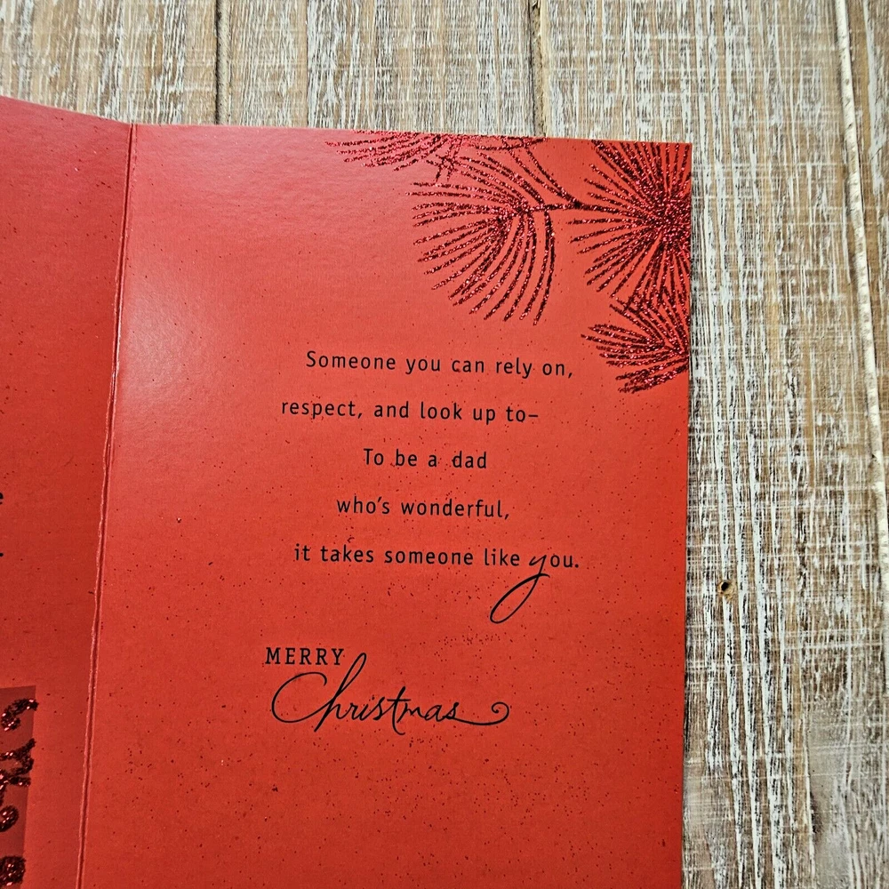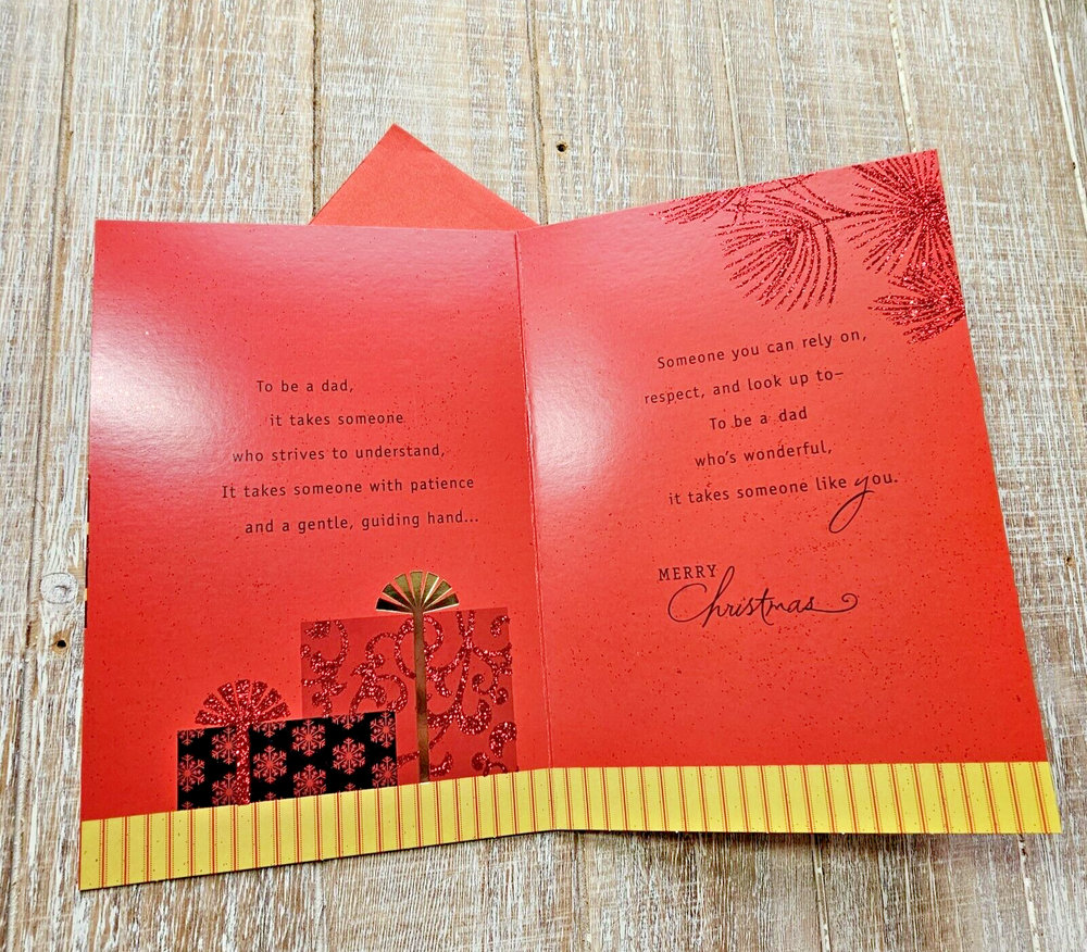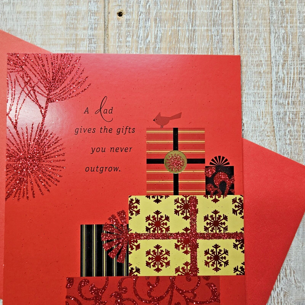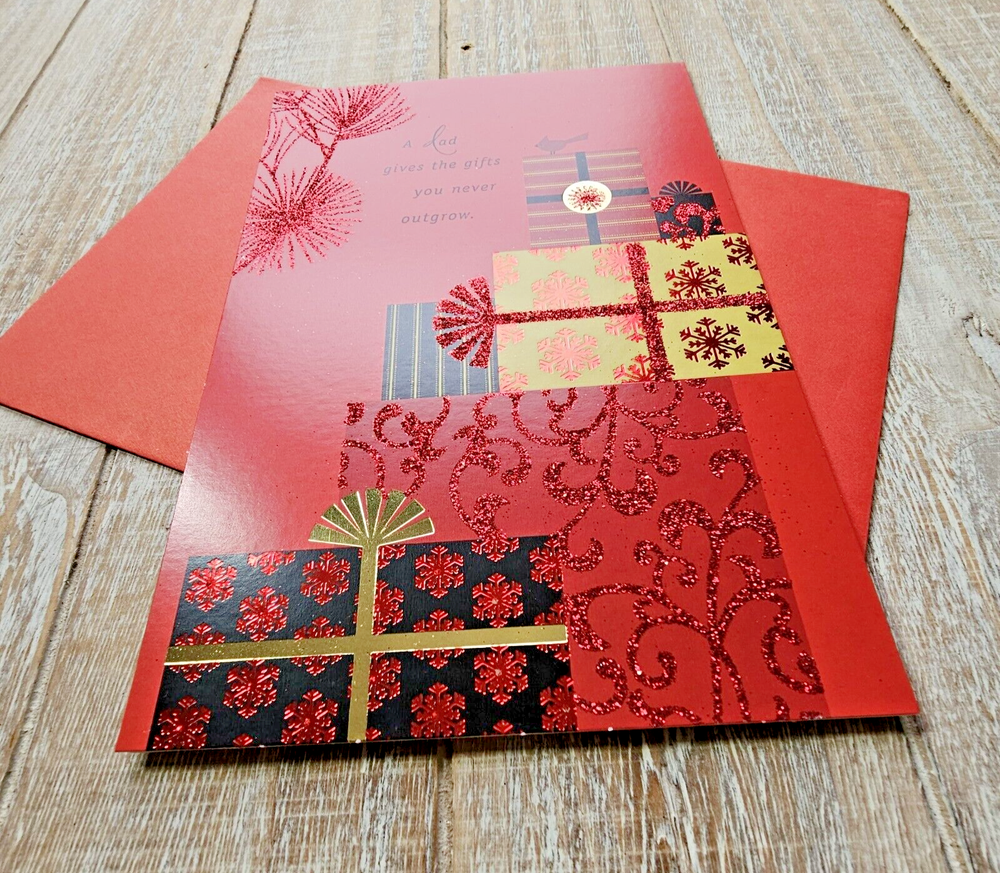 Hallmark Christmas Greeting Card 6x8 For Dad Black Red Glitter Gifts Presents Full Size 5.5 x 8 inch card with matching envelope Condition: new Search thousands of cards for all occasions in our eBay Store. **This items ships with limited tracking via USPS First Class.** **The standard time is 5-7 business days for delivery but it may take up to 10 days.**