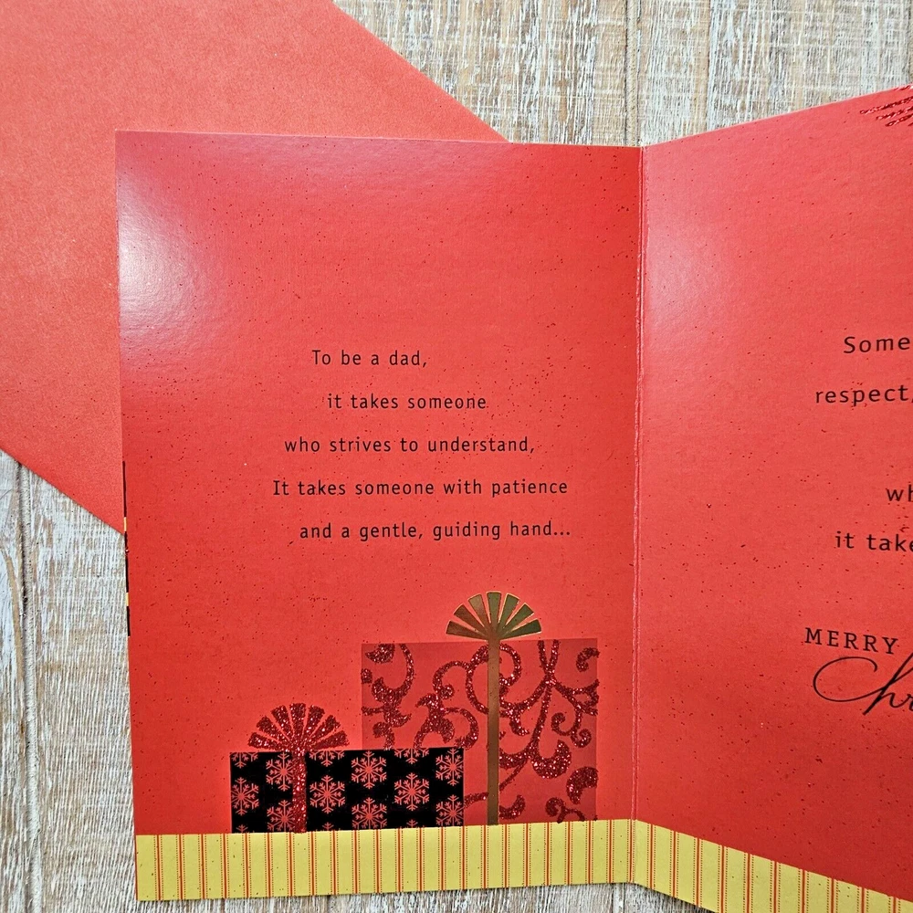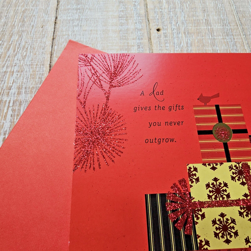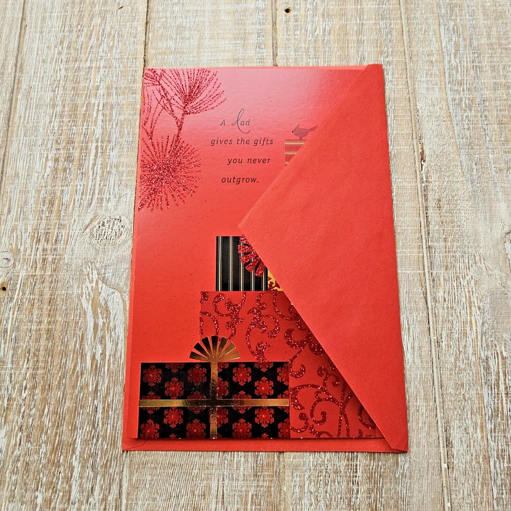 Hallmark Christmas Greeting Card 6x8 For Dad Black Red Glitter Gifts Presents Full Size 5.5 x 8 inch card with matching envelope Condition: new Search thousands of cards for all occasions in our eBay Store. **This items ships with limited tracking via USPS First Class.** **The standard time is 5-7 business days for delivery but it may take up to 10 days.**