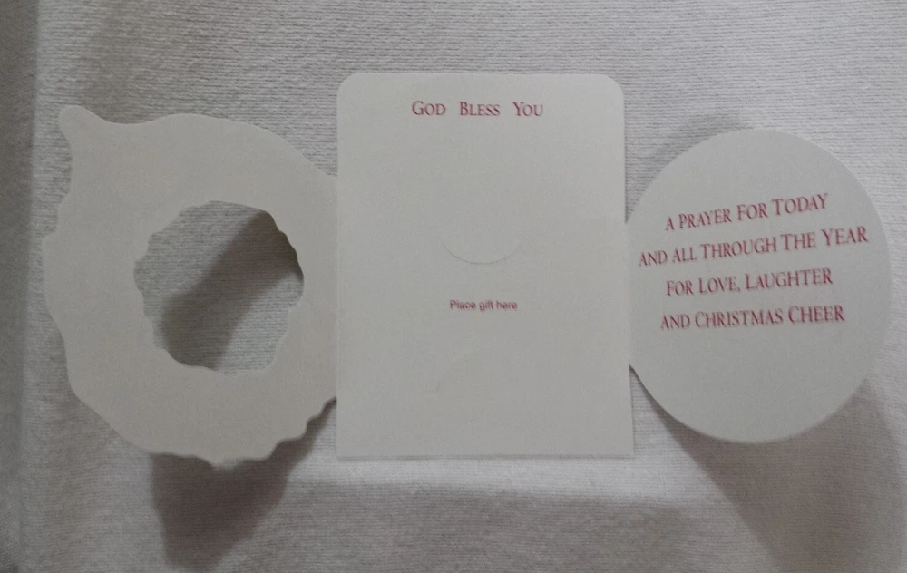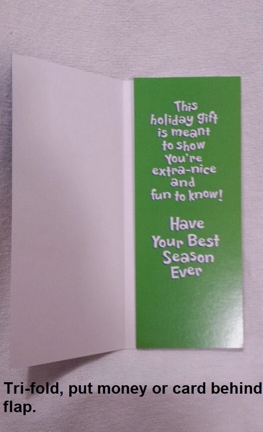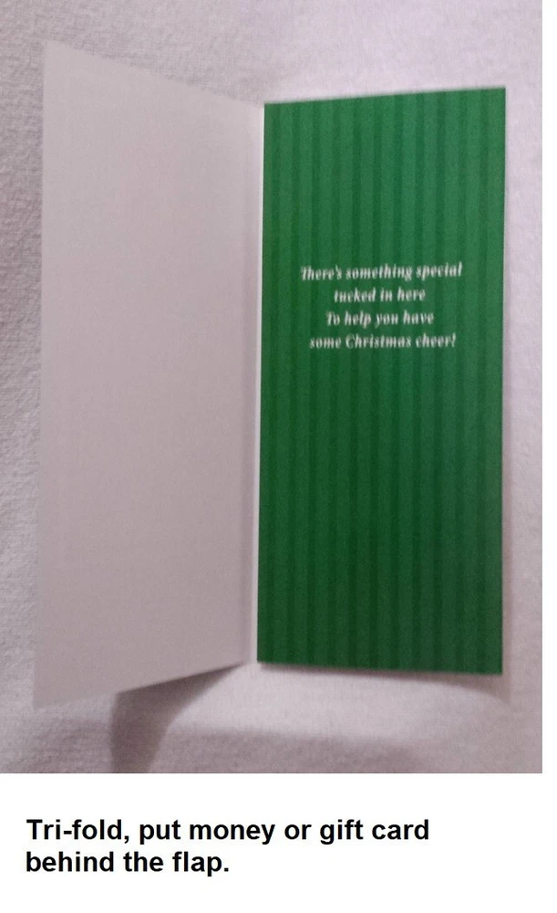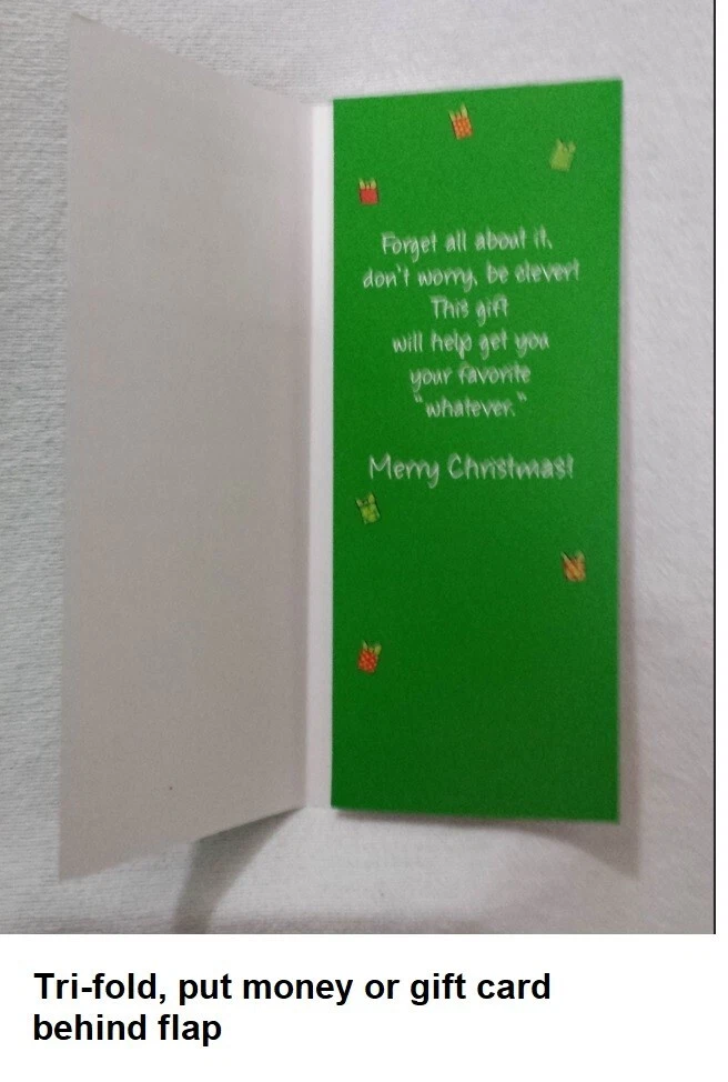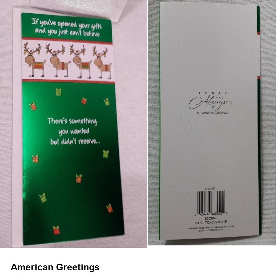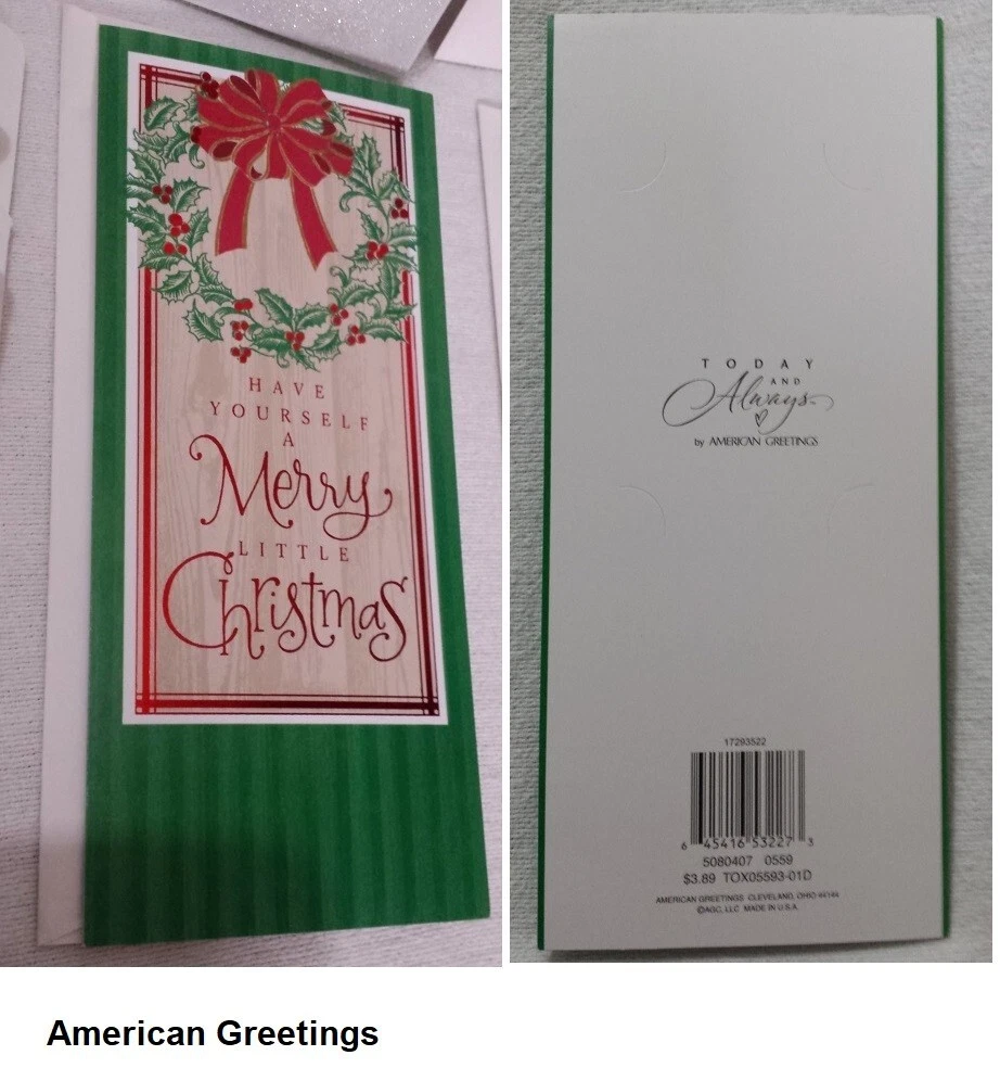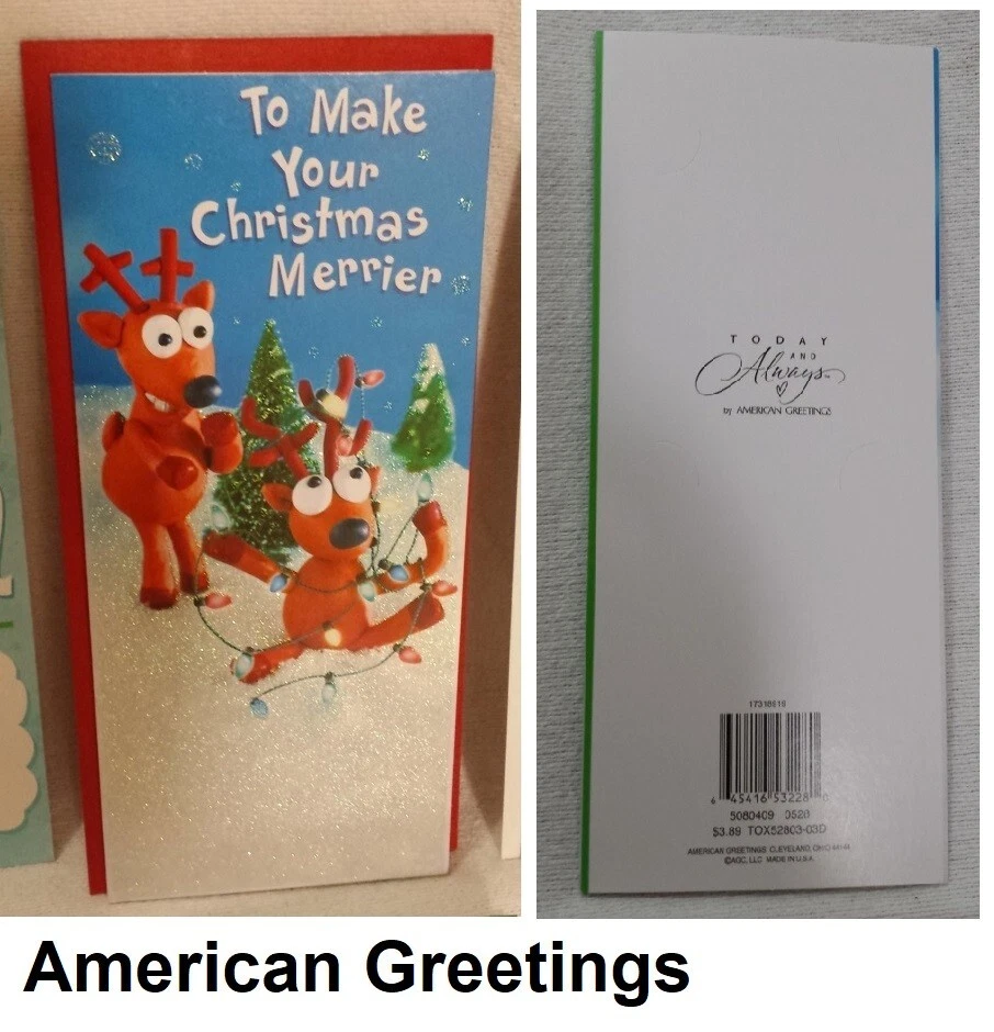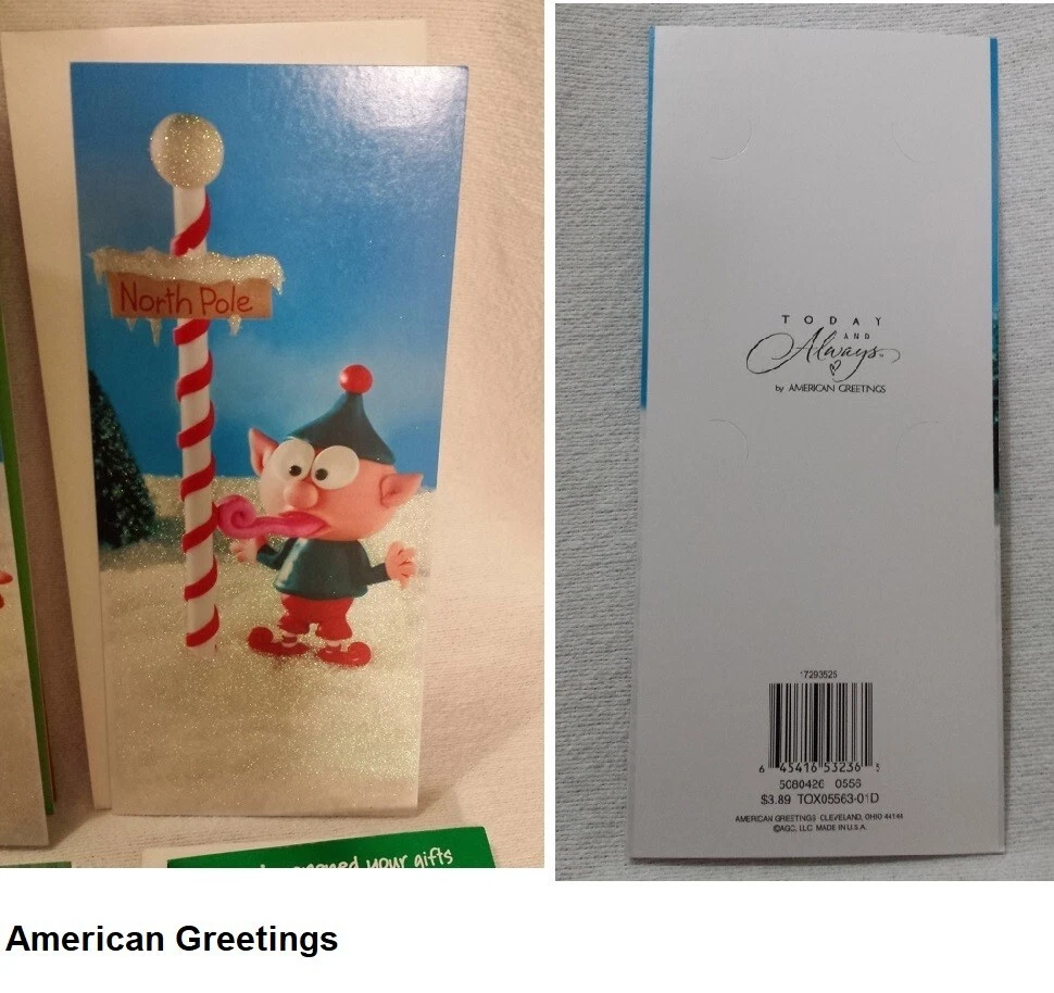 Christmas Cards Money/Gift Card Holder Lot of 6 cards with Envelopes Mixed Get into the festive spirit with this set of 6 Christmas greeting cards that comes with envelopes. Perfect for all occasions, these cards are suitable for holding money or gift cards. The contemporary design features an all-over multicolor pattern that will surely bring a smile to the recipient's face. Crafted in the United States with paper production technique, these folded cards are a mix of different brands and sizes. They are suitable for multipurpose use and are not antique or vintage. Ideal for anyone who loves contemporary designs, these cards are sure to be a hit this Christmas season. Christmas Cookies Card (#1)has glittered letters on the front. Reindeer Card (#2)has glittered snow area on the front. North Pole with elf Card (#3) has glittered snow area on the front. Reindeer Card (#5) has reflective green on the front. Wreath Card (#6) has reflective red on the front. Most made in the USA. Smaller card made in Mexico. Fast shipping from Orlando.