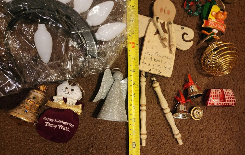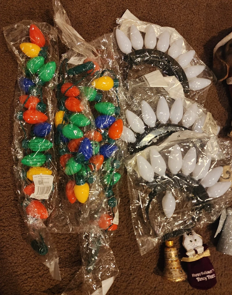 Pre Owned. Like New Condition. See Pics. Includes: 3 Set of Large Bulb Color X-mas Lights (New) 3 Sets of White Headress Lights (New) 1 Winter Wonder Lane Dachshund Dog Statue With Santa Outifit 10x12" (1 Nail on Paw Broke Off) 1 Wood Angel 2 Mini Silver Bells 1 Christmas Reef Keychain 1 Silver Glitter Angel 1 Speedy Gonzales Looney Tunes Ornament 1 Fancy Feast Cat Ornament 1996 1 Red Purse Fragile Ornament 1 Gold Bell Fragile Ornament 1 Small Jingle Bell 1 Springy Bulb With Bell Inside Ornament