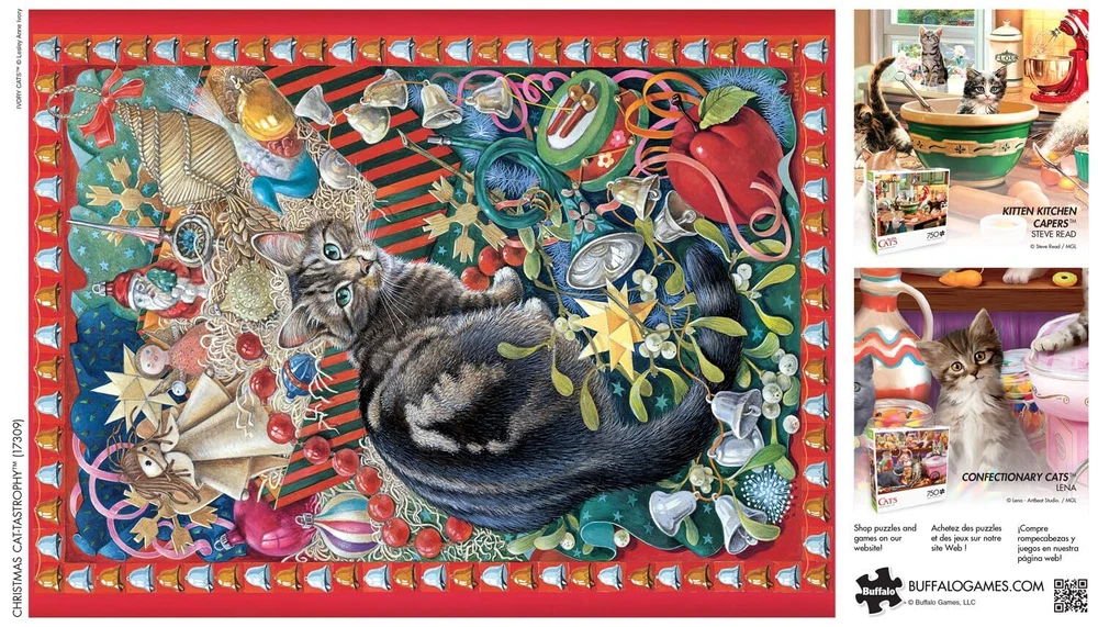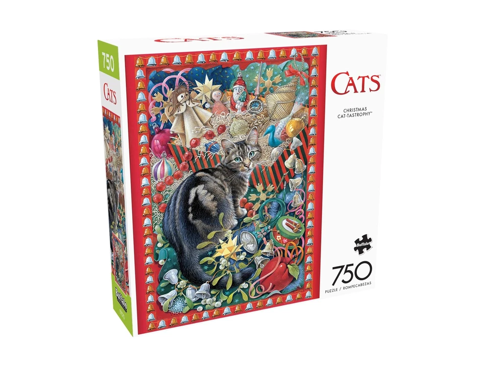 This 750-piece jigsaw puzzle, Christmas Cat-tastrophy, is part of the Cats Series by . The puzzle image features mischievous (but adorable) feline getting into the holiday decorations! Every jigsaw puzzle is manufactured from recycled puzzle board. A precision cutting technique guarantees that every piece will fit soundly with the company's signature Perfect Snap™. A bonus puzzle poster is also included so that you have a handy reference of what the completed puzzle should look like while you put yours together. 750 PIECE JIGSAW PUZZLE – This 750-piece jigsaw puzzle is the perfect level of challenge. Measuring 7.94in. x 7.94in., this puzzle is a great single evening activity for the entire family, friend group or yourself. For adults ages 14 and up. HIGHEST QUALITY MATERIALS – The puzzle pieces are thick and sturdy. Our high-quality dies ensure laser cut precision. APEX PUZZLE IMAGERY - Relax and enjoy the puzzling process while “traveling” to some of the most beautiful, bucket-list places, Or join in the fun with our portfolio of licensees, or finish in style with world renown artists. FULL COLOR BONUS POSTER - Every puzzle includes a full color poster to reference while assembling your puzzle. Or, for a real challenge, try to solve without the poster in hand! PERFECT GIFT - Puzzles are not only great gifts for any and all occasions including birthdays, holidays, housewarming parties or even just a fun night in with friends.