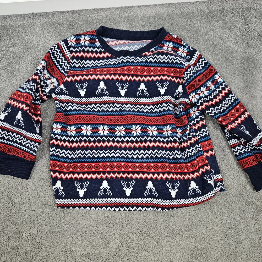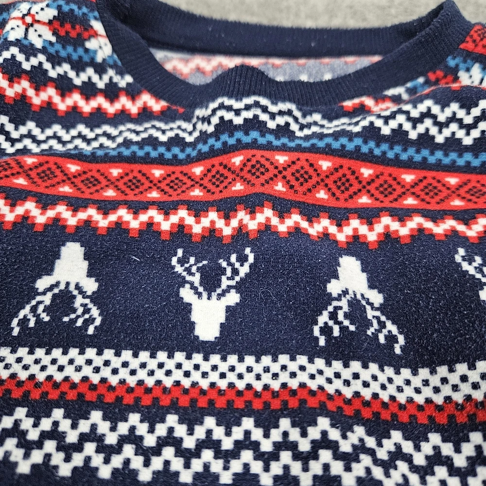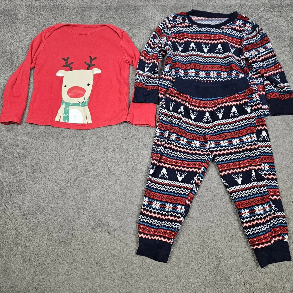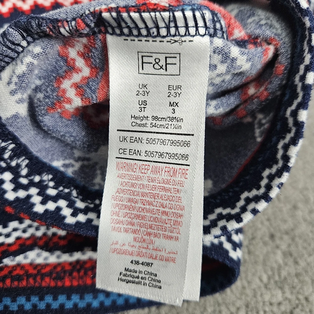Xmas clothing bundle size 2 to 3 years. Unisex designs, so suitable for girls or boys. Includes: - F&F red long sleeve top with reindeer print. Some slight cracking to the print and very minor colour fade. Otherwise good used condition. - F&F navy red and white fair isle pjs set with long sleeve top and trousers. Does have some bobbling to the fabric as pictured. Otherwise good used condition.