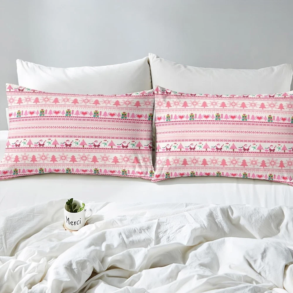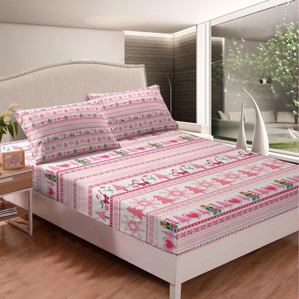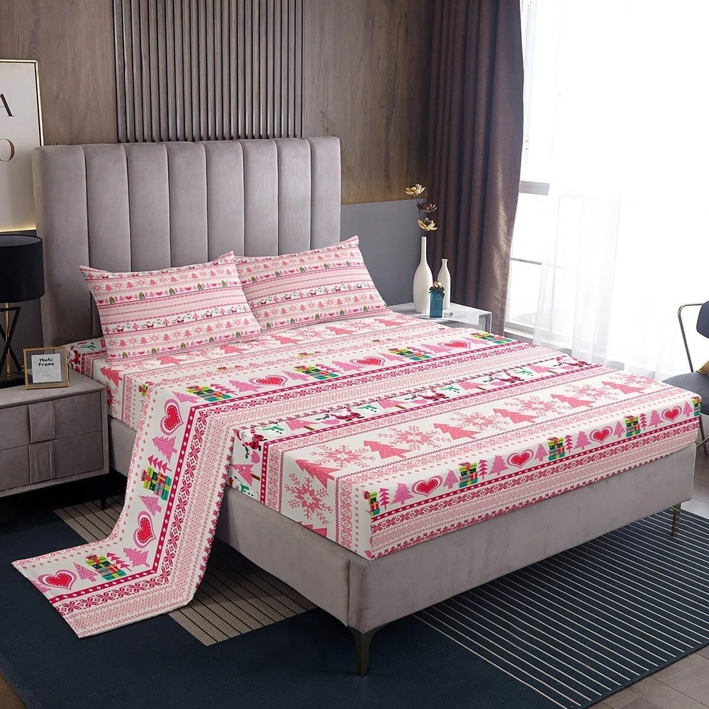 Christmas Comforter Cover Cartoon Santa Claus Snowman Sheet Set Pink Snowflake Christmas Tree Bed?Sheets?Set for Kids Boys Girls Microfiber Boho Stripes Bedding Set Room Decor Queen Size Soft Material: Our kids bed sheet create a good sleep environment for your kids; it makes your bedroom full of energy; soft breathable fabric keeps you asleep all night; good for friends, family What's Included: Queen sheet set: 1 queen fitted sheet 60 inch x 80 inch x 16 inch, 1 queen flat sheet 90 inch x 102 inch and 2 pillowcase 20 inch x 30 inch Deep Pockets: Fits mattresses up to 16 inch deep with elastic all around the fitted sheet, suit for large mattresses Easy Care: They are machine washable in cold water and dry quickly on tumble Bedroom Decor: Decorate your bedroom, guest room, rv,vacation home and dormitory with this lovely 3d kids' sheets set; it can good for kids, friends, weddings, birthdays, holidays