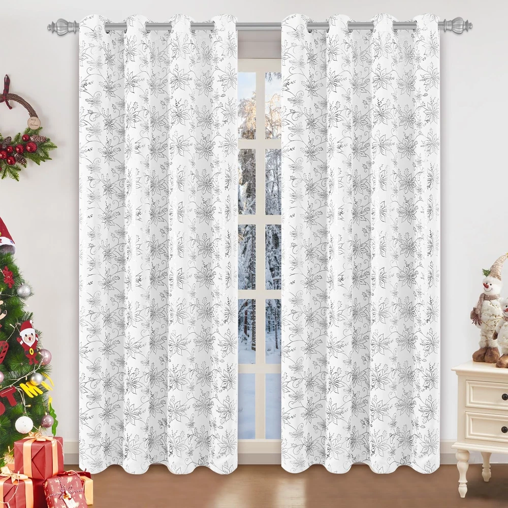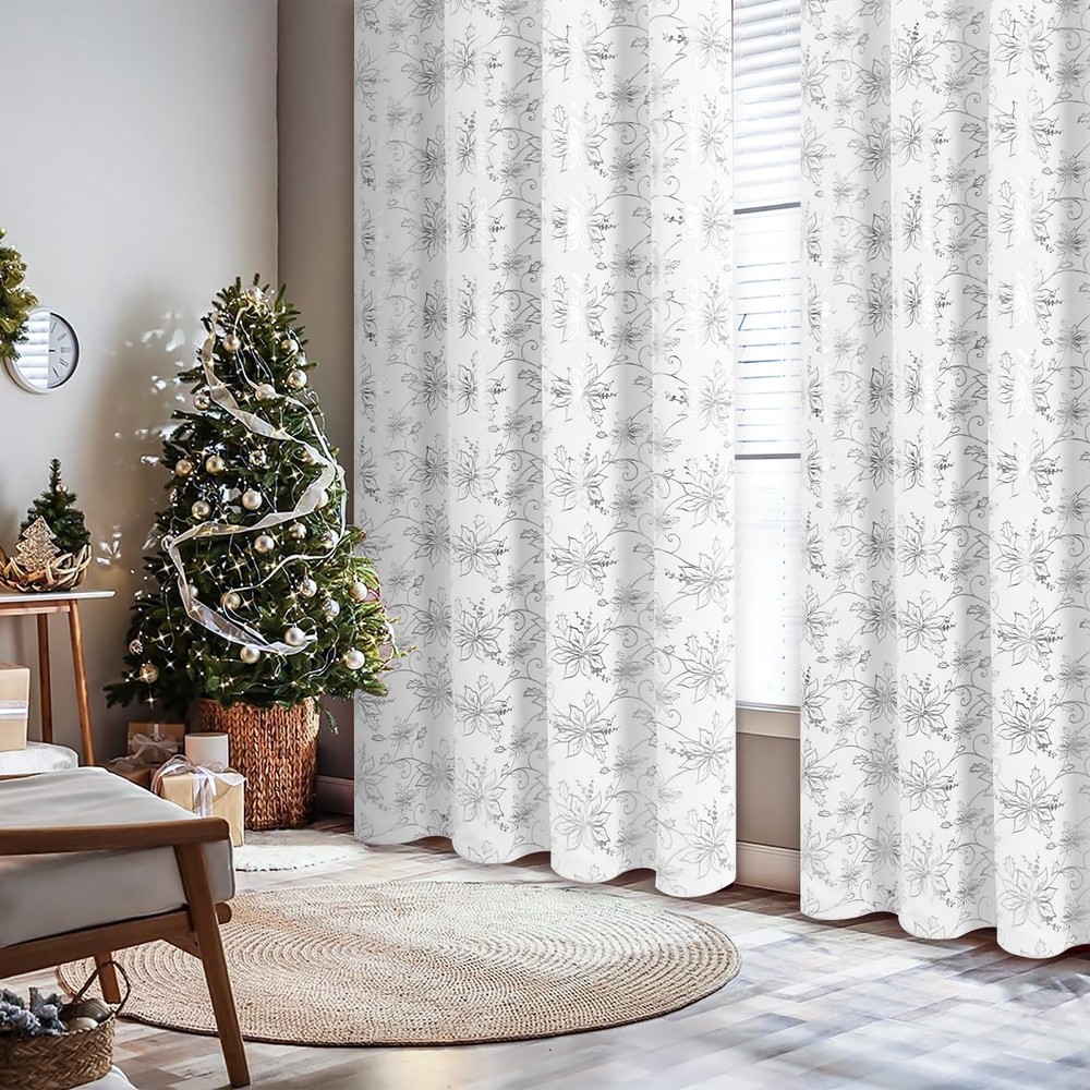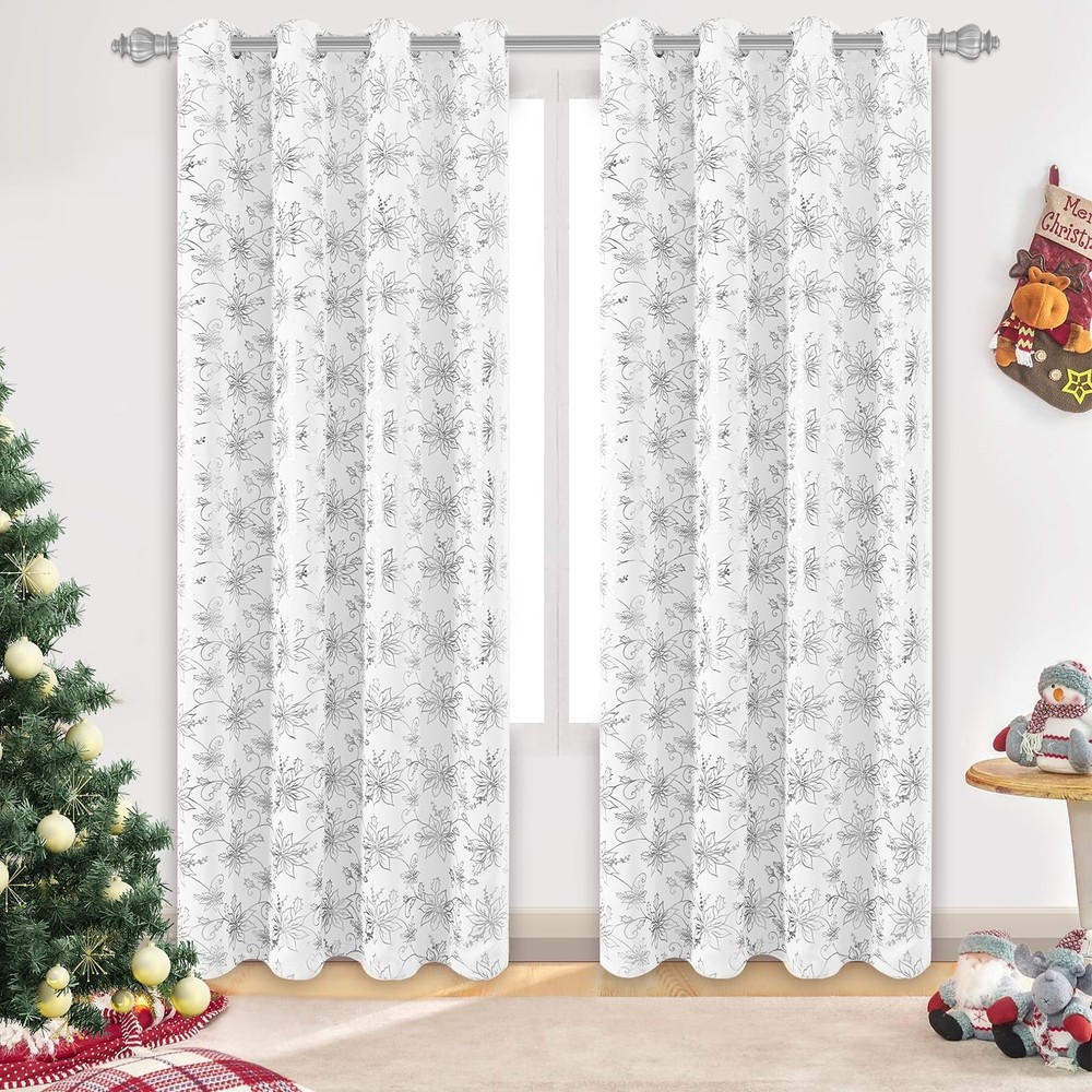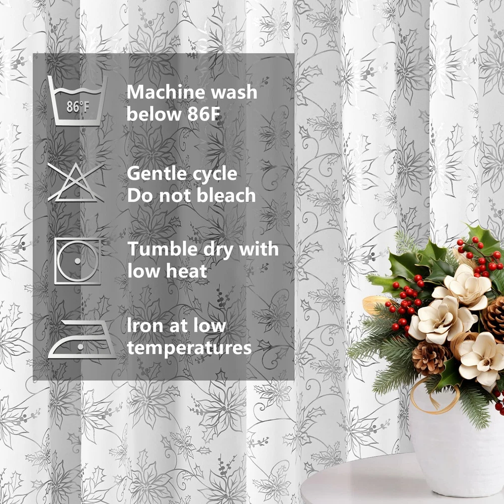 Brighten your home this holiday season with our exquisite Christmas Floral Window Curtains. These white Christmas curtains feature a stunning floral design adorned with shimmering metallic foil accents, bringing a touch of luxury and festive charm to your windows. Black Out: These Christmas bedroom curtains are made from high-performance blackout material. This ensures that they effectively block out sunlight, helping to maintain a dark environment. Whether you want to create a cozy atmosphere for holiday movie nights or ensure a peaceful sleep during daylight hours, these curtains provide the perfect solution. Sound Reduction: In addition to their light-blocking capabilities, the dense fabric of these Christmas window curtains also aids in reducing external noise. This creates a quieter and more peaceful indoor environment, making them ideal for bedrooms, living rooms, and any space where tranquility is desired, especially during the busy holiday season. Versatile Holiday Décor: With their elegant design and functional features, these Christmas floral blackout window curtains are versatile enough to suit a variety of rooms. They can be paired with other holiday decorations to create a cohesive and festive atmosphere. Whether you’re decorating a formal living room, a cozy bedroom, or a dining area for holiday gatherings, these curtains will enhance the ambiance and bring a touch of holiday to your home. Transform your home this holiday season with our Christmas livingroom curtains. These curtains combine the beauty of floral patterns with the practicality of blackout technology, ensuring that your holiday décor is both stylish and functional. Bring warmth, elegance, and a touch of glamour to your windows with these exquisite curtains, and make your holiday home a place of joy and celebration. Christmas Floral Foil Print: Our Christmas curtains feature twinkle floral with luxurious silver foil print that add a touch of elegance to Christmas. This exquisite combination adds a touch of holiday glamour to any room, adorn well for your home, office, apartment, and more Blackout Curtains: Our Christmas curtains for living room are made of high-precision material. Triple layers Christmas floral curtain helps block out 80%-85% lights and drafts in cold winter, creating dark bedrooms and living rooms environment, while also providing better privacy Noise Reduction: Compared with single-layer room darkening curtains, our triple-layer Christmas black out curtains for bedroom can better reduce noise from outside, creating a quieter and more peaceful indoor environment, especially beneficial during the busy holiday season. Package Includes: Christmas white silver curtains 84 inches length 2 panels set. Each curtains panel is 52 inches wide (a pair is 104" W x 84" L) and Christmas living room curtains with a 1.6-inch stainless steel grommets at the top, fits most curtain rods Easy Care: Despite their luxurious appearance, these Christmas window curtain & drapes are designed for machine washable and non fading, maintaining their shape and color even with frequent use, making them a worthwhile investment for Christmas celebrations.