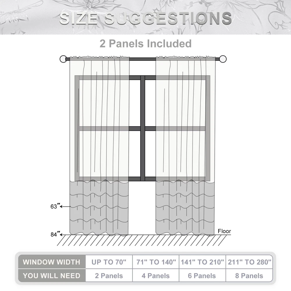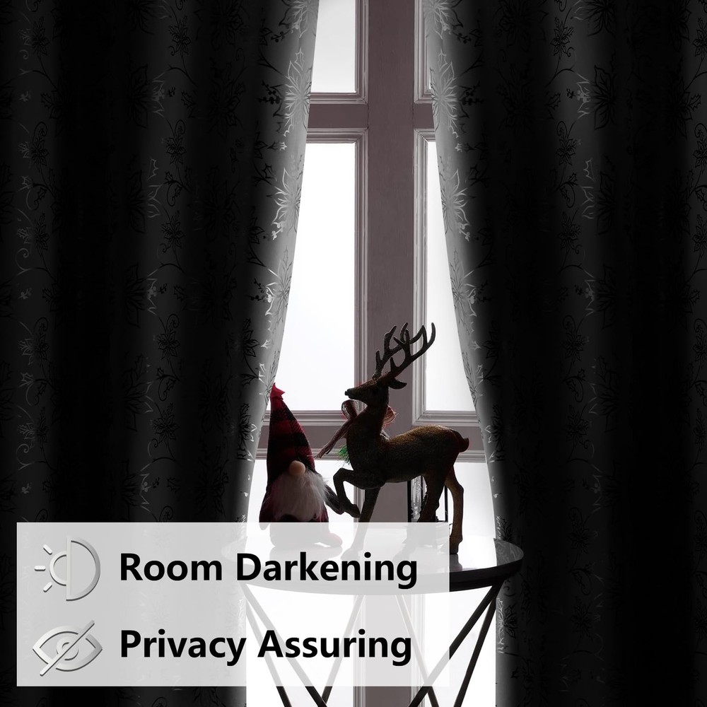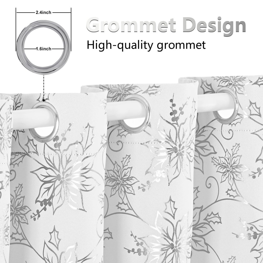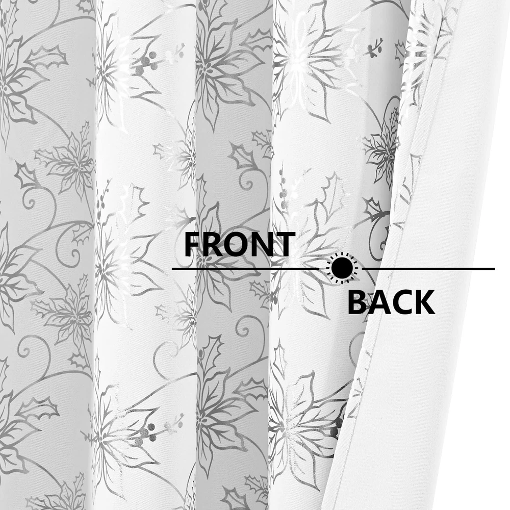 Brighten your home this holiday season with our exquisite Christmas Floral Window Curtains. These white Christmas curtains feature a stunning floral design adorned with shimmering metallic foil accents, bringing a touch of luxury and festive charm to your windows. Black Out: These Christmas bedroom curtains are made from high-performance blackout material. This ensures that they effectively block out sunlight, helping to maintain a dark environment. Whether you want to create a cozy atmosphere for holiday movie nights or ensure a peaceful sleep during daylight hours, these curtains provide the perfect solution. Sound Reduction: In addition to their light-blocking capabilities, the dense fabric of these Christmas window curtains also aids in reducing external noise. This creates a quieter and more peaceful indoor environment, making them ideal for bedrooms, living rooms, and any space where tranquility is desired, especially during the busy holiday season. Versatile Holiday Décor: With their elegant design and functional features, these Christmas floral blackout window curtains are versatile enough to suit a variety of rooms. They can be paired with other holiday decorations to create a cohesive and festive atmosphere. Whether you’re decorating a formal living room, a cozy bedroom, or a dining area for holiday gatherings, these curtains will enhance the ambiance and bring a touch of holiday to your home. Transform your home this holiday season with our Christmas livingroom curtains. These curtains combine the beauty of floral patterns with the practicality of blackout technology, ensuring that your holiday décor is both stylish and functional. Bring warmth, elegance, and a touch of glamour to your windows with these exquisite curtains, and make your holiday home a place of joy and celebration. Christmas Floral Foil Print: Our Christmas curtains feature twinkle floral with luxurious silver foil print that add a touch of elegance to Christmas. This exquisite combination adds a touch of holiday glamour to any room, adorn well for your home, office, apartment, and more Blackout Curtains: Our Christmas curtains for living room are made of high-precision material. Triple layers Christmas floral curtain helps block out 80%-85% lights and drafts in cold winter, creating dark bedrooms and living rooms environment, while also providing better privacy Noise Reduction: Compared with single-layer room darkening curtains, our triple-layer Christmas black out curtains for bedroom can better reduce noise from outside, creating a quieter and more peaceful indoor environment, especially beneficial during the busy holiday season. Package Includes: Christmas white silver curtains 84 inches length 2 panels set. Each curtains panel is 52 inches wide (a pair is 104" W x 84" L) and Christmas living room curtains with a 1.6-inch stainless steel grommets at the top, fits most curtain rods Easy Care: Despite their luxurious appearance, these Christmas window curtain & drapes are designed for machine washable and non fading, maintaining their shape and color even with frequent use, making them a worthwhile investment for Christmas celebrations.