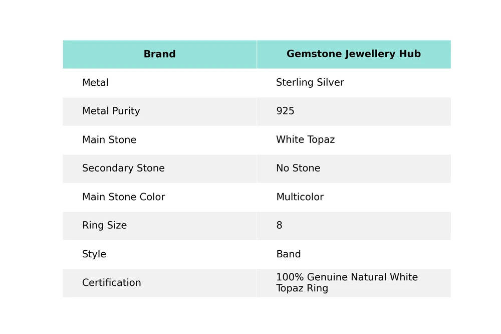 Welcome to Gemstone Treasure Hub Wedding Gift For Her 925 Sterling Silver White Topaz Gemstone Band Ring Size 8 Handmade Ring, Sterling Silver Ring, White Topaz Ring, Handcrafted Ring SKU : MR-4892 Gemstone : White Topaz Stone Shape : As Seen In Picture Metal Purity : 925 Sterling Silver Ring Size : 8 US Adjustable : _________________________________________________________________ Shipping Handling - Charge - Free ( Condition apply ) Handling Time - One business day . Delivery Time - 3 to 23 Days ( Various on destination ) Postage service - (A.) India Post - Below $100 order which takes 11 to 23 days . (B.) USPS, Fedex, DHL , Aramax- Order above $100 which takes 3 to 7 days . _________________________________________________________________ Returns - 1. We provide a 100% Money Back Guarantee, excluding shipping costs, within 30 days from the date of item receipt. 2. The item must not be altered or damaged in any way shape or form. 3. Upon receiving these items your payment will be refunded. 4. Kindly reach out to us via email to obtain return instructions prior to initiating the return of merchandise. 5. Please allow up to 1 business day for all returns to receivecredit. 6. Sizing does not affect the return policy. _________________________________________________________________ Payment - We accept PayPal for Payment , should made within three days once buying or winning done , in case of late information expected . _________________________________________________________________ FAQ's - Q.(A) ARE THE ITEMS YOU ARE SELLING BRAND NEW? We exclusively offer brand-new products, refraining from the sale of pre-owned jewelry. Our entire jewelry collection is composed of 100% natural, conflict-free pieces. We do not engage in the trade of imitation or lab-grown gemstones and diamonds. Q.(B) WHAT ARE YOUR BUSINESS HOURS? Our business hours are Monday to Friday, 10:00AM to 6:00PM, excluding holidays. ________________________________________________________________ Gemstone Treasure Hub is dedicated to providing customers with exceptional handmade jewelry crafted to the highest standards of quality. We operate as both connoisseurs and manufacturers of artisanal jewelry, possessing a profound expertise in the art of elevating gemstones to perfectly align with any aesthetic preference. We are pleased to offer you the opportunity to create your own jewelry collection, adorned with authentic and exquisite natural gemstones. Our team of highly skilled artisans painstakingly crafts each individual jewelry piece, ensuring the creation of products with a unique identity that feature genuine gemstones. The jewelry articles presented on our website accurately depict the precise pieces that you will receive.