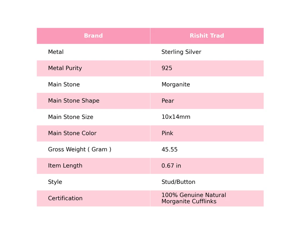 Add vivacity to your glamorous look by wearing this Cufflinkss by Rishit Trad. Featuring an ethnic handmade design, this Cufflinks is embellished with Morganite for a more feminine effect. Wear these 925 Sterling Silver Cufflinks with your best casual outfits to look iconic. ---------------------------------------------------- ------------ Welcome to Our Shop Rishittrad ---------------------------------------------------- ------------ Description:- SKU :- CL-5-10 Metal :- Sterling Silver Metal Purity :- 925 Gemstone :- Morganite Gemstone Color :- Pink Gemstone Shape :- Pear Gemstone Origin :- Setting :- Channel-Set Cufflink Lenght : - 0.67 Inches ---------------------------------------------------- ------------ -------- ------------ Elegant Birthday Tribute:- Discover the essence of sophistication with our Birthday Radiance collection. Crafted with exquisite attention to detail, each piece embodies the timeless elegance and symbolic significance of birthdays. Craftsmanship Excellence:- Meticulously fashioned from premium 925 sterling silver, our jewelry pieces boast a classic and enduring design. The rich tones of natural gemstones complement the silver setting, creating a captivating harmony that resonates with wisdom and truth. Symbol of Personal Growth:- Gift with intention and meaning. Our Emblem of Wisdom pieces symbolize heartfelt wishes for personal growth and enlightenment on the recipient's special day, making it a cherished gesture of love and appreciation. Versatile Elegance:- Measuring at 1.2 inches, our creations seamlessly blend into any ensemble, offering both daily wearability and the ability to elevate sophisticated looks for special occasions. Their adaptable design ensures they become treasured additions to any jewelry collection. Thoughtful Expression of Love:- Surprise your beloved with a gift that transcends mere adornment. Our Natural Gemstone 925 Sterling Silver collection is a stylish and thoughtful token, exuding elegance and emotion while conveying warmest wishes with enduring grace. Exquisite Presentation:- Delight in the joy of gifting with our meticulously presented pieces, elegantly housed in an exquisite gift box. Make their birthday truly memorable by presenting them with a gift that captures the allure and timeless elegance of sterling silver. -------------------------- Image Policy----------------------------- All images are captured in natural lighting. The product showcased is the exact item you'll receive. -------------------------- Delivery Policy-------------------------- Standard Shipping typically takes 15-25 days, depending on your location. For expedited shipping, additional charges will apply. --------------------------- Product Policy--------------------------- You will receive the exact product depicted in the photos. All items are meticulously handcrafted. ------------------------------ Order Policy------------------------------ We welcome orders from around the globe. Custom orders are also accepted. Bulk orders are available upon request. Should you have any queries about our products, please don't hesitate to reach out. Upon receiving your product, we'd appreciate your feedback. ⋆⋆✦✧✦⋆⋆⋆⋆✦✧✦⋆⋆⋆⋆✦✧✦⋆⋆⋆⋆✦✧✦⋆⋆⋆⋆✦✧✦⋆⋆⋆⋆✦✧✦⋆⋆⋆⋆✦✧✦⋆⋆ "Discover a captivating collection of handcrafted gemstone jewelry at our boutique." https://www.ebay.com/str/rishittrad0 ♥ Thank you for choosing us ♥