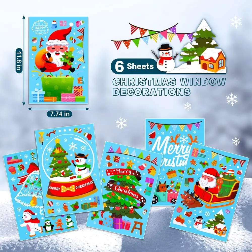 Christmas Decorations -- Christmas decorations includes 159 Pcs 6 sheets Christmas window clings for glass windows.Thes size of each windows stickers is 7.74"x11.8".They can meet your window sticker needs for Christmas. Christmas Window Stickers -- 6 sheet window stickers are closely related to the Christmas theme, whose decorative patterns such as Santa Claus, christmas tree, snowflakes, snowman, reindeer, gifts, etc., creating a joyful festive atmosphere for Christmas holiday. Christmas Decor -- Before using winter christmas window clings, wipe the surface of the glass with a damp towel or spray it with water, then stick and use a card to scrape off any bubbles on the surface for the best effect. Widely Applications -- The window sticker is perfect for indoor decoration at Christmas parties. As long as the surface is smooth, the window sticker can be used. For example, windows, doors and windows, mirrors, glass, etc. Holiday Decorations -- The window sticker package features a variety of different styles of patterns, designed with fun Christmas characters and elements as its features, making the atmosphere of the Christmas holiday even stronger.