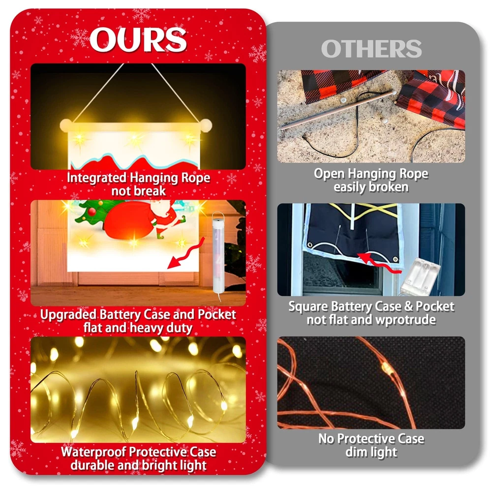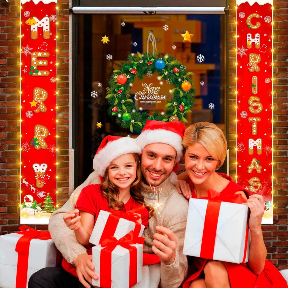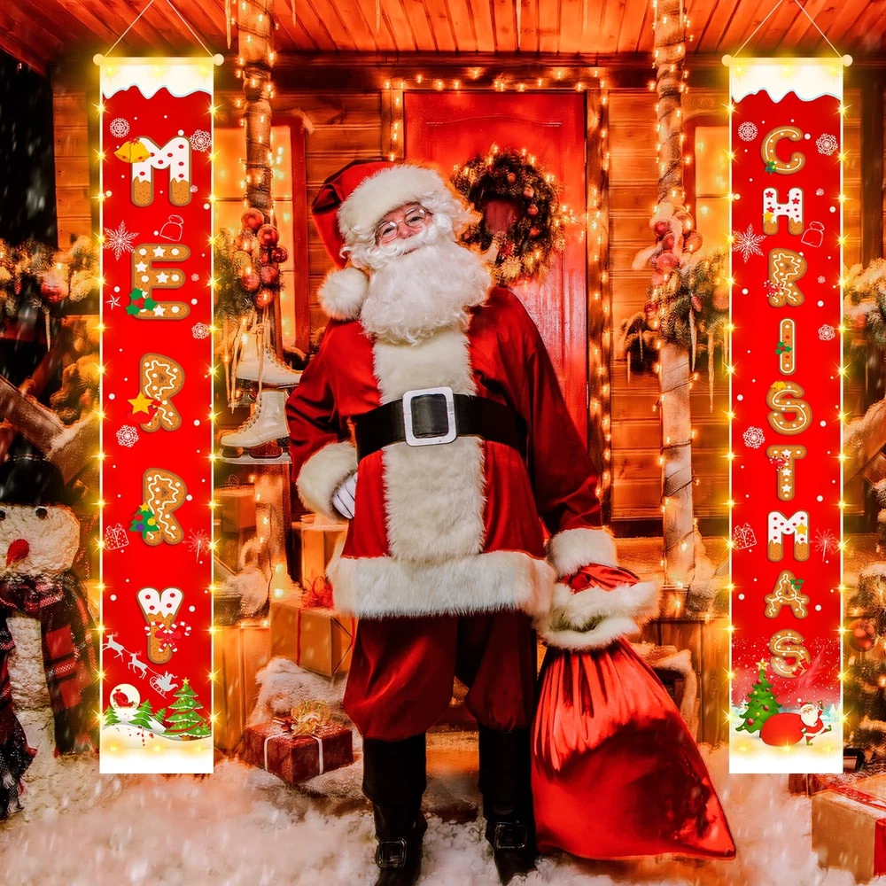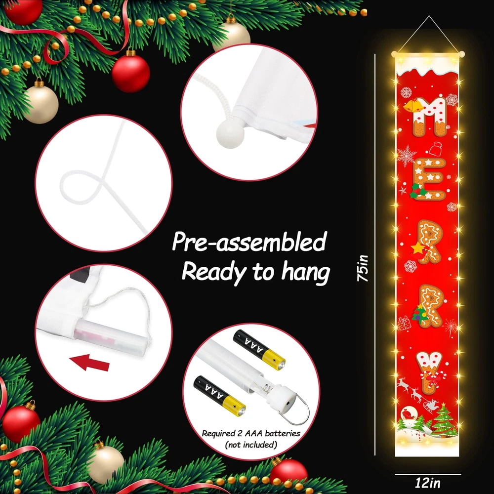 Lighting Up Christmas Banner:This newly designed nice Christmas banner features battery powered and waterproof 92 LED string lights sewn along the edges, making it stand out beautifully at night. It adds a Christmas touch to your home, day or night Exper Craftsmanship: Crafted from weatherproof 600D Oxford fabric, this banner is waterproof, and easy to clean. The vibrant 3D-printed design resists color fading, ensuring long-lasting outdoor use. Every stitch is carefully inspected for quality Upgraded Long Battery Box: The long battery box is easy to hide in the bottom pocket of the banner without any bulge. It keeps the couplet straight and prevents it from blowing away. It has a 6h on/18h off timer for energy saving and convenience Ideal Christmas Decorations: Includes 2 hanging banners set: 1 x "MERRY" & 1 x "CHRISTMAS". The banners are printed with Ginger cookies letters, Christmas tree, Snowflake, and Santa; the vivid bright red modeling boosts the Christmas atmosphere. Ready to Hang: The 12 x 75 inch Christmas hanging sign is large enough to stand out. Pre-assembled with a rod and rope, it’s easy to hang and saves you time. Ideal for your front door, porch, balcony, living room, or any spot you choose