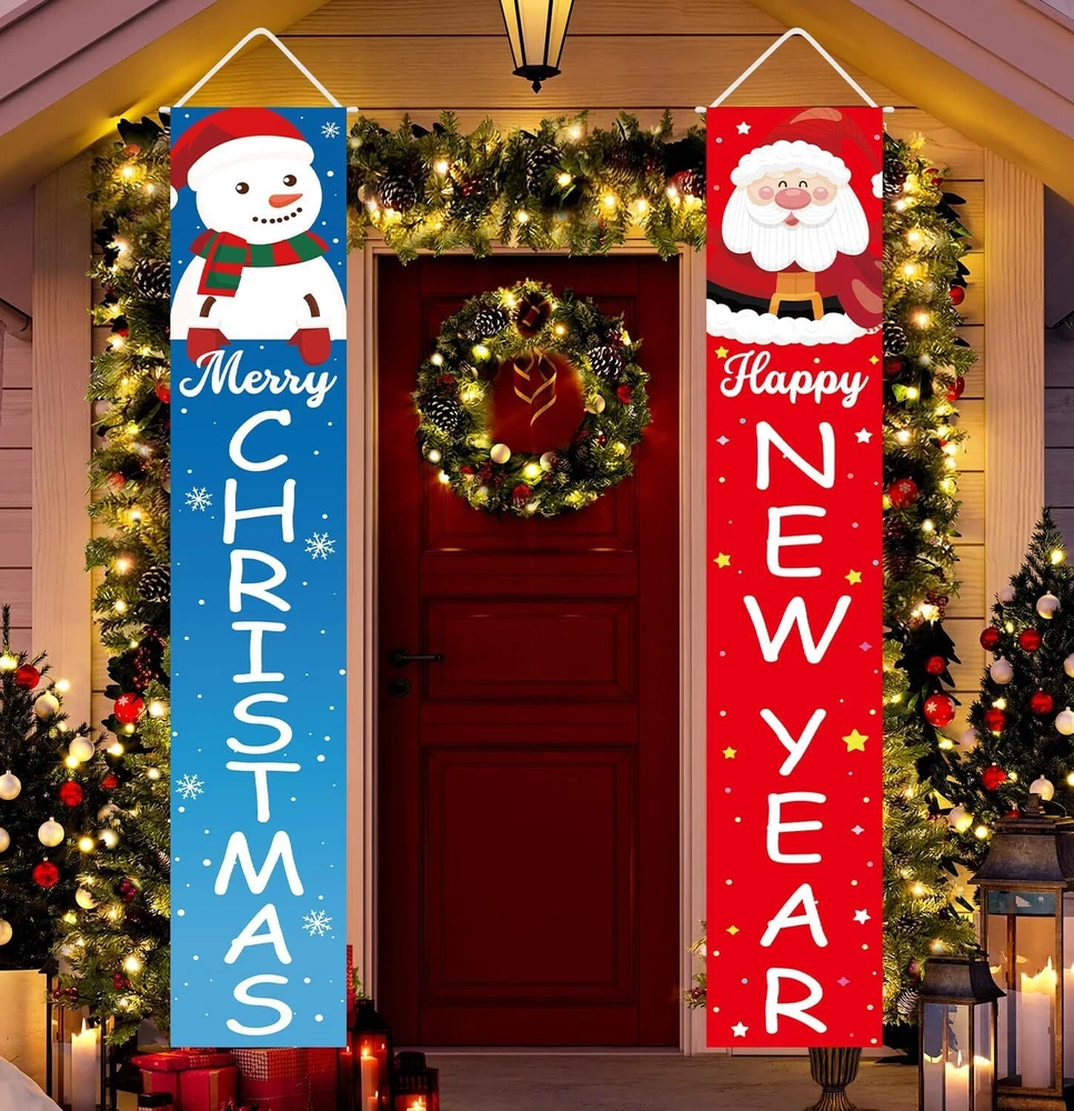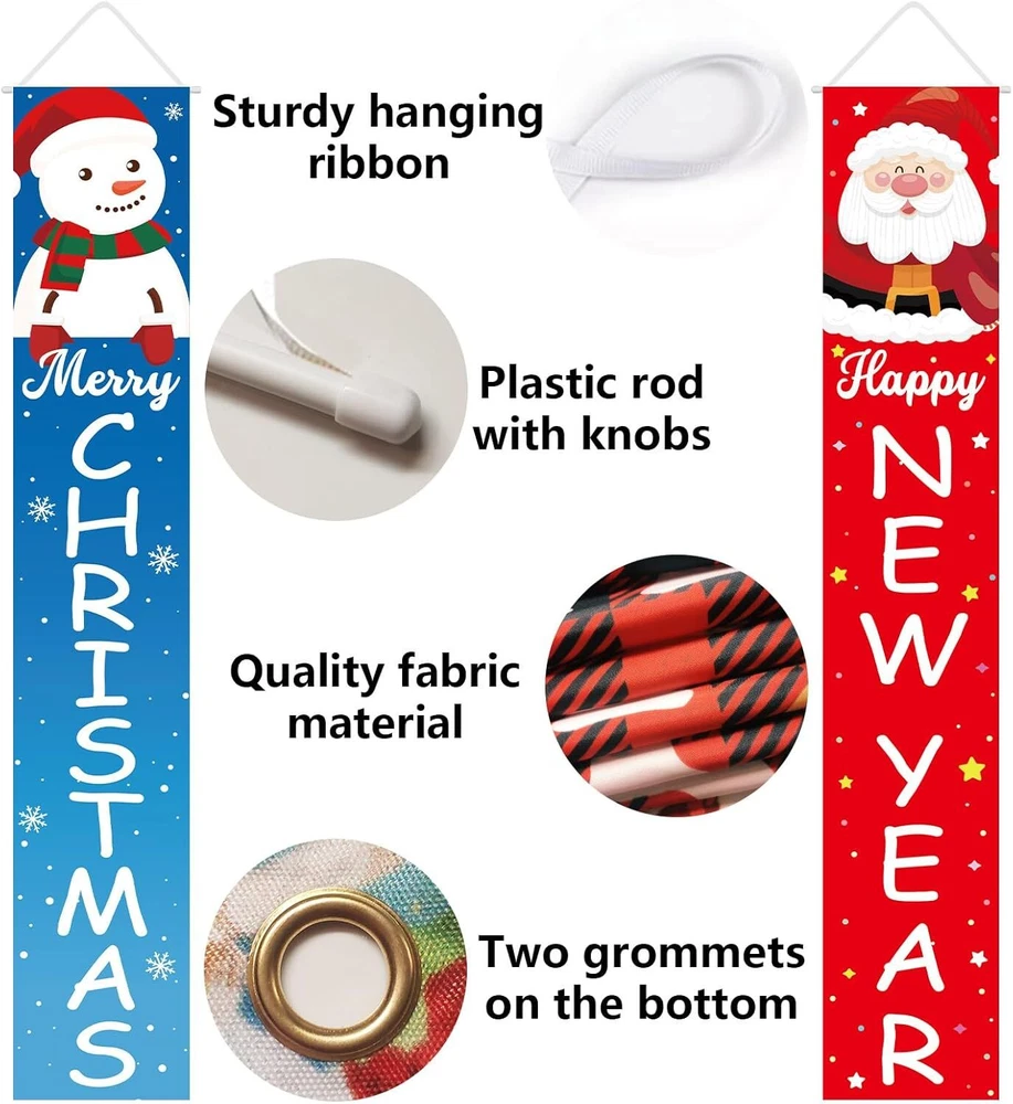Christmas Decorations Happy New Year Merry Santa Product Details Item Weight: 8.1 ounces Manufacturer: Labrostar Item model number: Happy New Year Theme: Happy New Year, Christmas Color: Happy New Year Brand: Labrostar Recommended Uses For Product: Decor, Home, Indoor, Outdoor Occasion: Happy New Year, Christmas Material: [INFERRED: Fabric material] Special Feature: Weather Resistant Cartoon Character: Santa Claus, Snowman Specific Uses For Product: Holiday Decor, Christmas, New Year Product Dimensions: 70"L x 12"W Christmas Decorations: Cute patterns of Santa Claus, Snowman, snowflakes, and Happy New Year Merry Christmas warm welcome greetings, match with colorful classic elements, adding a festive atmosphere to the home easily. Highly Quality: Xmas banner is made of high quality fabric, easy to use and store, sturdy enough for the next use. Weather-resistant, ideal for outdoor or indoor decorations. Easy to Use: Easy but festive Christmas decorations. Pre-assembled to decorate front door, porch, fireplace, garage, patio, home, office, indoor and outdoor easily. Decent Size: Each banner measures 72"x12", big size to Eye-catching. There are 2 grommet holes at the bottom to better secure them from the wind, just hang them anywhere you like.