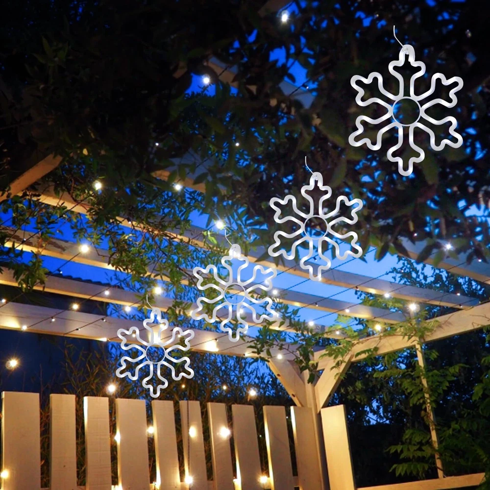 Christmas Decorations snowflake Lights, 4pcs snowflake LED Lights for Christmas Tree and Holiday Seasonal Decoration This christmas snowflake lights work great with christmas trees,windows and outdoor christmas decorations. You can also hang the snowflake lights under the eaves, gutter or porch, place them on fences and stair posts, illuminate windows, arrange on bedroom shelves or furniture, etc. Light up Your Christmas with this snowflake string lights! Perfect indoor outdoor decoration for Christmas tree, wedding, New Year, holiday, birthday, party, festival, bedroom, backdrops, porch, patio, house, stage, etc. Specification: - Total number of bulbs: 144 - Total number of bulbs on each snowflake: 36 led - Size: Snowflake Dia 11.4inch,, plug cable length 5m/16.4ft - Voltage: 29V safe low voltage (Includes UL plug-in transformer) - Power source: Plug-in electric - IP44 Waterproof. NOTE:Please press and hold the round button on the controller until the green light disappears .The timing function is canceled !!! 【About Christmas Decorations Snowflake Lights】The diameter of the snowflake is 11.4inch.There are 36 small led lights on each snowflake.4 pieces snowflake lights with 144LEDs . Plug cable length:16.4ft. Light up Your Christmas with this Christmas snowflake string lights!NOTE:Please press and hold the round button on the controller until the green light disappears .The timing function is canceled !!! 【8 Lighting Modes&Timer and Waterproof】: The christms decorations snowflake lights have 8 different lighting modes: steady on,combination, in waves, sequential, slo-glo, chasing/flash, slow fade and twinkle/flash. IP44 waterproof lighted christmas decorations are perfect for indoor and outdoor decorations. 【Application】: Offers decorative led christmas snowflake lights for party,buildings, wedding ,windows, walkways, patios, gardens, fences, porches, restaurants, clubs, bar etc.High flexibility, temperature sustainability, and UV resistance 【Use Safely &Easy to Installation 】29V low voltage plug with UL certified to ensure safety use.Plug and unplug the power directly to turn on and off.Easy to be hung on a tree or roof to make a decoration to your yard.When you installation, Just hanging the big snowflake on an exterior wall, tree or eaves.It’s great for party,yard indoor outdoor christmas decorations. 【RELIABLE 1 YEAR CUSTOMER SERVICE】If you're unsatisfied with this Christmas snowflake lights for any reason, please feel free to contact us and we will give you a satisfactory solution.