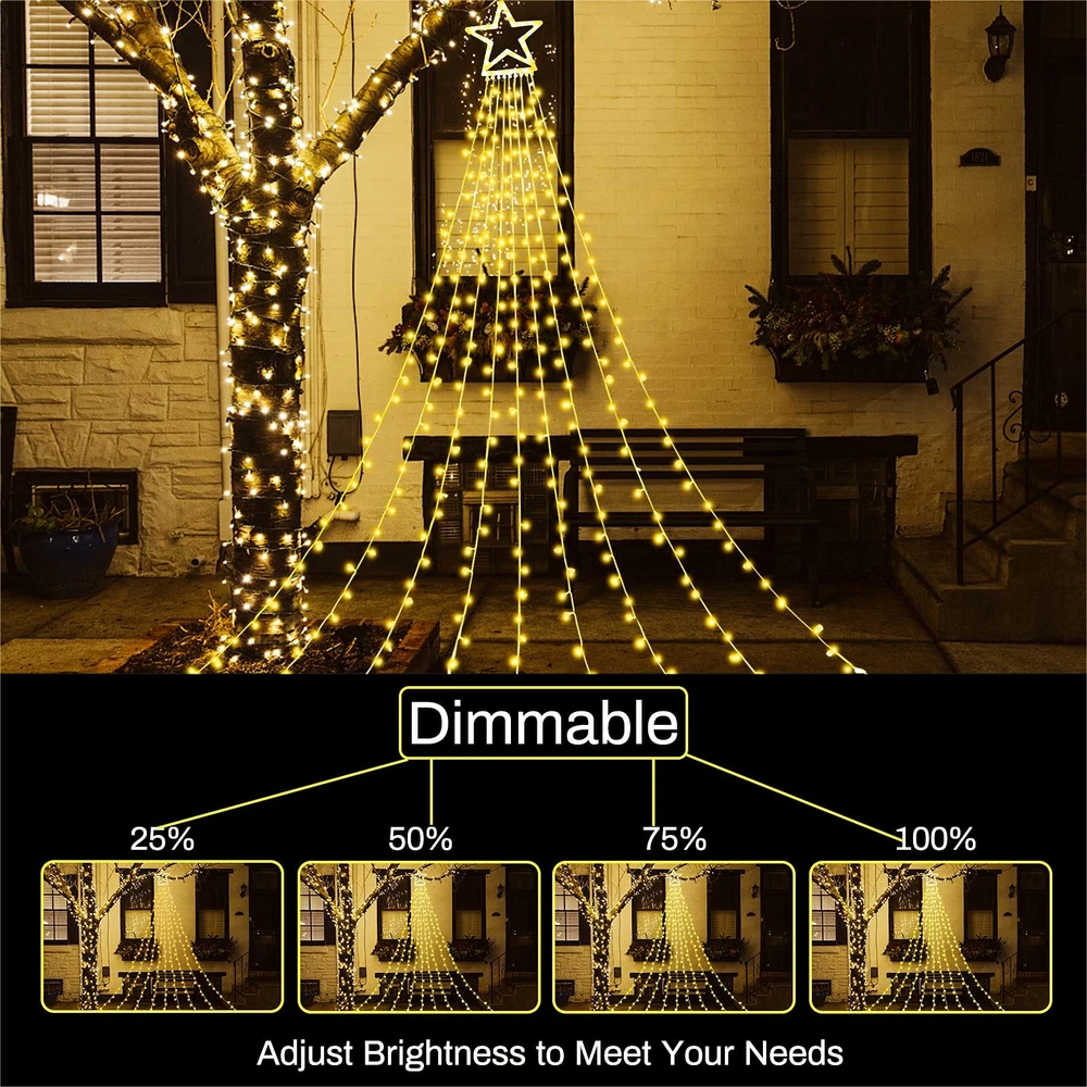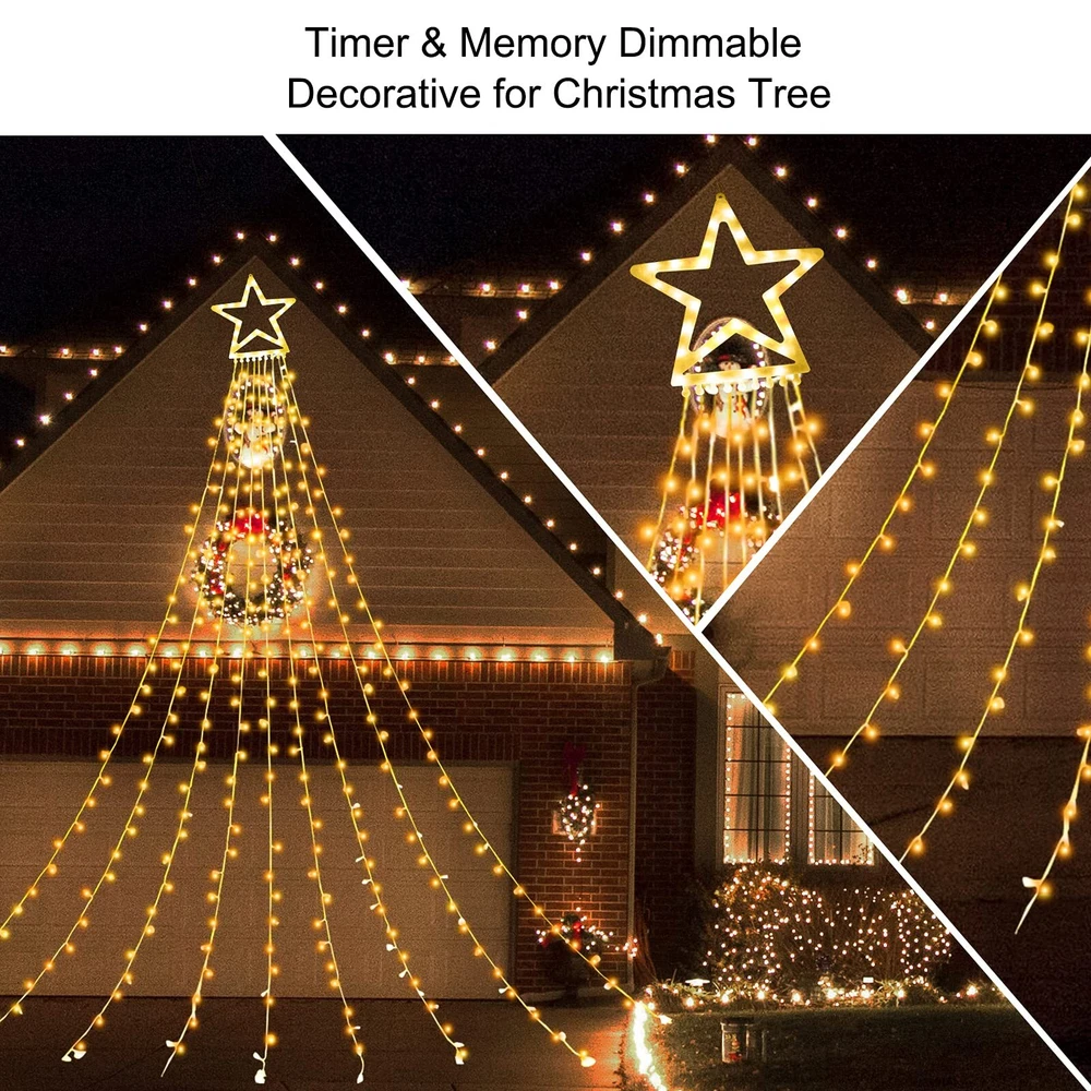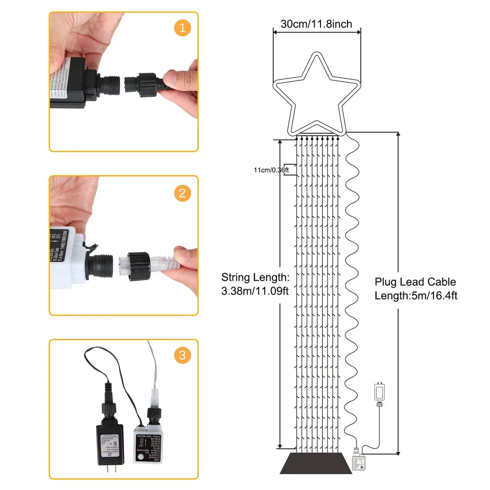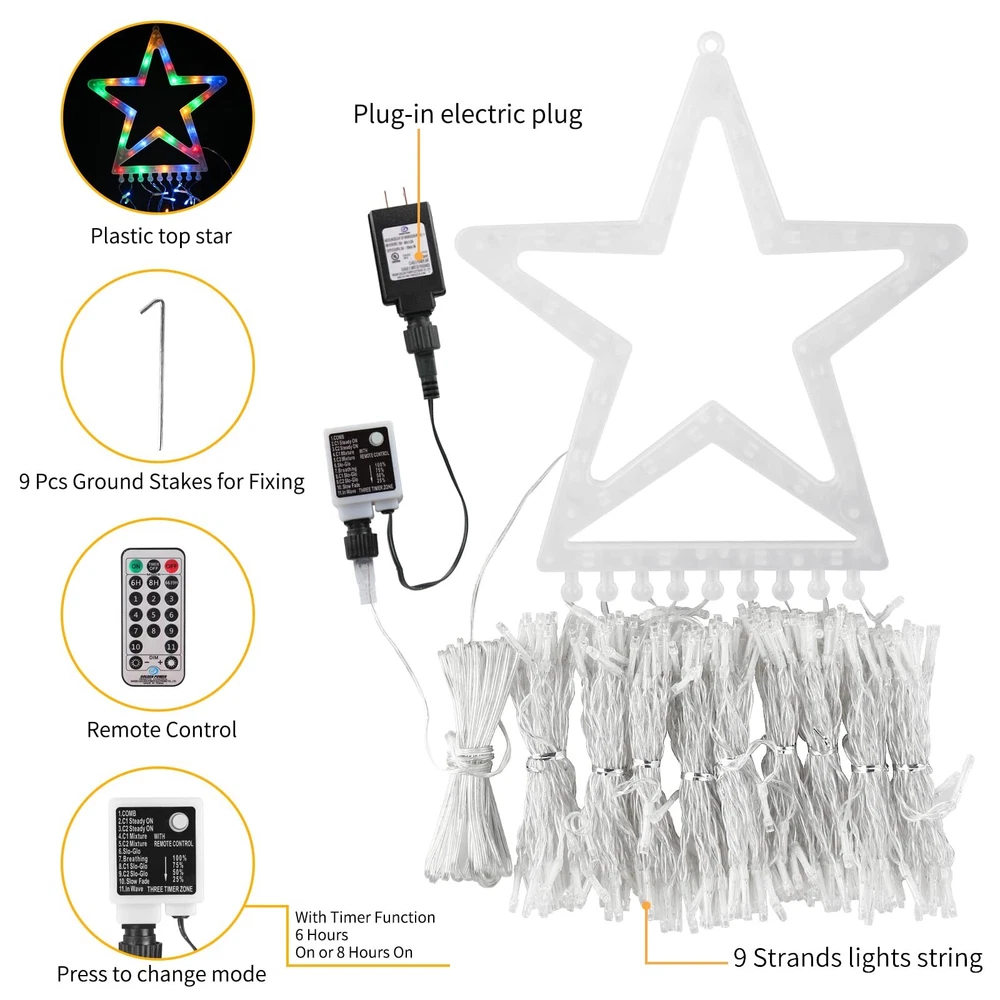 Package Included 1 X Star Sring Lights 1 x Adapter 1 x Remote Control 1 x User Manual 9 Pcs Ground Stakes for Fixing 2 IN 1 & 11 Lighting Modes: Buy ONE Christmas Decorations Outdoor Star String Light,you can get Warm White and Multicolor two modes and 11 different lighting modes at the same time Memory Function: Outdoor Christmas Decorations Star Lights has memory function,capable of remembering the last mode you set before power off.No bother to set the light again Level 4 Brightness & Timer Function: The Christmas Decorations Star Lights has four levels brightness and timer function.You can select the mode of 6 hrs on 18 off or 8 hrs on 16 hrs off on the remote control Curtain String Lights Length Details: 1 top star light with 9 strand string lights,the large star ornaments diameter is 12 inches,each string lights length:11ft.Plug cable length:16.4ft Waterfall Star Lights Package Included: 1 x Star Sring Lights;1 x Adapter;1 x Remote Control;1 x User Manual and 9 Pcs Ground Stakes for Fixing
