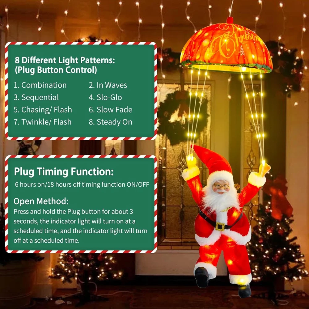 Christmas Decorations Santa Claus Parachute Lights 8 Modes 24.8" Product Details Color: Christmas Brand: SenLuKit Material: Plastic Theme: Christmas Item dimensions L x W x H: 5 x 5 x 5 inches 【Cute Santa Claus Lights】- With unique colorful santa claus parachute shaped design, those lovely and beautiful decor lights can create a warm feeling and festive atmosphere in this Christmas holiday. Enhance the happiness of your home with our set of xmas LED lights. 【Brighten Your Christmas Night】- Hanging those LED decor lights on your window, door or porch ect, it looks like twinkling little stars in the night sky, very lovely, unique, and joyful. Best christmas window decorations lights. 【Christmas Home Decor Gifts】- These christmas holiday lights with an IP65 waterproof rate, even on little rainy days, stars can flash outdoors, very convenient and safe to place anywhere. You can use it to decorate christmas trees, homes, bedrooms, windows, doors, cabinets, hallway, pub, bistro, cafe, restaurant, showcase as well. 【Memory and Timer Function】- Press and hold the button on the adapter for 3 seconds until the green light on, then the timer function start, 6 hours on 18 hours off. The santa claus lights could recover from the previous setting mode when you restart, no need to reset the mode every time.