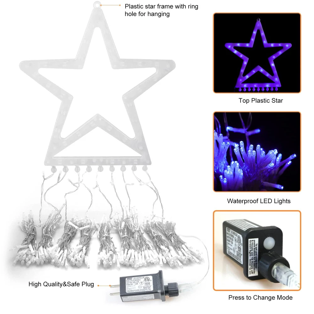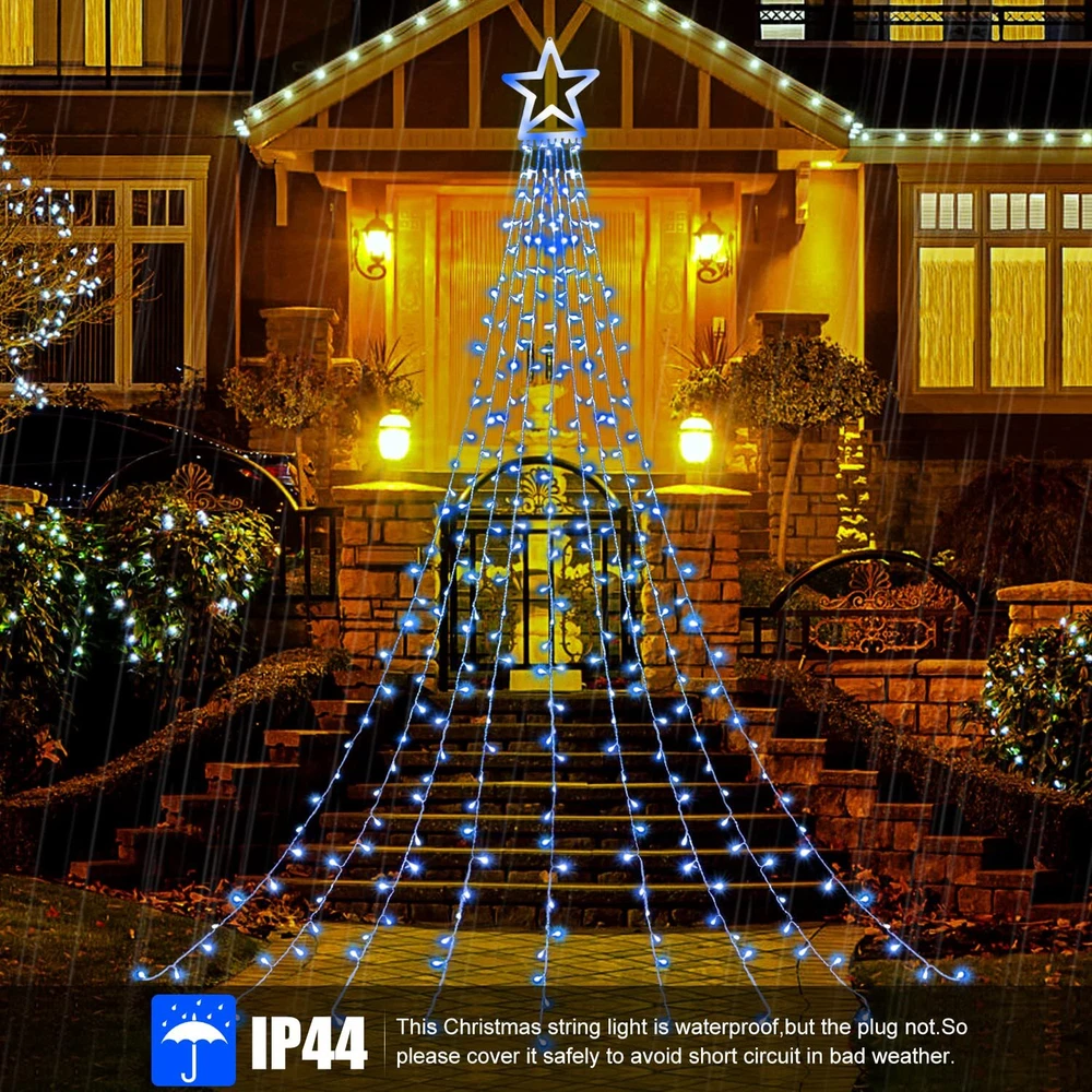 ✨【LIGHT UP YOUR CHRISTMAS】: Our outdoor Christmas decorations lights are made with super bright 320 LEDs, consisting of 9 string lights of 32 led each. The top star diameter is 12.6in. Each string drops: 11.5ft. Plug cable length:16.4ft. ✨【IP44 WATERPROOF OUTDOOR LIGHT】: Featured with IP44 waterproof function, these hanging Christmas star light trees are solidly constructed to withstand any weather. Making decorating light suitable for on the tree, shutters, flag pole, balcony, window, porch, eaves, yard, etc. ✨【USE SAFELY & EASY TO INSTALLATION】: 30V low voltage plug with UL certified to ensure safety use. Plug and unplug the power directly to turn it on and off. Easy to be hung on a tree or flag pole to make a Christmas lights decoration for your yard. When you install, Just hang the lighted star on an exterior wall, tree, or eaves, and the 9 string fairy lights fall to the ground. ✨【8 SETTING MODES】:The Christmas outside waterfall lights have 8 flashing modes including combination, fireflies flash, waves, sequential, slo-gllo, twinkle, slow fade, sparkle and constant glow. The mode can be changed by pressing the button on the top. Great additional to your Christmas light display! ✨【HOLIDAY DECORATIVE LIGHTS】: Big stars will give the outdoor string lights infinite vitality, especially suitable for Christmas themed parties, Christmas yard decorations, and Thanksgiving outdoor parties. Beautiful lights for your 2022 Christmas nativity display!