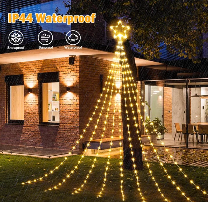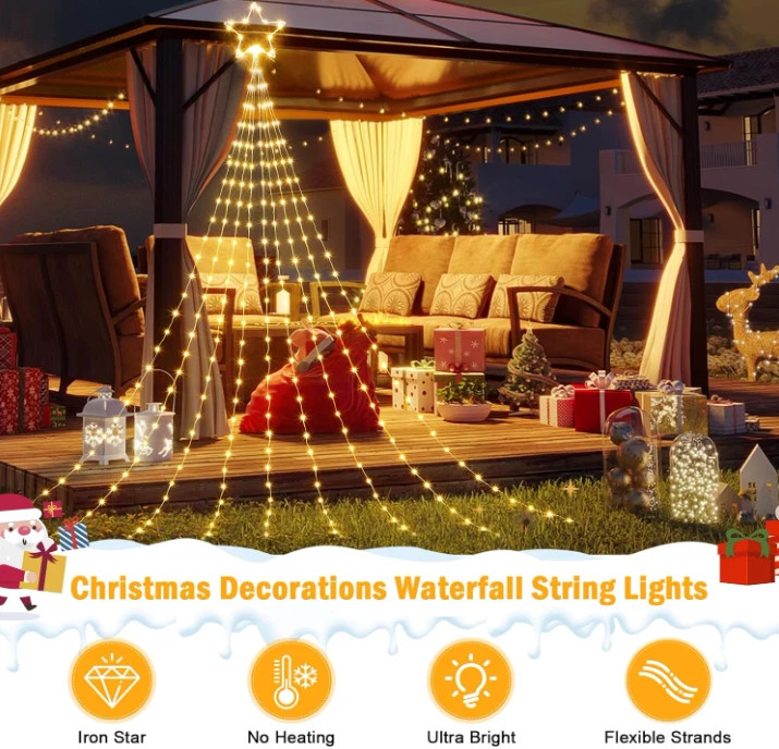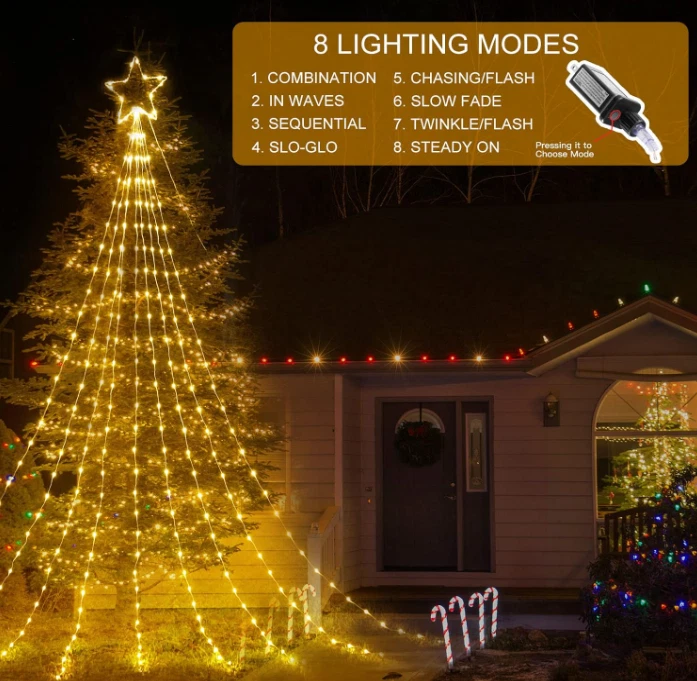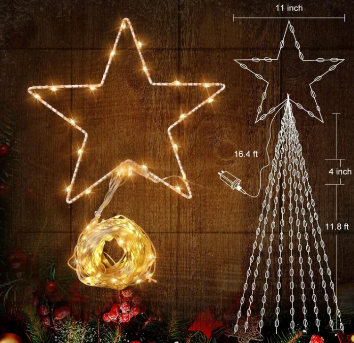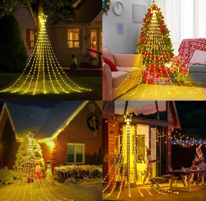Christmas Decorations Star String Lights 344 LED 11.8ft 9 Strands Waterfall Tree Magical and Cozy Decor: Transform your home into a cozy winter wonderland with our Christmas tree decoration lights. The 11-inch topper star and 9 strings of warm white lights, each 11.8 feet long, add a touch of elegance to your holiday decor. Plus, with 1 hanging string and 9 ground spikes, these lights are perfect for versatile outdoor decorating. Versatile Indoor and Outdoor Use: IP44 waterproof and perfect for outdoor spaces like yards, fences, and plazas, as well as indoor spaces such as hotels, restaurants, cafes, and malls. Illuminate any space and create a festive ambiance for any occasion. Multiple Lighting Modes: Choose from 8 adjustable lighting modes, including combination, in waves, sequential, slow glow, chasing/flash, slow/fade, twinkle/flash, steady on. Press mode button selects 8 different modes to satisfy your diverse needs. Safe and Convenient: Our lights come with a timer function - holding the press button on the adapter for about 3 seconds to set the 6 hours on and 18 hours off timer. These lights are touchable at low temperatures and come with a press-and-hold adapter button, ensuring they are safe to use. Great Gift for Any Occasion: These Christmas lights are easy to assemble and store, making them a perfect gift for any occasion. From New Year's to weddings, holidays, and anniversaries, give a festive gift that will bring joy and warmth to any home. Your loved ones will treasure this thoughtful and practical gift for years to come. SPECIFICATIONS: Star Topper: 11 inches LED quantity: 290 LED lifespan: 30000H Light spacing length: 3.9 inches Lead cord length: 16.4 feet Light color: warm white Color temperature: 2850K Waterproof grade: IP44 Ground spike: 9 pieces Power input: 120V~60Hz, 0.20A Power output: DC30V, 0.20A 8 Working Modes: 1.Combination 2.In Waves 3.Sequential 4.Slow glow 5.Chasing/flash 6.Slow/fade 7.Twinkle/flash 8.Steady on Package Includes: 1 x Star Topper String Lights 9 x Ground Stake 1 x Hanging String 1 x User’s Manual ORDER NOW for giving your home, holiday or party for fully showing! Terms of Sale and Feedback: Feedback is very important to us and eBay. If you are satisfied with our transaction, please take a moment to leave positive feedback. YOUR satisfaction is our number one priority! If there are any problems, PLEASE contact us BEFORE leaving a neutral or negative rating so we can resolve any concerns. We PROMISE that we can make you happy if you give us a fair chance.