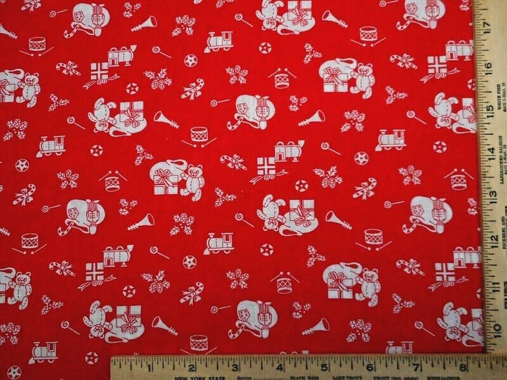 This is a very nice fabric that is 100% cotton. This Fabric is out of print. It has white toys like bears, drums & trains with candy canes, holly, etc. on a red background. READ: Because computer monitors show colors and shades differently, the fabric colors can vary from the photos. If you have any questions regarding this, please contact me before p urchasing the item. I have been a quilter for 30 years and am an accomplished seamstress & would be happy to answer any questions you might have. This is for 1 3/4 Yard of Fabric. If you have a problem with anything you purchase from me, please contact me before leaving neutral or negative feedback and I will work it out with you. Payment is due within 48 hours. If payment isn't received within 5 days, it will automatically go to Ebay's resolution center for non-payment. INSTRUCTIONS FOR COMBINED SHIPPING: I Do combine shipping. You must add the items to your shopping cart and request an invoice from me using the REQUEST TOTAL BUTTON, BEFORE completing the payment process, or I won't be able to combine your shipping. Payment is due upon receipt of your invoice. Thank you for looking and God bless you and your family. IF THERE IS A PROBLEM WITH ANY PURCHASE, PLEASE CONTACT ME, THE SELLER, VIA EBAY'S MESSAGING SYSTEM PRIOR TO OPENING A CASE--OPENING A CASE, EVEN IF RESOLVED SMOOTHLY, CAN HURT THE SELLER'S RATINGS. THANK YOU