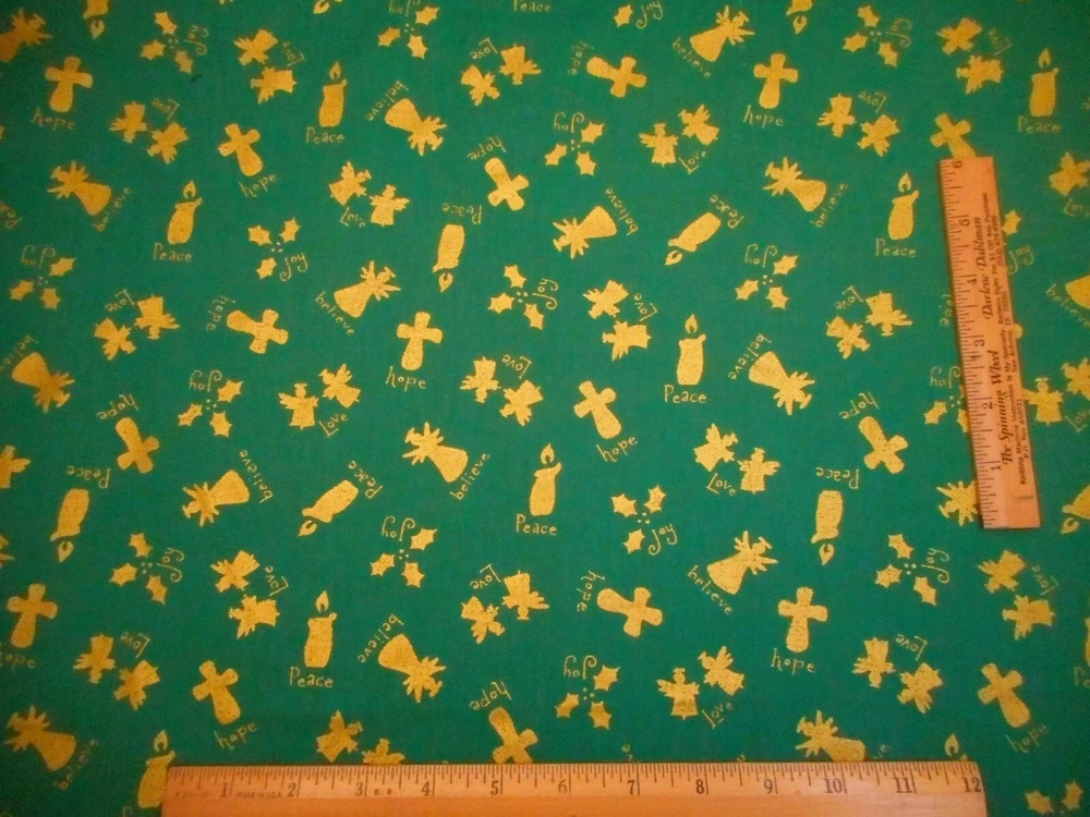 This is a very nice fabric that is 100% cotton. This fabric is out of print. It has metallic gold angels, crosses, candles & holly with the words Believe, Hope, Love, Joy & Peace. READ: Because computer monitors show colors and shades differently, the fabric colors can vary from the photos. If you have any questions regarding this, please contact me before p urchasing the item. I have been a quilter for 30 years and am an accomplished seamstress & would be happy to answer any questions you might have. This is for a 1 3/8 Yard of Fabric. If you have a problem with anything you purchase from me, please contact me before leaving neutral or negative feedback and I will work it out with you. Payment is due within 48 hours. If payment isn't received within 5 days, it will automatically go to Ebay's resolution center for non-payment. INSTRUCTIONS FOR COMBINED SHIPPING: I Do combine shipping. You must add the items to your shopping cart and request an invoice from me using the REQUEST TOTAL BUTTON BEFORE completing the payment process, or I won't be able to combine your shipping. Payment is due upon receipt of your invoice. Thank you for looking and God bless you and your family. IF THERE IS A PROBLEM WITH ANY PURCHASE, PLEASE CONTACT ME, THE SELLER, VIA EBAY'S MESSAGING SYSTEM PRIOR TO OPENING A CASE--OPENING A CASE, EVEN IF RESOLVED SMOOTHLY, CAN HURT THE SELLER'S RATINGS. THANK YOU