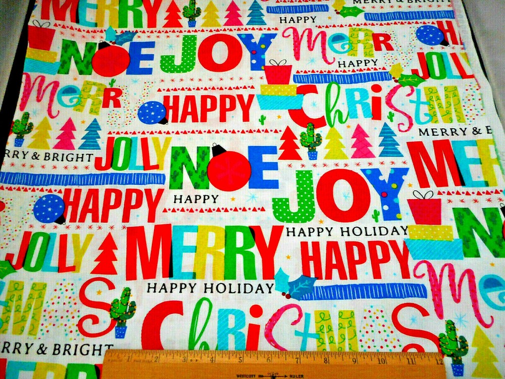 This is a very nice fabric that is 100% cotton. This a premium quilting cotton by Hobby Lobby. It has bright Christmas words or script like Joy, Merry, Holiday, Christmas, etc. on a white background. There are many colors in this fabric like red, green, blue, turquoise, pink, yellow, etc. READ: Because computer monitors show colors and shades differently, the fabric colors can vary from the photos. If you have any questions regarding this, please contact me before p urchasing the item. I have been a quilter for 30 years and am an accomplished seamstress & would be happy to answer any questions you might have. This is for a 1 7/8 Yard of Fabric. If you have a problem with anything you purchase from me, please contact me before leaving neutral or negative feedback and I will work it out with you. Payment is due within 48 hours. If payment isn't received within 5 days, it will automatically go to Ebay's resolution center for non-payment. INSTRUCTIONS FOR COMBINED SHIPPING: I Do combine shipping. You must add the items to your shopping cart and request an invoice from me using the REQUEST TOTAL BUTTON, BEFORE completing the payment process, or I won't be able to combine your shipping. Payment is due upon receipt of your invoice. Thank you for looking and God bless you and your family. IF THERE IS A PROBLEM WITH ANY PURCHASE, PLEASE CONTACT ME, THE SELLER, VIA EBAY'S MESSAGING SYSTEM PRIOR TO OPENING A CASE--OPENING A CASE, EVEN IF RESOLVED SMOOTHLY, CAN HURT THE SELLER'S RATINGS. THANK YOU