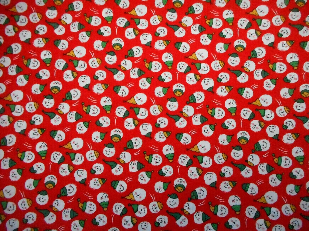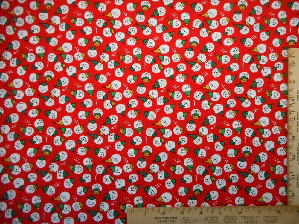 This is a very nice fabric that is 100% cotton. This fabric is out of print. It has smiling snowmen faces/heads wearing green & gold hats on a red background. READ: Because computer monitors show colors and shades differently, the fabric colors can vary from the photos. If you have any questions regarding this, please contact me before p urchasing the item. I have been a quilter for 30 years and am an accomplished seamstress & would be happy to answer any questions you might have. This is for a 1 Yard of Fabric. If you have a problem with anything you purchase from me, please contact me before leaving neutral or negative feedback and I will work it out with you. Payment is due within 48 hours. If payment isn't received within 5 days, it will automatically go to Ebay's resolution center for non-payment. INSTRUCTIONS FOR COMBINED SHIPPING: I Do combine shipping. You must add the items to your shopping cart and request an invoice from me using the REQUEST TOTAL BUTTON BEFORE completing the payment process, or I won't be able to combine your shipping. Payment is due upon receipt of your invoice. Thank you for looking and God bless you and your family. IF THERE IS A PROBLEM WITH ANY PURCHASE, PLEASE CONTACT ME, THE SELLER, VIA EBAY'S MESSAGING SYSTEM PRIOR TO OPENING A CASE--OPENING A CASE, EVEN IF RESOLVED SMOOTHLY, CAN HURT THE SELLER'S RATINGS. THANK YOU
