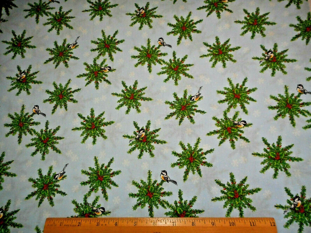 This is a very nice fabric that is 100% cotton. This fabric is out of print. It has green pine, holly, red berries & birds on a light blue background that has white snowflakes in it. READ: Because computer monitors show colors and shades differently, the fabric colors can vary from the photos. If you have any questions regarding this, please contact me before p urchasing the item. I have been a quilter for 30 years and am an accomplished seamstress & would be happy to answer any questions you might have. This is for 1 Yard of Fabric. If you have a problem with anything you purchase from me, please contact me before leaving neutral or negative feedback and I will work it out with you. Payment is due within 48 hours. If payment isn't received within 5 days, it will automatically go to Ebay's resolution center for non-payment. INSTRUCTIONS FOR COMBINED SHIPPING: I Do combine shipping. You must put your items into your shopping cart and request an invoice from me using the request total button before completing the payment process. IF YOU'RE UNABLE TO COMBINE YOUR SHIPPING, PLEASE CONTACT ME. Payment is due upon receipt of your invoice. Thank you for looking and God bless you and your family. IF THERE IS A PROBLEM WITH ANY PURCHASE, PLEASE CONTACT ME, THE SELLER, VIA EBAY'S MESSAGING SYSTEM PRIOR TO OPENING A CASE--OPENING A CASE, EVEN IF RESOLVED SMOOTHLY, CAN HURT THE SELLER'S RATINGS. THANK YOU