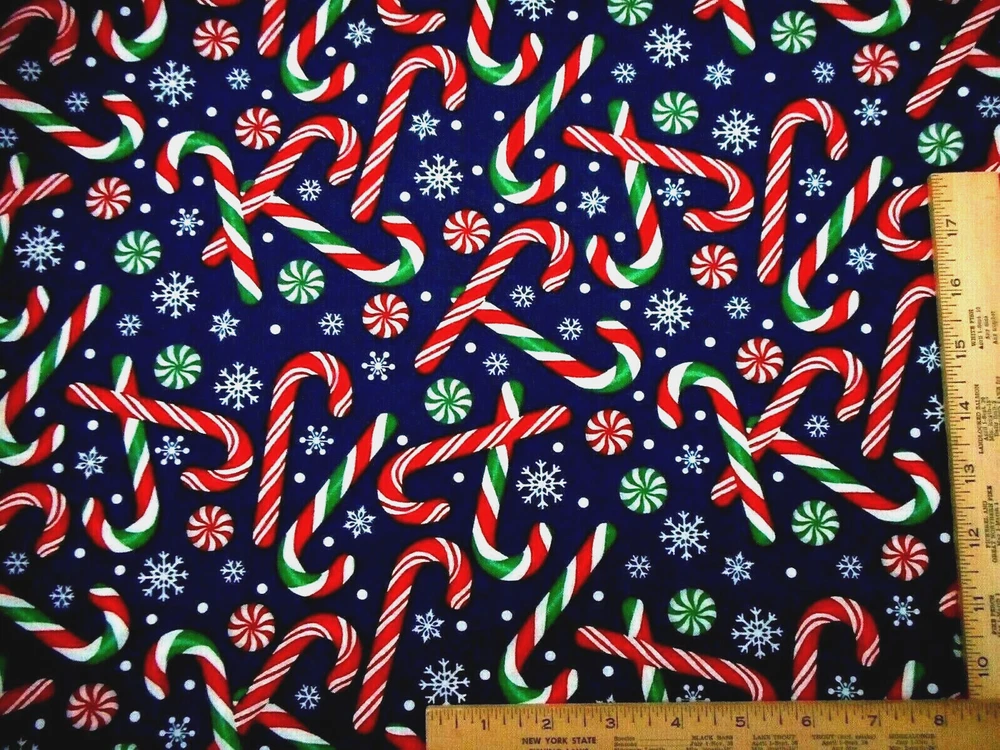 This is a very nice fabric that is 100% cotton. It has red & white & green, red & white candy canes & red & white & green & white peppermint candy with white snowflakes & dots on a navy blue background. READ: Because computer monitors show colors and shades differently, the fabric colors can vary from the photos. If you have any questions regarding this, please contact me before p urchasing the item. I have been a quilter for 30 years and am an accomplished seamstress & would be happy to answer any questions you might have. This is for a 1 Half-Yard (1/2) Fabric. If you purchase more than 1 Half-Yard, I will give you one continuous cut. If you have a problem with anything you purchase from me, please contact me before leaving neutral or negative feedback and I will work it out with you. Payment is due within 48 hours. If payment isn't received within 5 days, it will automatically go to Ebay's resolution center for non-payment. INSTRUCTIONS FOR COMBINED SHIPPING: I Do combine shipping. You must put your items into your shopping cart and request an invoice from me using the request total button before completing the payment process. IF YOU'RE UNABLE TO COMBINE YOUR SHIPPING, PLEASE CONTACT ME. Payment is due upon receipt of your invoice. Thank you for looking and God bless you and your family. IF THERE IS A PROBLEM WITH ANY PURCHASE, PLEASE CONTACT ME, THE SELLER, VIA EBAY'S MESSAGING SYSTEM PRIOR TO OPENING A CASE--OPENING A CASE, EVEN IF RESOLVED SMOOTHLY, CAN HURT THE SELLER'S RATINGS. THANK YOU