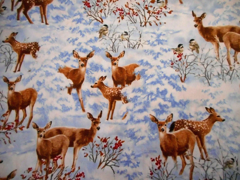 Christmas Fabric By Half-Yard Natures Holiday Deer Fawn in Snow Blue Cotton #28