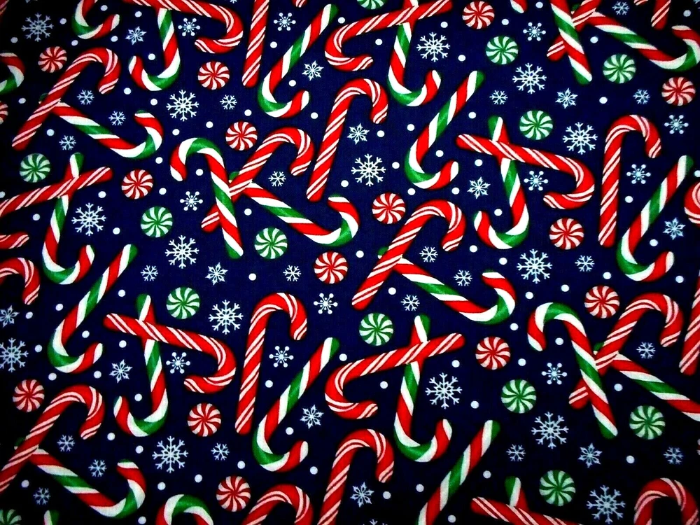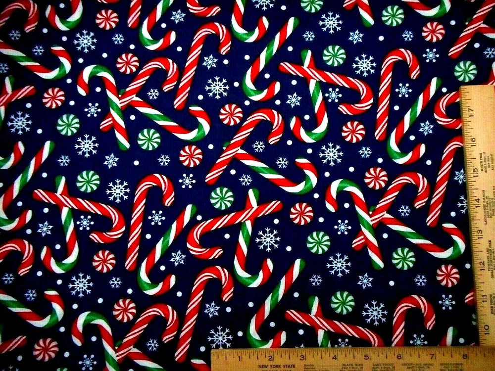 This is a very nice fabric that is 100% cotton. It has red & white & green, red & white candy canes & red & white & green & white peppermint candy with white snowflakes & dots on a navy blue background. READ: Because computer monitors show colors and shades differently, the fabric colors can vary from the photos. If you have any questions regarding this, please contact me before p urchasing the item. I have been a quilter for 30 years and am an accomplished seamstress & would be happy to answer any questions you might have. This is for a 1 Yard Fabric. If you purchase more than 1 Yard, I will give you one continuous cut. If you have a problem with anything you purchase from me, please contact me before leaving neutral or negative feedback and I will work it out with you. Payment is due within 48 hours. If payment isn't received within 5 days, it will automatically go to Ebay's resolution center for non-payment. INSTRUCTIONS FOR COMBINED SHIPPING: I Do combine shipping. You must add the items to your shopping cart and request an invoice from me using the REQUEST TOTAL BUTTON BEFORE completing the payment process. IF YOU ARE UNABLE TO COMBINE YOUR SHIPPING, CONTACT ME. Payment is due upon receipt of your invoice. Thank you for looking and God bless you and your family. IF THERE IS A PROBLEM WITH ANY PURCHASE, PLEASE CONTACT ME, THE SELLER, VIA EBAY'S MESSAGING SYSTEM PRIOR TO OPENING A CASE--OPENING A CASE, EVEN IF RESOLVED SMOOTHLY, CAN HURT THE SELLER'S RATINGS. THANK YOU