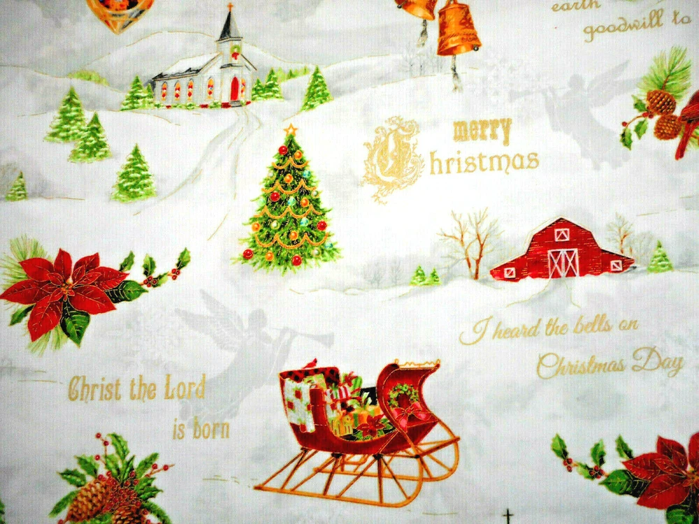 This is a very nice fabric that is 100% cotton. This is a premium quilting cotton by P & B Textiles called Christmas Chimes. It has churches, gold bells, red poinsettias, green trees & metallic gold words like Christ The Lord is Born, Glory To God, I Heard The Bells on Christmas Day, etc. on a white snowy background that has a touch of gray in it & light gray angels blowing their horns. This is a really beautiful fabric. READ: Because computer monitors show colors and shades differently, the fabric colors can vary from the photos. If you have any questions regarding this, please contact me before p urchasing the item. I have been a quilter for 30 years and am an accomplished seamstress & would be happy to answer any questions you might have. This is for a 1 Yard of Fabric. If you purchase more than 1 Yard, I will give you one continuous cut. If you have a problem with anything you purchase from me, please contact me before leaving neutral or negative feedback and I will work it out with you. Payment is due within 48 hours. If payment isn't received within 5 days, it will automatically go to Ebay's resolution center for non-payment. INSTRUCTIONS FOR COMBINED SHIPPING: I Do combine shipping. You must add the items to your shopping cart and request an invoice from me using the REQUEST TOTAL BUTTON BEFORE completing the payment process, or I won't be able to combine your shipping. Payment is due upon receipt of your invoice. Thank you for looking and God bless you and your family. IF THERE IS A PROBLEM WITH ANY PURCHASE, PLEASE CONTACT ME, THE SELLER, VIA EBAY'S MESSAGING SYSTEM PRIOR TO OPENING A CASE--OPENING A CASE, EVEN IF RESOLVED SMOOTHLY, CAN HURT THE SELLER'S RATINGS. THANK YOU