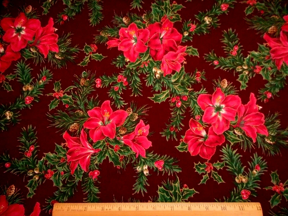 This is a very nice fabric that is 100% cotton. This fabric is out of print. It has dark pink flowers & berries, green leaves, pine, holly & pinecones all outlined in metallic gold on a maroon background. READ: Because computer monitors show colors and shades differently, the fabric colors can vary from the photos. If you have any questions regarding this, please contact me before p urchasing the item. I have been a quilter for 30 years and am an accomplished seamstress & would be happy to answer any questions you might have. This is for a 1 Yard of Fabric. If you purchase more than 1 Yard, I will give you one continuous cut. If you have a problem with anything you purchase from me, please contact me before leaving neutral or negative feedback and I will work it out with you. Payment is due within 48 hours. If payment isn't received within 5 days, it will automatically go to Ebay's resolution center for non-payment. INSTRUCTIONS FOR COMBINED SHIPPING: I Do combine shipping. You must put your items into your shopping cart and request an invoice from me using the request total button before completing the payment process. IF YOU'RE UNABLE TO COMBINE YOUR SHIPPING, PLEASE CONTACT ME. Payment is due upon receipt of your invoice. Thank you for looking and God bless you and your family. IF THERE IS A PROBLEM WITH ANY PURCHASE, PLEASE CONTACT ME, THE SELLER, VIA EBAY'S MESSAGING SYSTEM PRIOR TO OPENING A CASE--OPENING A CASE, EVEN IF RESOLVED SMOOTHLY, CAN HURT THE SELLER'S RATINGS. THANK YOU