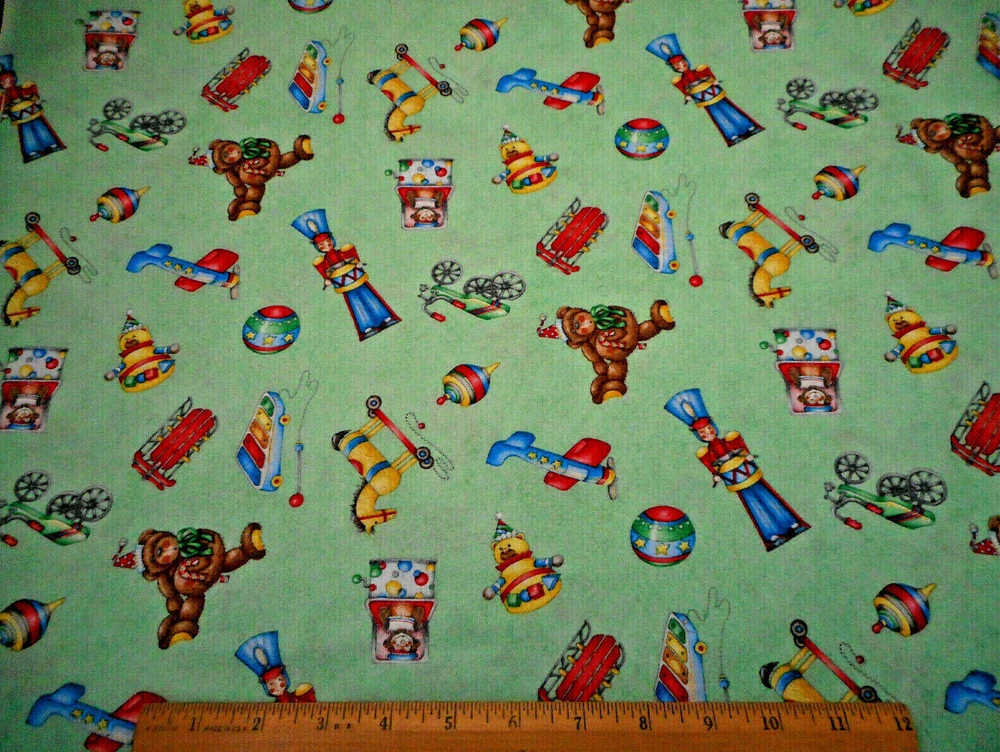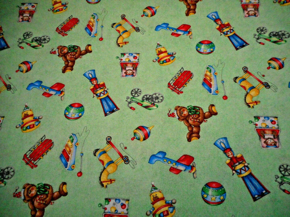 This is a very nice fabric that is 100% cotton. This is a premium quilting cotton by South Seas Imports (SSI) called Holiday Express. It has children's vintage toys on a mottled light green background. READ: Because computer monitors show colors and shades differently, the fabric colors can vary from the photos. If you have any questions regarding this, please contact me before p urchasing the item. I have been a quilter for 30 years and am an accomplished seamstress & would be happy to answer any questions you might have. This is for 1 Yard of Fabric. If you purchase more than 1 Yard, I will give you one continuous cut. If you have a problem with anything you purchase from me, please contact me before leaving neutral or negative feedback and I will work it out with you. Payment is due within 48 hours. If payment isn't received within 5 days, it will automatically go to Ebay's resolution center for non-payment. INSTRUCTIONS FOR COMBINED SHIPPING: I Do combine shipping. You must add the items to your shopping cart and request an invoice from me using the REQUEST TOTAL BUTTON, BEFORE completing the payment process, or I won't be able to combine your shipping. Payment is due upon receipt of your invoice. Thank you for looking and God bless you and your family. IF THERE IS A PROBLEM WITH ANY PURCHASE, PLEASE CONTACT ME, THE SELLER, VIA EBAY'S MESSAGING SYSTEM PRIOR TO OPENING A CASE--OPENING A CASE, EVEN IF RESOLVED SMOOTHLY, CAN HURT THE SELLER'S RATINGS. THANK YOU