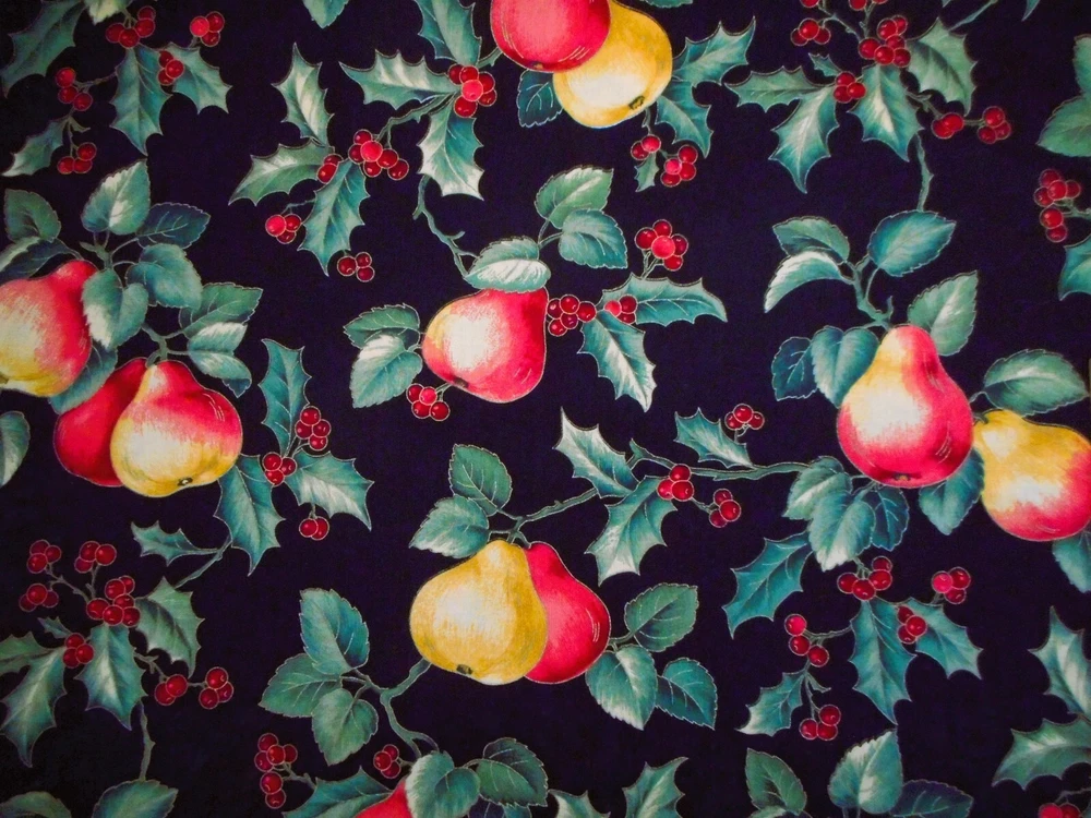 This is a very nice fabric that is 100% cotton. This Fabric is out of print. It has green holly with red berries & yellow & red pears all outlined in metallic gold on a black background. READ: Because computer monitors show colors and shades differently, the fabric colors can vary from the photos. If you have any questions regarding this, please contact me before p urchasing the item. I have been a quilter for 30 years and am an accomplished seamstress & would be happy to answer any questions you might have. This is for a 1 Yard of Fabric. If you purchase more than 1 Yard, I will give you one continuous cut. THERE IS ANOTHER 7/8 YARD ATTACHED TO THIS FABRIC & IF YOU WOULD ALSO LIKE IT, PLEASE CONTACT ME BEFORE PURCHASING & PAYING FOR THE ITEM SO I CAN ADD IN THE EXTRA 7/8 YARD ($8.75) & COMBINE SHIPPING FOR YOU. If you have a problem with anything you purchase from me, please contact me before leaving neutral or negative feedback and I will work it out with you. Payment is due within 48 hours. If payment isn't received within 5 days, it will automatically go to Ebay's resolution center for non-payment. INSTRUCTIONS FOR COMBINED SHIPPING: I Do combine shipping. You must add the items to your shopping cart and request an invoice from me using the REQUEST TOTAL BUTTON BEFORE completing the payment process, or I won't be able to combine your shipping. Payment is due upon receipt of your invoice. Thank you for looking and God bless you and your family. IF THERE IS A PROBLEM WITH ANY PURCHASE, PLEASE CONTACT ME, THE SELLER, VIA EBAY'S MESSAGING SYSTEM PRIOR TO OPENING A CASE--OPENING A CASE, EVEN IF RESOLVED SMOOTHLY, CAN HURT THE SELLER'S RATINGS. THANK YOU