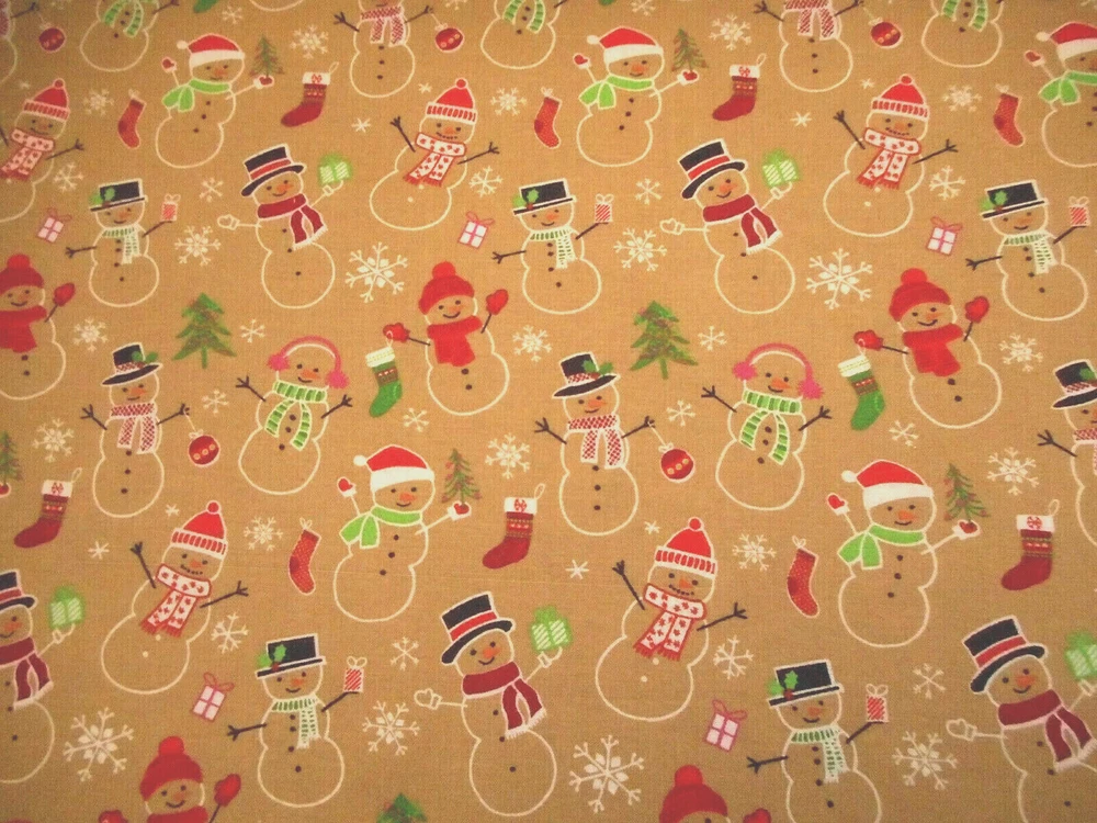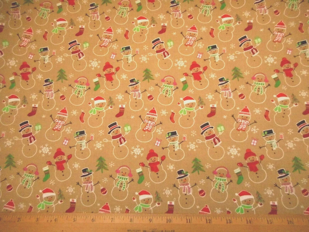 This is a very nice fabric that is 100% cotton. It has snowmen holding trees, gifts, stockings, etc. with tossed white snowflakes on a tan background. Computer monitors show colors and shades differently. If you have any questions regarding this, please contact me before p urchasing the item. I have been a quilter for 30 years and am an accomplished seamstress & would be happy to answer any questions you might have. This is for a 1 Yard of Fabric. If you purchase more than 1 Yard, I will give you one continuous cut. If you have a problem with anything you purchase from me, please contact me before leaving neutral or negative feedback and I will work it out with you. Payment is due within 48 hours. If payment isn't received within 5 days, it will automatically go to Ebay's resolution center for non-payment. INSTRUCTIONS FOR COMBINED SHIPPING: I Do combine shipping. You must add the items to your shopping cart and request an invoice from me using the REQUEST TOTAL BUTTON BEFORE completing the payment process. IF YOU ARE UNABLE TO COMBINE YOUR SHIPPING, CONTACT ME. Payment is due upon receipt of your invoice. Thank you for looking and God bless you and your family. IF THERE IS A PROBLEM WITH ANY PURCHASE, PLEASE CONTACT ME, THE SELLER, VIA EBAY'S MESSAGING SYSTEM PRIOR TO OPENING A CASE--OPENING A CASE, EVEN IF RESOLVED SMOOTHLY, CAN HURT THE SELLER'S RATINGS. THANK YOU