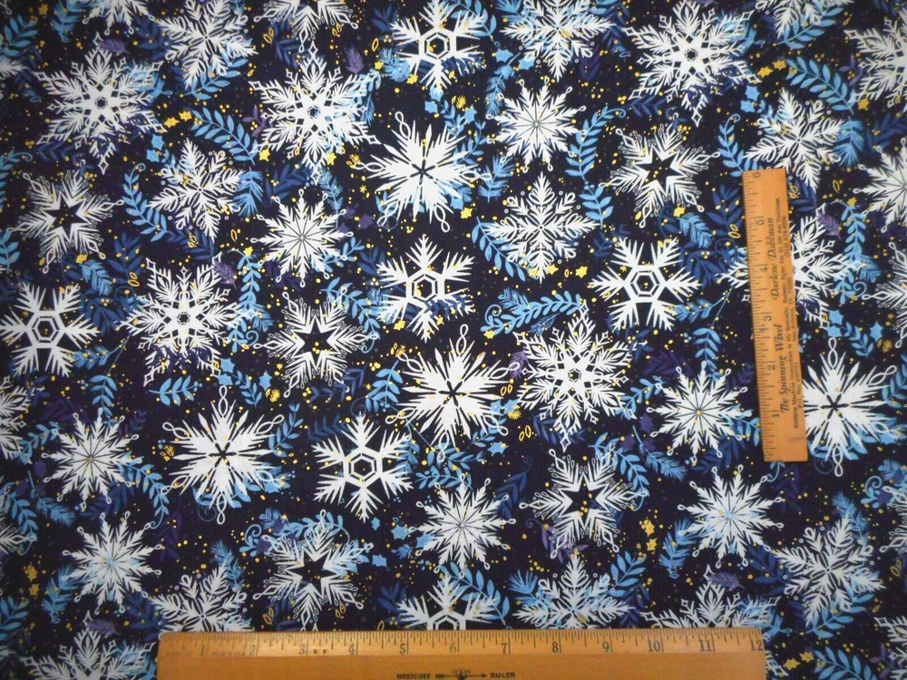 This is a very nice fabric that is 100% cotton. This is a premium quilting cotton by Brother & Sister Design Studio. It has white snowflakes, blue leaves & metallic gold on a navy blue background. READ: Because computer monitors show colors and shades differently, the fabric colors can vary from the photos. If you have any questions regarding this, please contact me before p urchasing the item. I have been a quilter for 30 years and am an accomplished seamstress & would be happy to answer any questions you might have. This is for a 1 Yard of Fabric. If you purchase more than 1 Yard, I will give you one continuous cut. If you have a problem with anything you purchase from me, please contact me before leaving neutral or negative feedback and I will work it out with you. Payment is due within 48 hours. If payment isn't received within 5 days, it will automatically go to Ebay's resolution center for non-payment. INSTRUCTIONS FOR COMBINED SHIPPING: I Do combine shipping. You must add the items to your shopping cart and request an invoice from me using the REQUEST TOTAL BUTTON BEFORE completing the payment process, or I won't be able to combine your shipping. Payment is due upon receipt of your invoice. Thank you for looking and God bless you and your family. IF THERE IS A PROBLEM WITH ANY PURCHASE, PLEASE CONTACT ME, THE SELLER, VIA EBAY'S MESSAGING SYSTEM PRIOR TO OPENING A CASE--OPENING A CASE, EVEN IF RESOLVED SMOOTHLY, CAN HURT THE SELLER'S RATINGS. THANK YOU