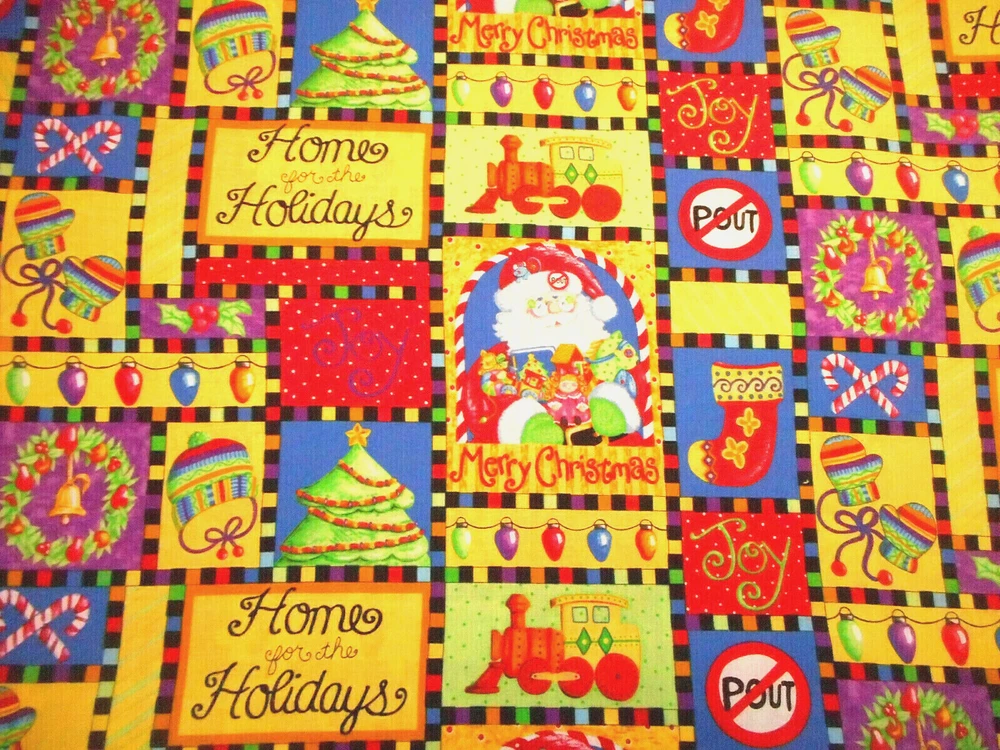 This is a very nice fabric that is 100% cotton. This fabric is out of print. It has Santa, candy canes, Xmas trees, wreaths, mittens, home for the holidays, joy, etc. in yellow, green, red, dark blue & purple patches. There are a lot of colors in the fabric but the main ones are red, green, blue, yellow & purple. READ: Because computer monitors show colors and shades differently, the fabric colors can vary from the photos. If you have any questions regarding this, please contact me before p urchasing the item. I have been a quilter for 30 years and am an accomplished seamstress & would be happy to answer any questions you might have. This is for a 1 Yard of Fabric. If you purchase more than 1 Yard, I will give you one continuous cut. THERE IS ANOTHER 1 7/8 YARD ATTACHED TO THIS FABRIC & IF YOU WOULD ALSO LIKE IT, PLEASE CONTACT ME BEFORE PURCHASING & PAYING FOR THE ITEM SO I CAN ADD IN THE EXTRA 1 7/8 YARD ($16.99) & COMBINE SHIPPING FOR YOU. If you have a problem with anything you purchase from me, please contact me before leaving neutral or negative feedback and I will work it out with you. Payment is due within 48 hours. If payment isn't received within 5 days, it will automatically go to Ebay's resolution center for non-payment. INSTRUCTIONS FOR COMBINED SHIPPING: I Do combine shipping. You must add the items to your shopping cart and request an invoice from me using the REQUEST TOTAL BUTTON BEFORE completing the payment process, or I won't be able to combine your shipping. Payment is due upon receipt of your invoice. Thank you for looking and God bless you and your family. IF THERE IS A PROBLEM WITH ANY PURCHASE, PLEASE CONTACT ME, THE SELLER, VIA EBAY'S MESSAGING SYSTEM PRIOR TO OPENING A CASE--OPENING A CASE, EVEN IF RESOLVED SMOOTHLY, CAN HURT THE SELLER'S RATINGS. THANK YOU