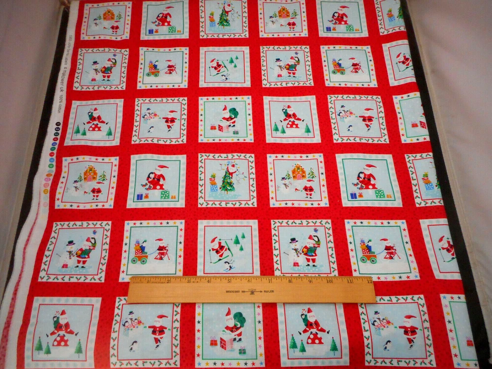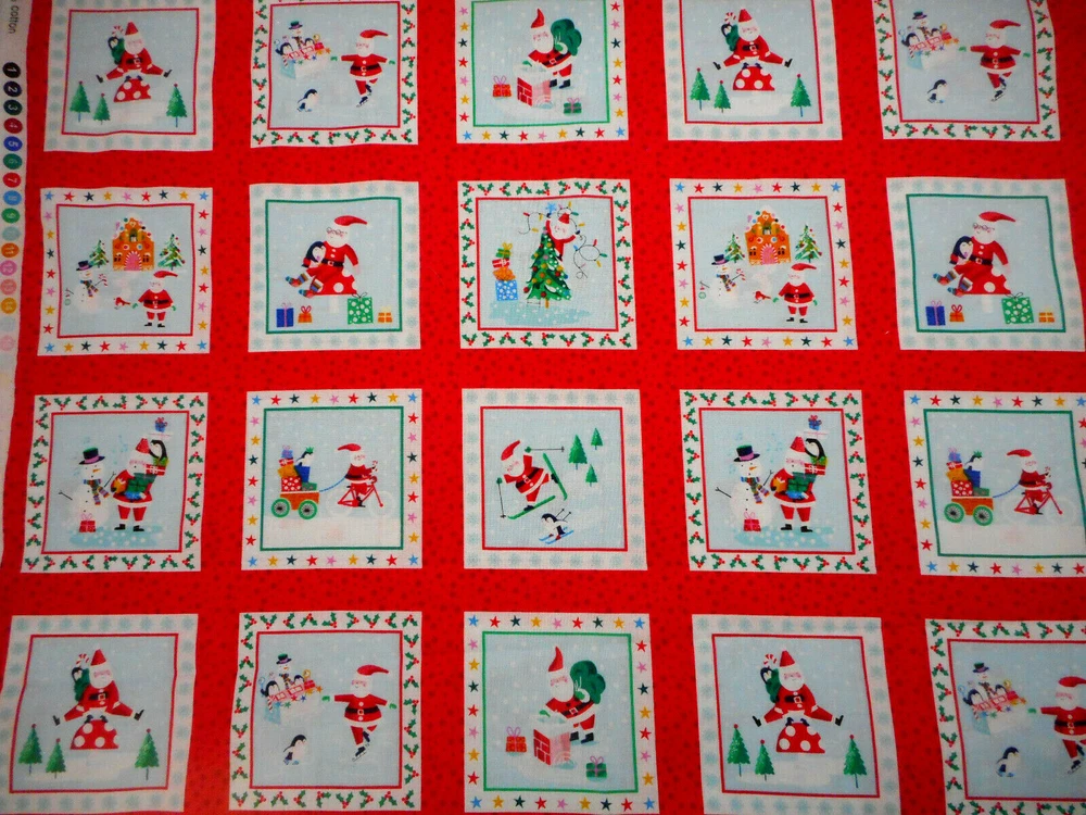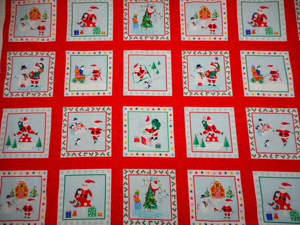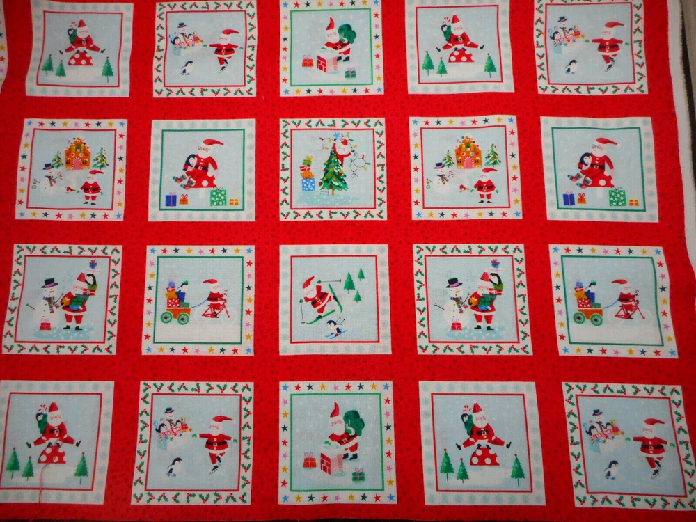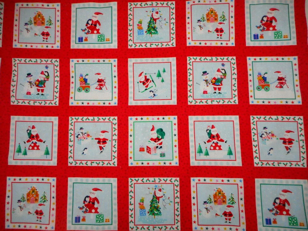 This is a very nice fabric that is 100% cotton. This is a premium quilting cotton by Makower called Jolly Santa Labels. There are 66 squares that are approx 3.24" square that have red borders. The background of this squares is light blue. READ: Because computer monitors show colors and shades differently, the fabric colors can vary from the photos. If you have any questions regarding this, please contact me before p urchasing the item. I have been a quilter for 30 years and am an accomplished seamstress & would be happy to answer any questions you might have. This is for a Fabric Panel that is approx 23.5 x 44". If you have a problem with anything you purchase from me, please contact me before leaving neutral or negative feedback and I will work it out with you. Payment is due within 48 hours. If payment isn't received within 5 days, it will automatically go to Ebay's resolution center for non-payment. INSTRUCTIONS FOR COMBINED SHIPPING: I Do combine shipping. You must put your items into your shopping cart and request an invoice from me using the request total button before completing the payment process. IF YOU'RE UNABLE TO COMBINE YOUR SHIPPING, PLEASE CONTACT ME. Payment is due upon receipt of your invoice. Thank you for looking and God bless you and your family. IF THERE IS A PROBLEM WITH ANY PURCHASE, PLEASE CONTACT ME, THE SELLER, VIA EBAY'S MESSAGING SYSTEM PRIOR TO OPENING A CASE--OPENING A CASE, EVEN IF RESOLVED SMOOTHLY, CAN HURT THE SELLER'S RATINGS. THANK YOU