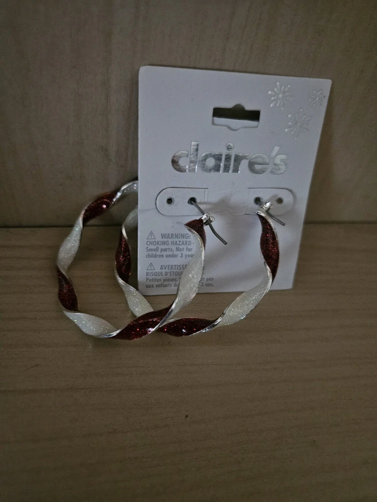 These festive hoops earrings are from the brand Claire's and feature a round shape with a Christmas theme in red and white colours. The earrings are made of steel and are designed in Great Britain. Perfect for adding a touch of holiday cheer to any outfit.