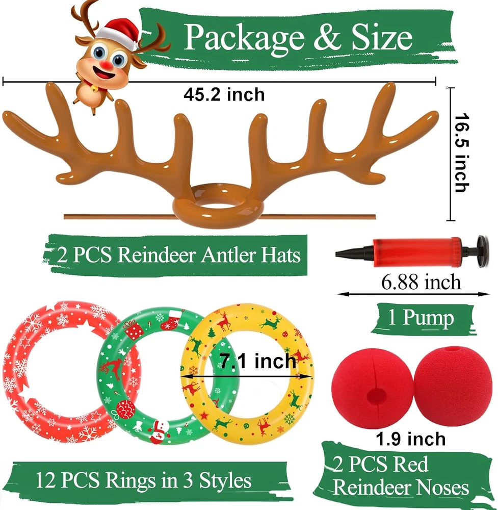 Christmas Games for Kids and Adults: Perfect for engaging everyone at your holiday party, from children to adults, ensuring fun for all ages. Whether it's Christmas games for kids or Christmas games for adults, this set has it all Reindeer Antler Ring Toss Game Set: Includes 2 inflatable reindeer antler hats, 12 inflatable rings in various colors, 2 red reindeer noses for added holiday fun, and a handy air pump for quick and easy setup Christmas Party Games for Adults and Kids: A great addition to any Christmas event, from Christmas party games for adults to fun Christmas games for kids. It brings everyone together for a lively holiday experience Christmas Games for Families: A fun-filled reindeer toss game that encourages family bonding and teamwork. It's the perfect Christmas party game to create cherished holiday memories Easy to Inflate and Deflate: The inflatable reindeer antler ring toss game is quick to inflate and deflate. This reindeer ring toss game is a perfect addition to your reindeer games collection. Whether you're playing with family, kids, or adults, the reindeer games inflatable setup guarantees holiday fun Product Description Funny Christmas Games for Kids & Adults 1 Christmas Games 2 Kids Fun 3 Indoor Party Games 4 Outdoor Party Games 5 Christmas Gift