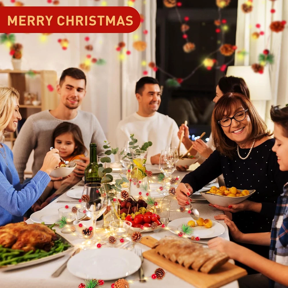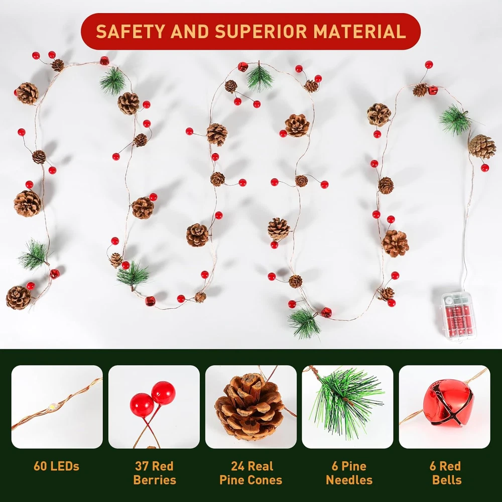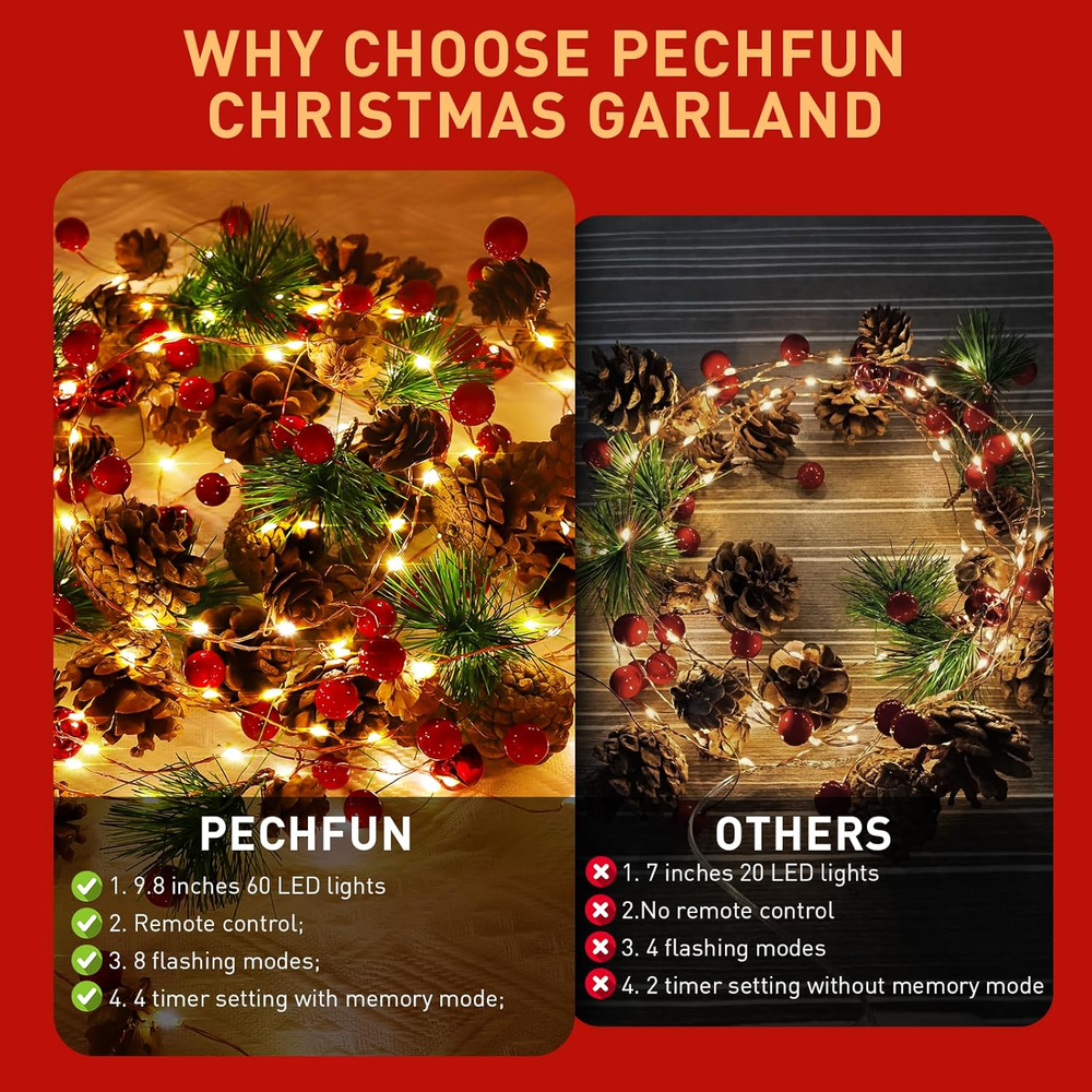 UPGRADED VERSION: ①9.8 FT (3M) with 60 LED lights, which are twice as bright as the other lighted Christmas garland; ②Remote control; ③8 flashing modes; ④4 timer setting with memory mode; ⑤4 brightness adjustments; ⑥4 flash - speed adjustments; HIGH QUALITY AND REALISTIC: Our Christmas garland with lights are more dense, have a fuller shape and crafted with an array of rich Christmas elements, 37 red berries, 6pine needles, 24 pine cones, and 6 Christmas bells. Not only adds a warm touch to your home but also fills the air with a festive Christmas atmosphere. INTELLIGENT REMOTE CONTROL: The Christmas garland with remote makes it easier to control lights on and off, adjust the brightness, set 8 flashing modes,and the auto on/off timer (2/4/6/8 hour). (Note: Please let the remote is aimed at the battery box.) SAFE AND DURABLE: Our battery operated garland with lights are strung together by 4 copper wires, long life and low heat generation, you and family can enjoy the holiday atmosphere without worry. The lights are powered by batteries, and both are IP44 waterproof. You can use it outdoor without worrying about the wires. (Note please: 3AA Battery not included) BEST CHRISTMAS DECORATIONS: The extra-long indoor Christmas garland is perfect for decorating fireplaces, stair railings, tables, cabinets, door frames, porches, balconies, TV cabinets, Christmas trees, shop windows, and more. It is an ideal complement to your Christmas decorations. Product description The Christmas lighted garland symbolizes the joy and spirit of Christmas, spreading cheer and happiness all around.