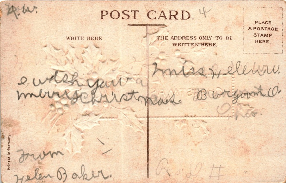 The postcard is a Christmas greeting card from 1903, printed in Germany. It is addressed to Missy Eleven and signed by Helen Baker, wishing her a merry Christmas. The front of the postcard has a festive design with the words CHRISTMAS Greetings and a space for a postage stamp.