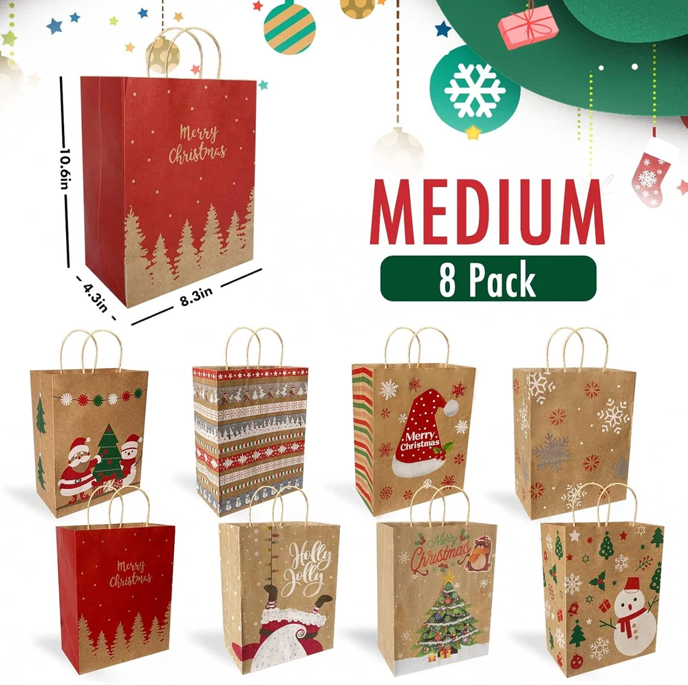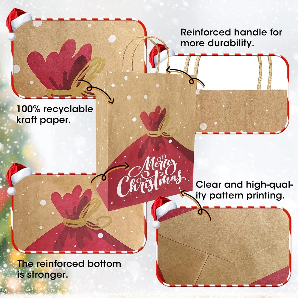 Store New Arrivals Add to Favorite View Feedback Contact Christmas Gift Bags 24 Pack, Christmas Kraft Paper Bags Bulk with Handles 24 Styles, Assorted Sizes Bag Set with 50 Tags, Xmas Holiday Paper Bags & Goody Bags, Favor Bags (8 Large, 8 Medium, 8 Small) Description Unit Count 24.0 Count Number of Items 24 Color Red, Green, White Product Dimensions 12.9"L x 10.2"W x 4.7"H Material Paper Country of Origin China Package Dimensions 16.54 x 13.5 x 2.83 inches Item Weight 1.85 pounds Theme Patterns Occasion Christmas Brand Bavcieu Cartoon Character Santa Claus Included Components Christmas Gift Bags, Gift Tags 【Great Value 24 Pack】Christmas Kraft Paper Bags includes 24-count Christmas Gift Bags and Extra 50-count Gift Tags. Christmas gift bags Designed with handles, is very convenient to carry. And the decoration of the bag with the tags is more beautiful and the festive atmosphere is stronger. 【24 Different Patterns Design】24 Pack Christmas Gift Bags with 24 patterns. There are many classical Christmas elements, including Santa Claus, reindeer, snowman, Christmas tree, pine, Christmas socks, bells, merry Christmas, snow wreath, etc. 【3 Sizes of Christmas Gift Bags】Christmas Gift Bags has Assorted Sizes. Large: 12.9" L x 10.2" W x 4.7" H (8 Pack), Medium: 10.6" L x 8.3" W x4.3" H ( 8 Pack), Small: 8.3" L x 5.9" W x 3.1" H (8 Pack). 【Premium Materials】Christmas gift bags are made of Upgraded thickening Premium Kraft Paper bags, durable, unbreakable, sturdy, and can be reused. Brown paper bags look textured and are more advanced and environmentally friendly than plastic bags. 【Multiple Uses】Christmas paper bags with handles are perfect for items such as mugs, scents, small dolls, and picture frames. Gift bags can be used as Christmas gift bags or Christmas decorations, but also as everyday shopping bags, both convenient and environmentally friendly. Product Description If you have any questions about product, please tell us. We will provide you with a satisfactory solution within 24 hours. Package Included: Christmas gift bag (Large x 8) Christmas gift bag (Medium x 8) Christmas gift bag (Small x 8) Gift Tag & Gift Tags Rope x 50 Bavcieu 24 Pack Christmas Gift Bags are perfect for Xmas or other festive occasions. It's a great choice for packing gifts for family and friends. 24 Pack Christmas Gift Bags Size 1- Large:12.9" L x 10.2" W x 4.7" H (8 Pack) Size 2- Medium:10.6" L x 8.3" W x4.3" H ( 8 Pack) Size 3- Small:8.3"L x 5.9" W x 3.1" H (8 Pack) 50 Pack Gift Tags Tag 1- Rectangle:12.9" L x 10.2" W x 4.7" H (35 Pack) Tag 2- Round:10.6" L x 8.3" W x 4.3" H ( 10 Pack) Tag 3- Strip:8.3" L x 5.9" W x 3.1" H (5 Pack) Rope:9.8" W/PCS (50 Pack) Each size contains 8 different patterns, 3 sizes have a total of 24 patterns. Share Happiness Christmas gift bags consist of 24 different patterns of gift bags, Every pattern is unique, It is easy to distinguish and give your family or Friends a different surprise. Various Occasions Christmas kraft paper bags with tags are great for Christmas party favors, home, office, classroom, Christmas tree, holiday, festival, wedding, baby shower, and birthday decorations, to create a Christmas ambiance. Perfect Capacity Christmas gift bags have 3 size match all your special packing requests, you can use them to hold Xmas gifts perfectly like toys, candies, shoes, gift cards, wine, scarf, A4 size or larger books, and so on. ABOUT US We offer the best prices around on high quality products. Our E-store includes media such as books, movies, music and games while offering electronics, toys, sporting apparel, clothing, tools, general home, garden items and more. SHIPPING We are always working hard to ensure your package arrives as soon as possible. Please understand that some factors like weather, high postal traffic, and the performance of shipping companies are outside of our control. We offer free shipping to the lower 48 states and ship within 2 business days of payment, usually sooner. We do not accept P.O. Boxes. Please provide a physical address. RETURNS We offer a 30-Day Return Policy on items which you are not completely satisfied with. You have the option for a full-refund or an exchange of the item. No returns are available on items shipped outside of the USA. PAYMENT We accept PayPal. CONTACT US This page content is yet to come Please ad us to your favorite seller and visit again later Thank You CUSTOMER SATISFACTION We try our very best to make sure every customer is completely satisfied. If there's a problem, message us! We're happy to help.