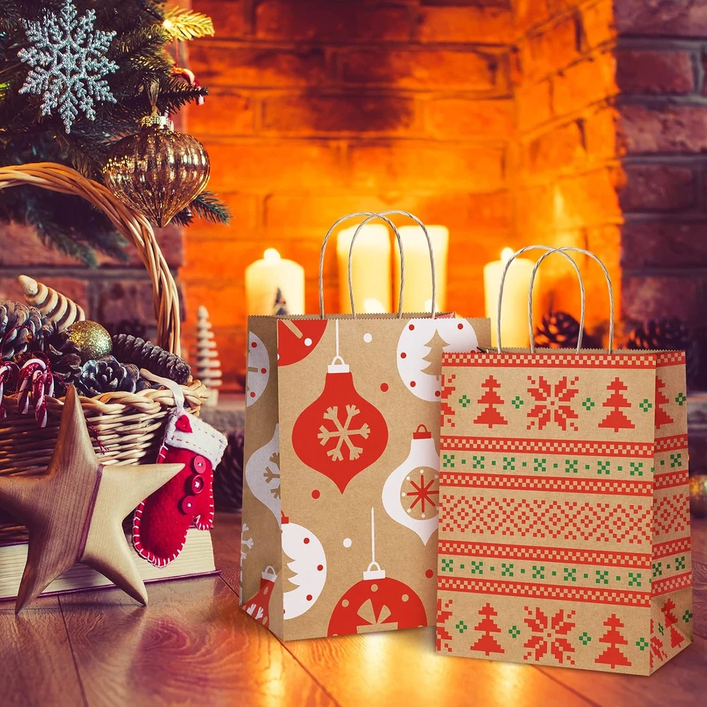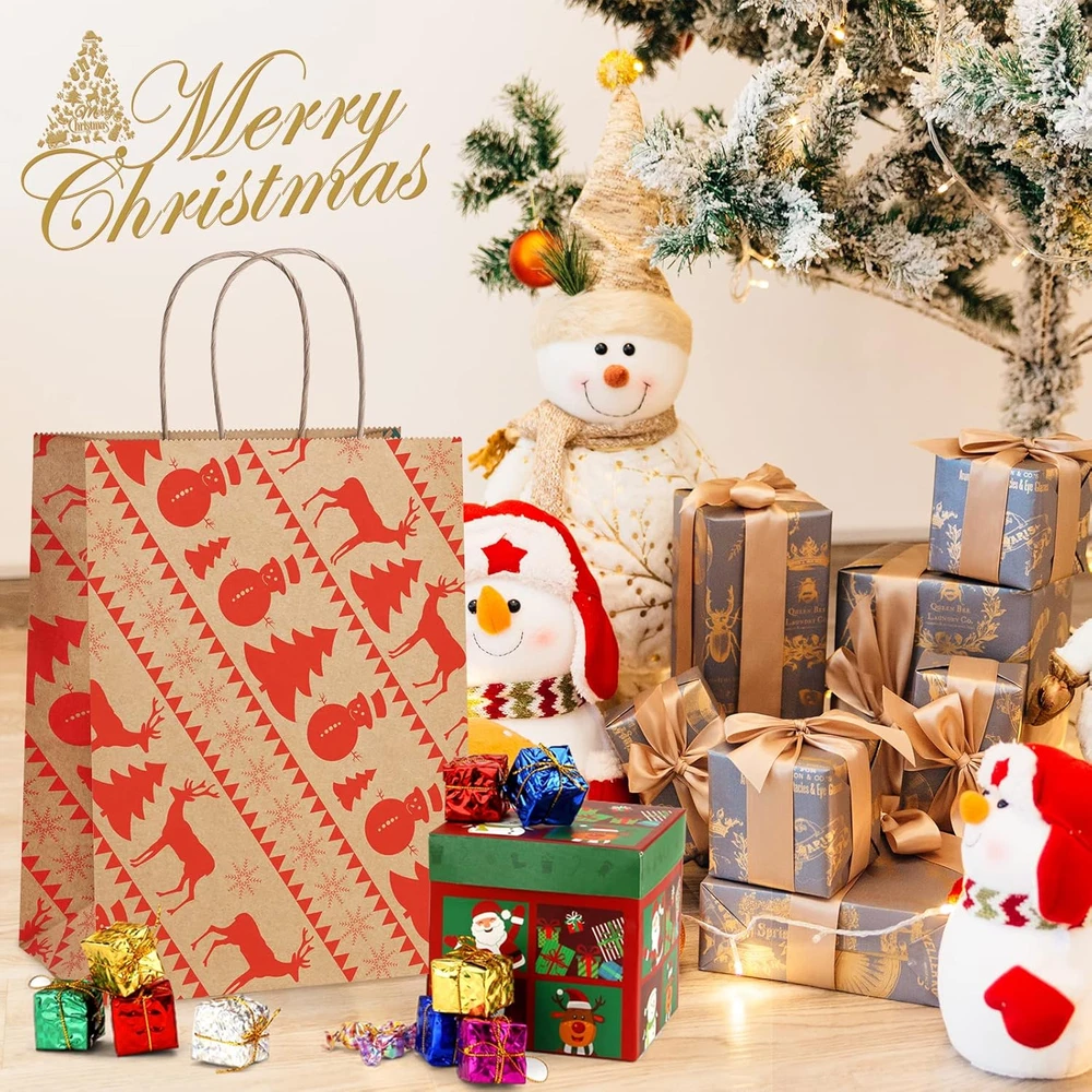 24 Gift Bags Provide 6 Assorted Christmas Designs. Red and green pattern elements provide a strong holiday atmosphere, making it super ideal to hold special presents for Christmas holiday. Suitable for wrapping gifts to your neighbors, teachers, families, friends, customers and so on. Gift Bags Medium Size. 8x4.25x10.5". These Christmas paper bags are perfect for Christmas parties or gifts decoration, Christmas gifts or gift boxes wrapping, Christmas Trees, Classrooms, Party Favors. Attractive design and sturdy material. A good Christmas paper gift bag option. Premium Christmas Kraft Gift Bags. Holding up to 8lbs, these sturdy kraft gift bags are made of 110g basis weight paper and have well constructed paper twist handles. No stray glue any where and the flat solid bottom can make it stand easily. Eco-friendly Christmas Paper Bags. These brown Xmax gift bags are made of Recycled Paper. FSC COMPLIANT. BagDream kraft Christmas gift bags are RECYCLABLE, no peculiar smell and look classier as gifts bags. Shopping Worry-free. We never want to make our valued customers disappointed. If there's any reasons you’re not happy with our Christmas gift bags, just email us and we’ll fix it up asap. Please keep these santa bags to avoid the hassle of shipping them back. Product Description BagDream 8X4.25X10.5" Christmas Gift Bags 24PCS Dust-Free Production Crafted in a specialized dust-free workshop, ensuring the highest quality for every paper bag. Load-Bearing Strength Each batch undergoes rigorous load-bearing tests, guaranteeing reliable performance with every use. Precision Craftsmanship Featuring imported adhesive on the bottom and handles, our paper bags are engineered for exceptional durability and strength. Christmas Paper Gift Bags Details Package of X-mas brown gift bags: 6 patterns and 4 bags per pattern. You will get pack of 24pcs gift bags. Paper bags with handles: 110g basis weight. Made of Recycled Paper with a serrated top edge. Christmas paper gift bags: Red and green color elements provide a strong holiday atmosphere, making it super ideal to hold special presents for Christmas holiday. Perfect for Christmas gift bags or party favor bags.