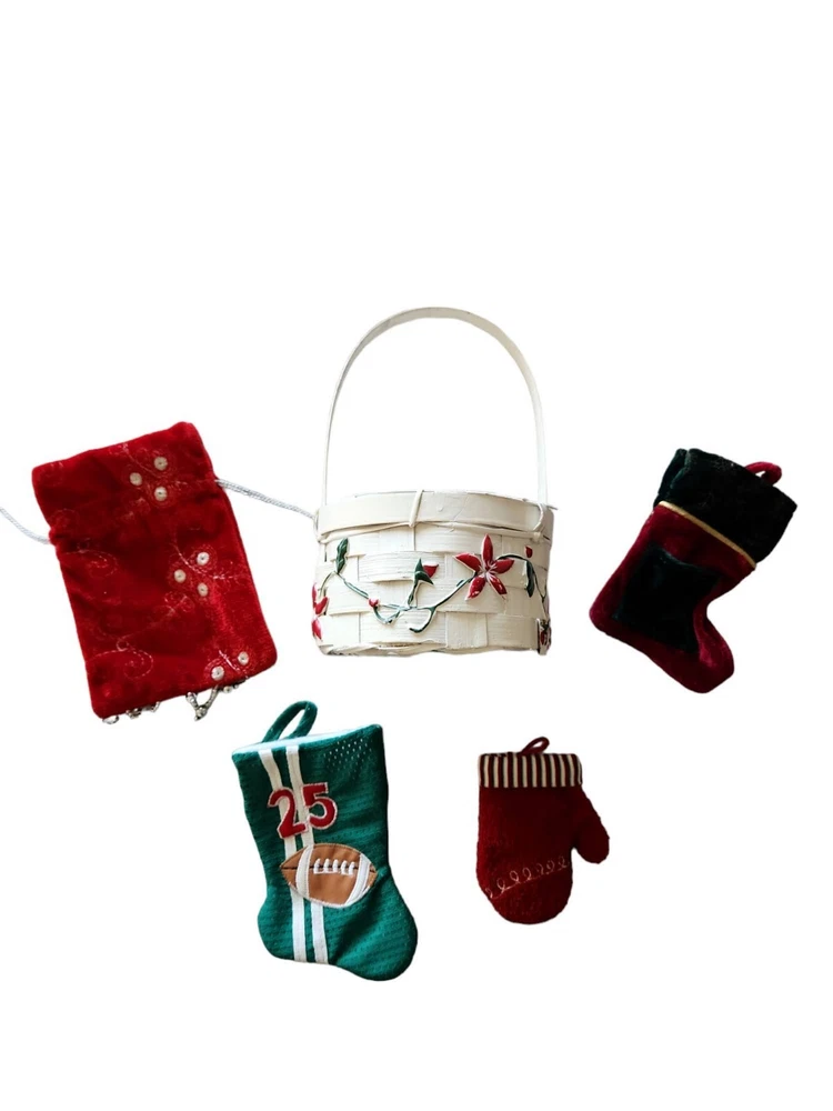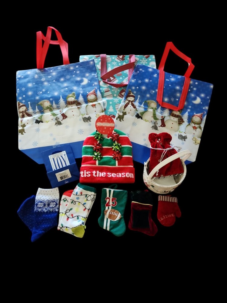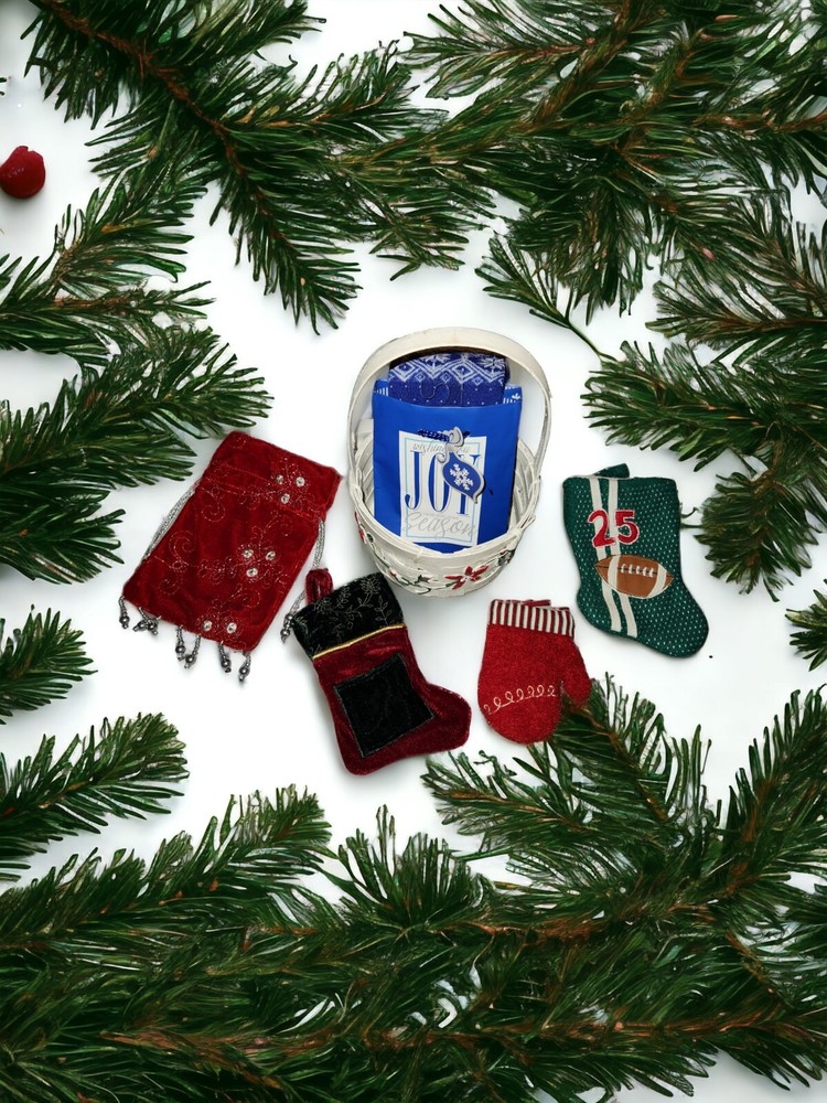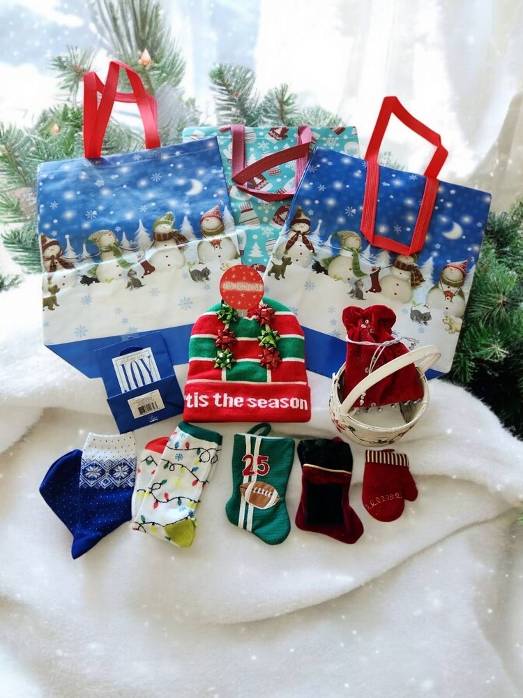 Christmas Gift Card Holders/Gift Bag Assortment w/ Christmas Socks and Christmas Beanie This Christmas, surprise your loved ones with these beautifully designed gift pouches. Made with high-quality cloth, paper, and velvet material, these gift card holders come in various colors and are perfect for small-sized gifts. The contemporary style and solid pattern make them an ideal choice for all adult family members. These gift pouches are perfect for any occasion, especially Christmas. The assortment includes different sizes to accommodate your gift needs. The vintage-inspired design adds a touch of nostalgia to your presents, while the personalized option allows you to add your own touch. Make your gift-giving experience even more special with these Christmas gift card holders. Hang on Tree-Assorted Sizes (Good Quality) 1) Red Pouch-6.75" x 5" 2) Green Football Stocking-5.25" x 4" 3) Dark Red/Green Stocking with Pouch-5" x 3.5" 4) Red Terry Mitt Stocking- 4" x 2.5" 5) Blue/White "Joy" Snowflake Paper Gift Bag 5"H x 4"L 6) Blue/White Snowflake Socks (one pair) 7) White Christmas-Light Socks (one pair) 8) Tis the Season Red-Green Christmas Beanie (one size) 9) Beautiful Mini White "Holly" Basket 5"W x 3"D x 3"H ( 9"H Top to Bottom) 10) Three (3) Resusable Large Gift Bags w/Handle -Size 15"x14"x 6" Note: Gift Cards Not Included