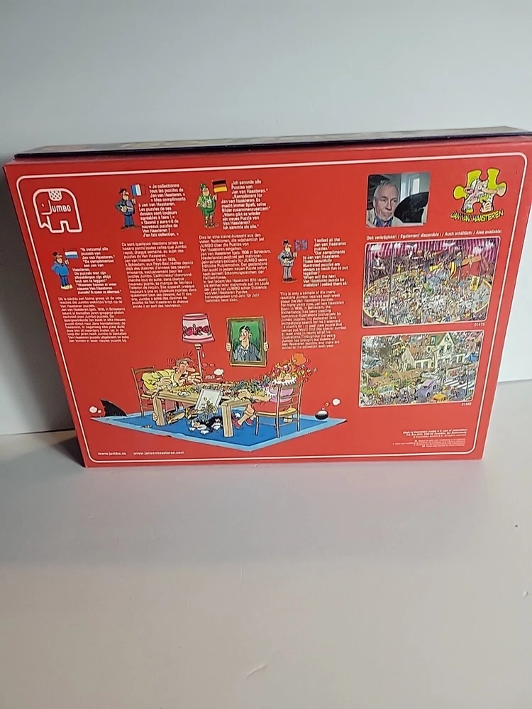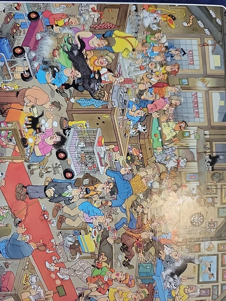 The Dogshow 2009 90cm x 60cm Rare puzzle Jumbo Was assembled 1x and bagged neatly Puppy cats dogs Grooming pets puppy pup fun fun puzzle to assemble Jan Van Haasteran Jigsaw Puzzles Jan Van Haasteran Puzzles - Jan Van Haasteren was born in 1936, in Schiedam, The Netherlands. He has been creating humorous illustrations exclusively for Jumbo puzzles. His dedicated fans immediately search for his trademark – a shark fin – in each new jigsaw puzzle that comes out! Jigsaw puzzles by Jan Van Haasteran are a joy to put together! Jan Van Haasteren creates cartoon jigsaw puzzles that are crowded, silly, and even include a secret hidden shark fin. Jan Van Haasteren puzzles on sale now! Jan van Haasteren is a comic artist who has created these crowded and funny cartoon puzzles that are very silly and enjoyable even for adults. Every cartoon he creates features a hidden shark fin, can you find i