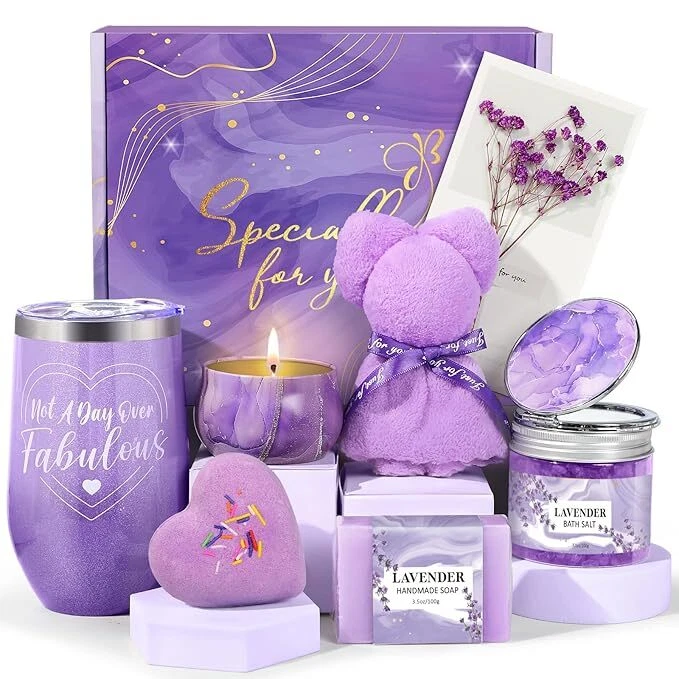 Christmas Gifts Set for Women,Self Care Basket Bath Sets for Women ,Relaxing Spa Gift Basket Set for Her Mom Sister Wife Best Friend Happy Birthday Gifts Basket for Women Item Description Practical 8pcs Gifts Set for Women: This dazzling well-designed gift box contains 8 adorable and unique gifts for women, it contains 1*beautiful 20oz wine tumbler, 1*portable mirror, 1* scented candle , 1*bear shaped towel, 1* bath bomb, 1*bath salt, 1*handmade soap, 1*greeting card Practical and Exquisite Tumbler: This gift set for women includes a large capacity stainless steel tumbler with straw and lid for cold and hot drinks, it's portable to enioy a variety of coffee, juice, milk and more anywhere Impressing Gift for Women : This exquisite gift packet is exclusive designed, it is perfect for mom, friends, sister,wife,girl friend or anyone who you care, is a great self care gifts for women,why not express your love by this gift Relaxing Gifts for Women:This gift set is a great surprise for women. The beautiful purple gift box includes 8 great gifts for women ,which is suitable for all occasions such as Birthday, Mother’s Day, Valentine's Day, Anniversary, Graduation and Christmas Relaxing SPA Gift Set:Finish the exhausting work and enjoy a delightful spa! Our scented candles and bath salt are made with natural ingredients, it's a great SPA gift for women,she will love this thoughtful gift › See more product details This large capacity stainless steel tumbler with straw and lid for cold and hot drinks, it's portable to enioy a variety of coffee, juice, milk and more Our scented candles is made with natural ingredients, it's a great SPA gift for women,she will love this thoughtful gift Try enjoying the relaxation and comfort of a bath with natural bath salts and handmade soaps - what a perfect gift! Payment We accept payment only through PAYPAL Shipping We ship products worldwide through standard express courier service, it will reach within 7 to 10 days to abroad buyers, we ship the product after recieved clear payment and give full information about shipment to the buyer Return We accept product return within 7 to 21 days from delivery date but product should be in original position and not in damaged condition,the return shipping charges will be buyer responsibility