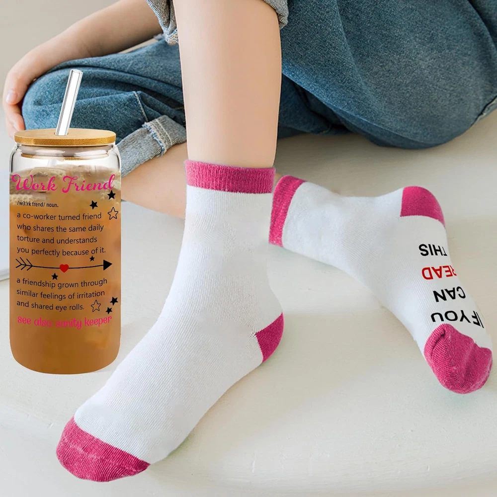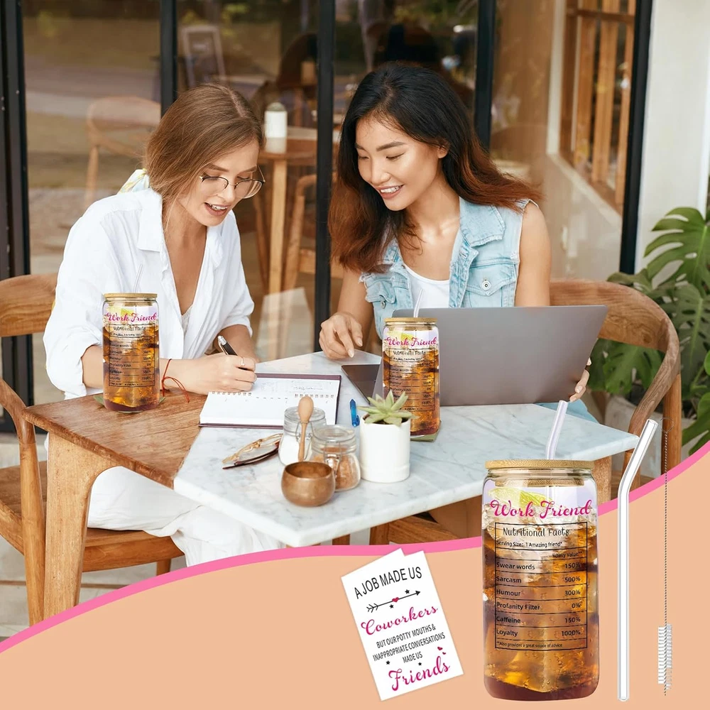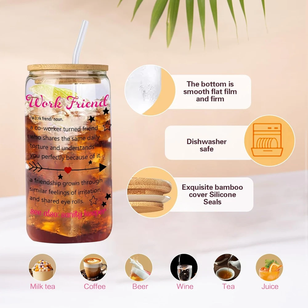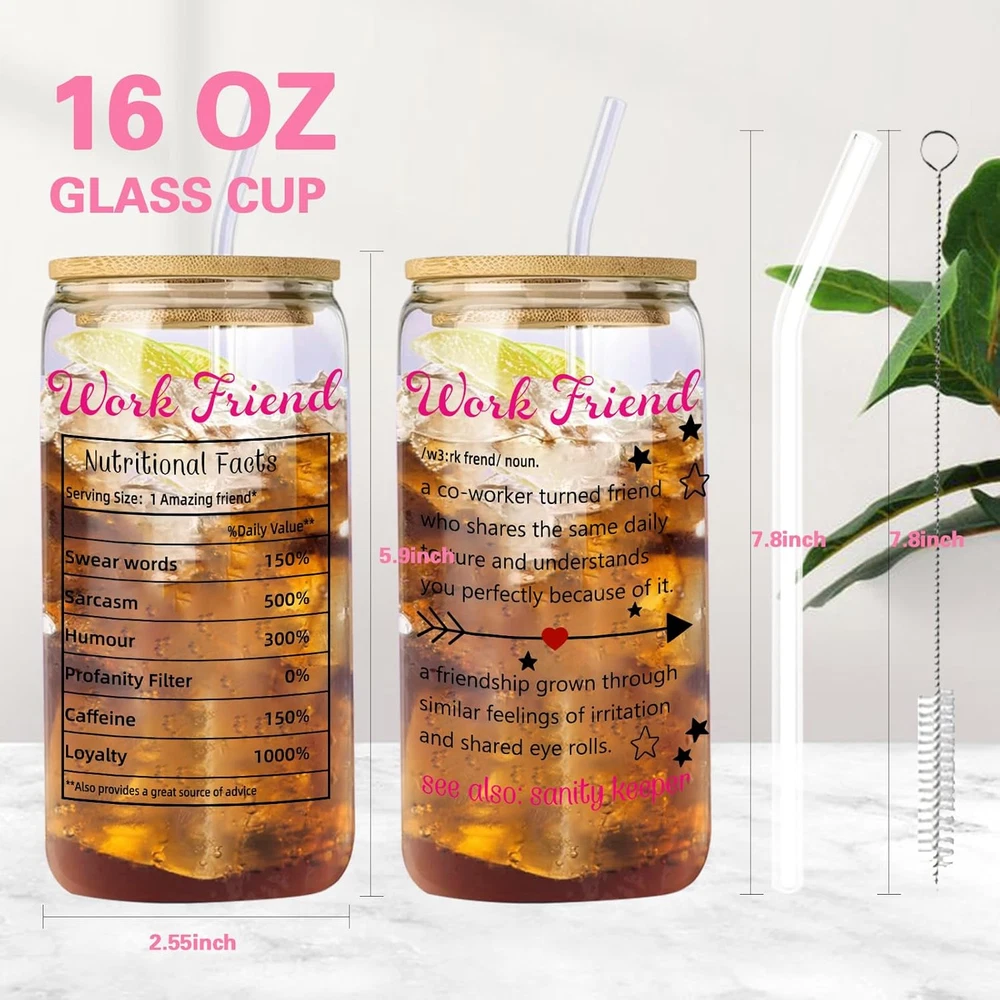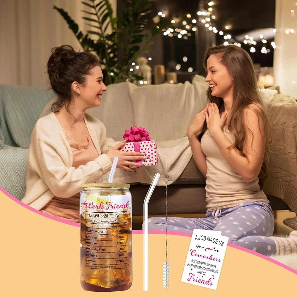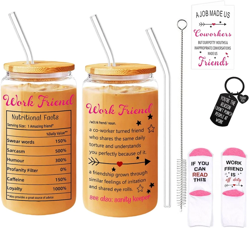 1.Coworker gifts for women : Gift for coworkers female include 1 * 16 ounce glass cup, 1 * lid, 1 * glass straw, 1 * keychain, 1 * greeting card, and a pair of socks. This carefully planned gift box can help you express your gratitude, congratulations, encouragement, etc. to special people in your life, making others feel your heart 2.High quality materials : Our coworker gift glass cup comes with a lid, straw, and straw brush. Made with high-quality materials, it can be used to hold your favorite drinks such as beer, milk tea, coffee, juice, soda, etc., without transferring the flavor of the drink. It is a safe gift 3.Unique cool gifts for coworkers : Give this gift box to your coworker women to express your gratitude, encouragement, appreciation, and other feelings towards them. They must be very surprised and filled with warmth when they receive this gift, and feel that they are special and can enhance your relationship 4.Wide application scenarios : This co worker gifts for woman is suitable for companies, such as giving to colleagues, giving to departing colleagues, giving to newly hired colleagues, giving from superiors to subordinates, giving from subordinates to superiors, etc. It is suitable for any unit to express your feelings for them 5.Make People Happy : When your gift recipient uses this cup, they will remember the time they spent with you, the encouragement, gratitude, appreciation, etc. you gave them, and their heart will be filled with warmth, making them feel happy Product Description Work Bestie Gifts for Women When your gift recipient uses this cup, they will remember the time they spent with you, the encouragement, gratitude, appreciation you gave them, and their hearts will be filled with warmth, making them feel happy! Usage Demonstration You can use it for any of your favorite beverages. The Straw Brush helps you clean your straws. The keychain is small and cute to hang on your bag. Scene Display Used in the company. As a gift. Use it when chatting with coworkers.