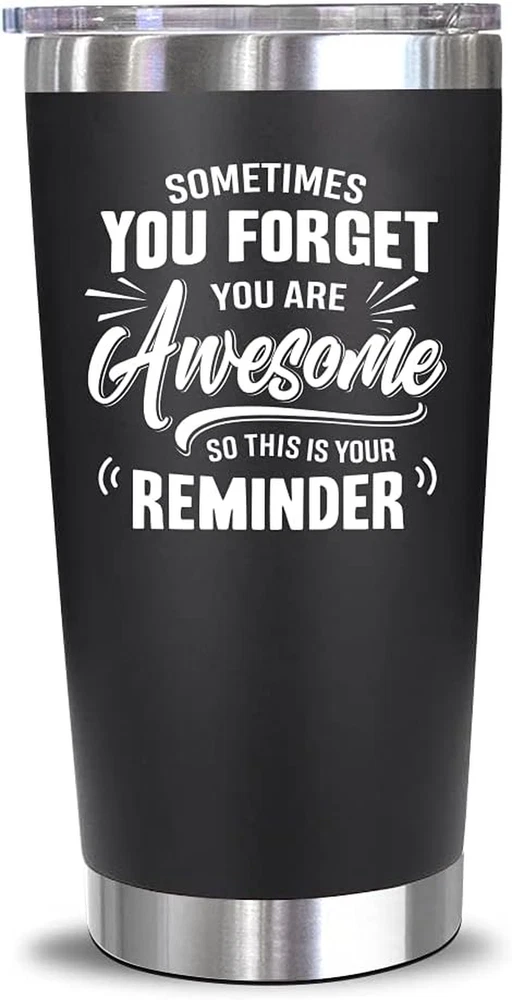 AN INSPIRING GIFT FOR LOVED ONES - Give your partner, family, friends, and workmates a little self-confidence boost with this tumbler. Don't forget to gift one to yourself as well. Why? Because you're awesome! A GIFT FOR ANY OCCASION - This cool tumbler for women is a thoughtful gift for any celebration. Hand it out during birthdays, Christmas, Thanksgiving, or any other day of the year! DOUBLE WALL VACUUM INSULATION – We use double-wall insulation to help retain hot and cold liquid temperatures, which makes our wine tumbler also great for water, coffee, cola, beer, juice, tea, ice cream, cocktails and more BPA FREE AND DURABLE – These tumblers come with BPA-free, convenient drink lid. Crafted with 18/8 food grade stainless steel these tumblers are durable, unbreakable, sweat proof, rust resistant and perfect for backyard barbecues, hanging out at the pool, or enjoying a hot day at the beach with friends. THANK YOU GIFTS, INSPIRATIONAL GIFTS FOR MEN WOMEN – Let your mom, coworker, friends, her enjoy them favorite drinks no matter where they are with this stainless steel tumbler. Sturdy and leak-proof, it’s great for both outdoor and indoor use. Bring this tumbler with you next time you go to a picnic, hiking adventure, RV tour, beach outing, or fishing trip. Product Description Can't decide on a gift to give a special person in your life? Finding the perfect gift is always a bit tricky, whether for your mom or a friend. You don't want to give just any other item that’ll be forgotten in a closet somewhere; you’re looking for something meaningful and thoughtful. You want to give them an item that will help make their lives a little better every day. If you're looking for a practical and inspiring presentation, then we've got just the thing for you. Show your support for the people you care for with this NewEleven "You're Awesome!" Tumbler! Help your loved ones get through tough days. Printed with a quote that says “Sometimes You Forget You Are Awesome, So This Is Reminder”, this inspirational tumbler will remind family and friends that they are strong and capable every time they take a sip. Even if you're not there for them physically, this tumbler can do the talking for you. Made from strong and durable stainless steel, this tumbler stands well against regular wear and tear. It won't easily get damaged or break, and the lid is leakproof. It's a long-lasting gift that will serve your recipient well for years. Consider this water bottle as a gift of health. Giving it to loved ones is a good way of reminding them to get their required daily water intake. It's a great item that will keep them hydrated and motivated at the same time. Birthday Gifts For Men Inspirational Gifts For Men Appreciation Gifts for Men More reasons to live this celebratory tumbler: Double-wall vacuum insulated interior Thank You Gifts, Inspirational Gifts For Women, Birthday Gifts For Women BPA-free lid with leak-proof slider Use it indoors or outdoors Let your loved ones know you care with an inspiring and useful present. Add the NewEleven "You're Awesome!" Tumbler to your cart TODAY!