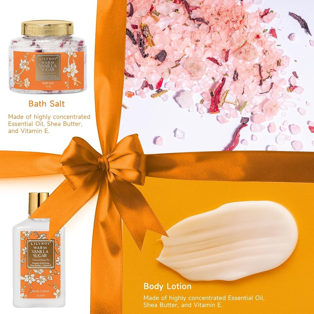 Christmas Gifts for Women - 7 Pcs Vanilla Bath and Body Gift Basket Set Spa Gift Basket Set for Women with Bath Bomb | Perfect Valentine's, Birthday, Mothers Day for Mom, Gift Set for Her All Occasion Description Features: 7 PCS SPA GIFT SET: Shower Gel, Body Lotion, Bubble Bath, Bath Salt, Bath Sponge, Bath Bomb packaged in a nice beautiful luxury Basket. The spa gift sets for women offer the most luxurious and perfect bath experience PERFECT HOLIDAY GIFT SET FOR WOMEN: Leave the ordinary behind when you lavish yourself on the soft, feminine fragrance of fresh Vanilla, and make you feel tropical like a holiday. The scent smells fresh BATH AND BODY GIFT SET: Great gift baskets for women on Valentine's Day, Mother's Day, Father's Day, Anniversary, Birthday, Christmas. The recipient will like it GOOD INGREDIENTS: Lily Roy's bath gift set for women contains premium quality and Mit-Free, Paraben-Free, and Cruelty-Free Essentials that are rich in Shea Butter and Lavender Essential Oil to help moisturize and soothe the skin COMES WITH A REUSABLE BASKET: Its upscale and beautiful basket makes a multi-purpose storage solution to keep your beauty essentials. It also creates a unique decoration for your bathroom, vanity table, powder area, and more. It also has a gift note card for you to personalize it Product Details: Scent: Warm Vanilla Sugar 2 Brand: LILY ROY Product Benefits: Brightening, Cleansing, Moisturizing, Nourishing, Smoothing, Soothing Skin Type: All Special Ingredients: Essential Oil, Shea Butter, Vitamin E Handling We will ship all orders within 1 business day of payment. Delivery We Do Not Ship Outside of the Continental US. Return Policy All items qualify for returns within 30 days of receipt. Buyer is responsible for return shipping on any item that is not damaged. Feedback We take our reputation seriously, we buy and sell online, so we understand the value of trust. If you are unsatisfied with your order, please contact us and we will work with you to resolve it to your satisfaction.