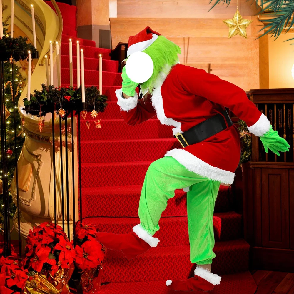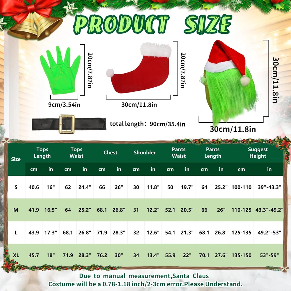 Description Big Monster Costume Boys 7PCS Christmas Monster Outfits. Christmas Monster Costume for Includes: 1* Green Giant Monster full head +1*Red fur edging hat+1* Top+1* Green gloves+1* Green pants+1*Buckle belt+1*Red velvet socks, including everything your need Christmas Cosplay Costume Material: Christmas Green Giant Monster costume for is made of polyester faux fur and soft velour, friendly and comfortable for your , green is latex and designed with eye holes, breathable and easy to put on Easy To Put On: Christmas monster costume for top with velcro design easy to put on and take off, green pants with elastic waistband fit more waist sizes, buckle belt make the whole outfit stand out Size Information: Christmas Costume for and boys has 4 sizes, Small, Medium, Large, X-Large, please refer to our size chart to find the best size for your The Christmas Best Gift: Classic Christmas Green Giant Monster costume makes your become the focus on Christmas, Christmas cosplay costume is perfect for a Christmas party, birthday party, stage, fancy dress, or more