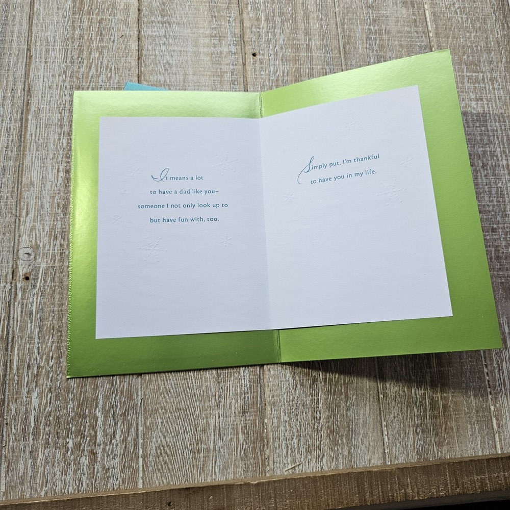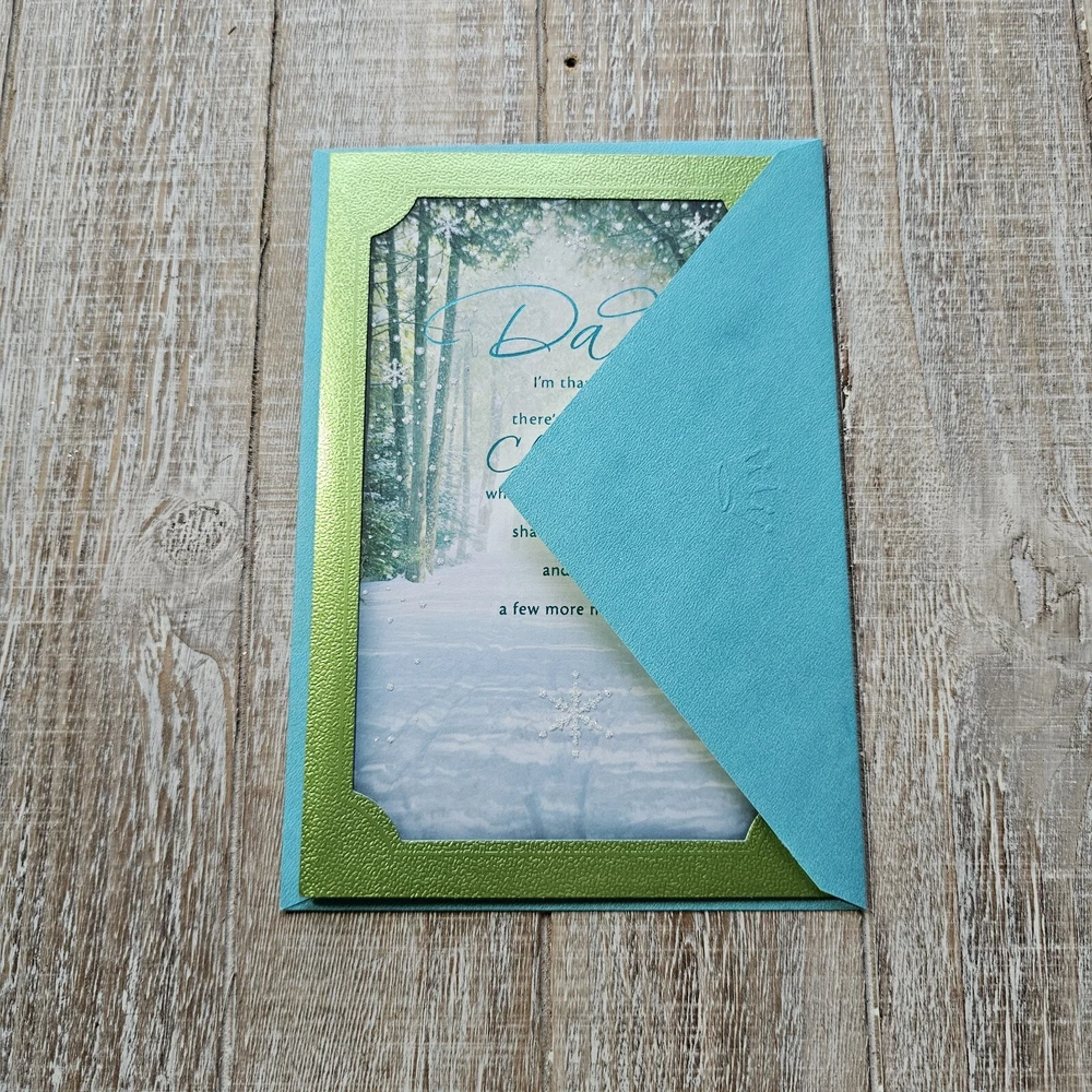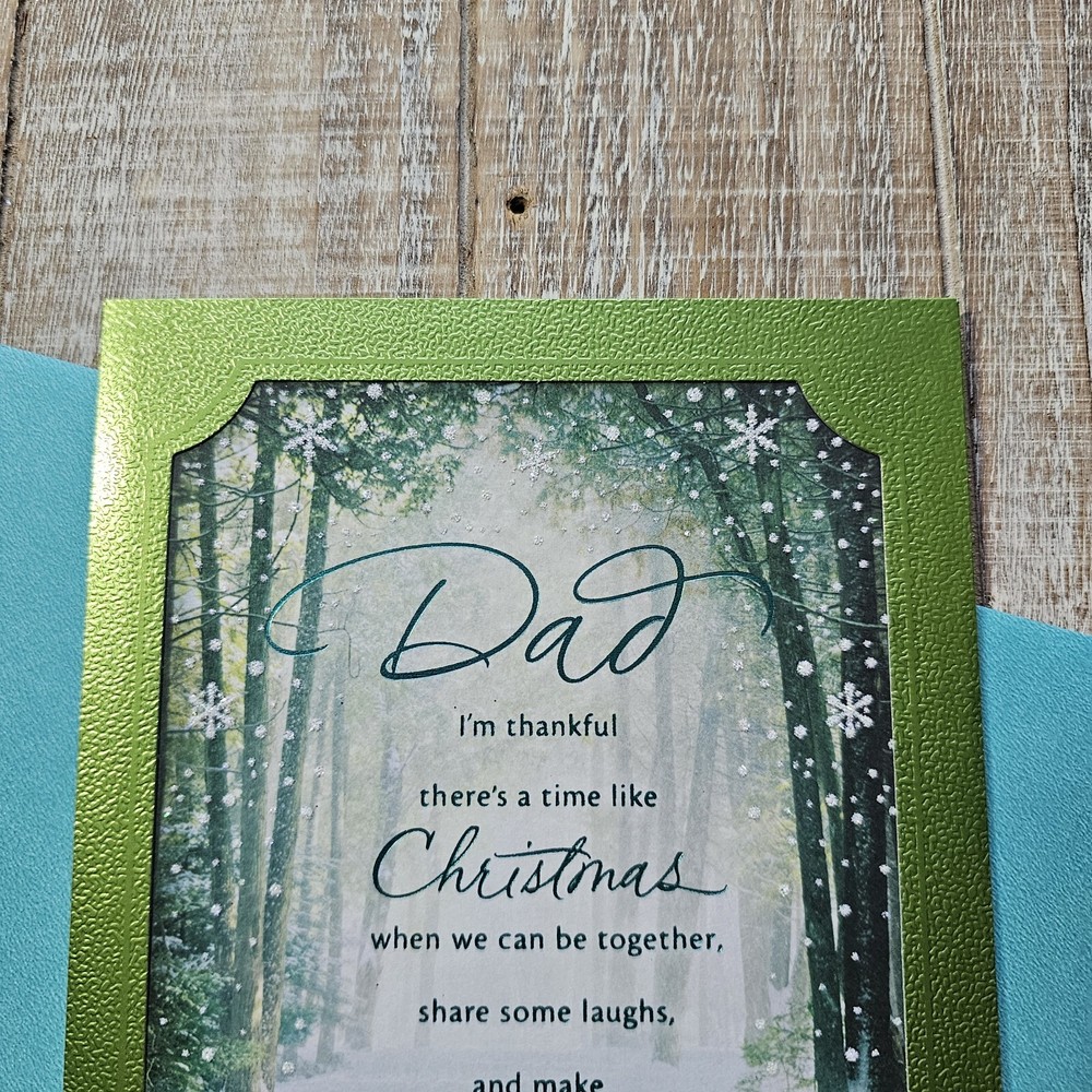Hallmark Christmas Greeting Card For Dad Green Blue Metallic Snow Glitter Full Size 5.5 x 8 inch card This listing is for a single card and matching envelope in new condition. Click here to add a personalized label to the inside of your card. Search thousands of cards for all occasions in our eBay Store . Our cards ship with limited tracking via USPS First Class. Standard delivery time is 5-7 days but may take up to 10 days.